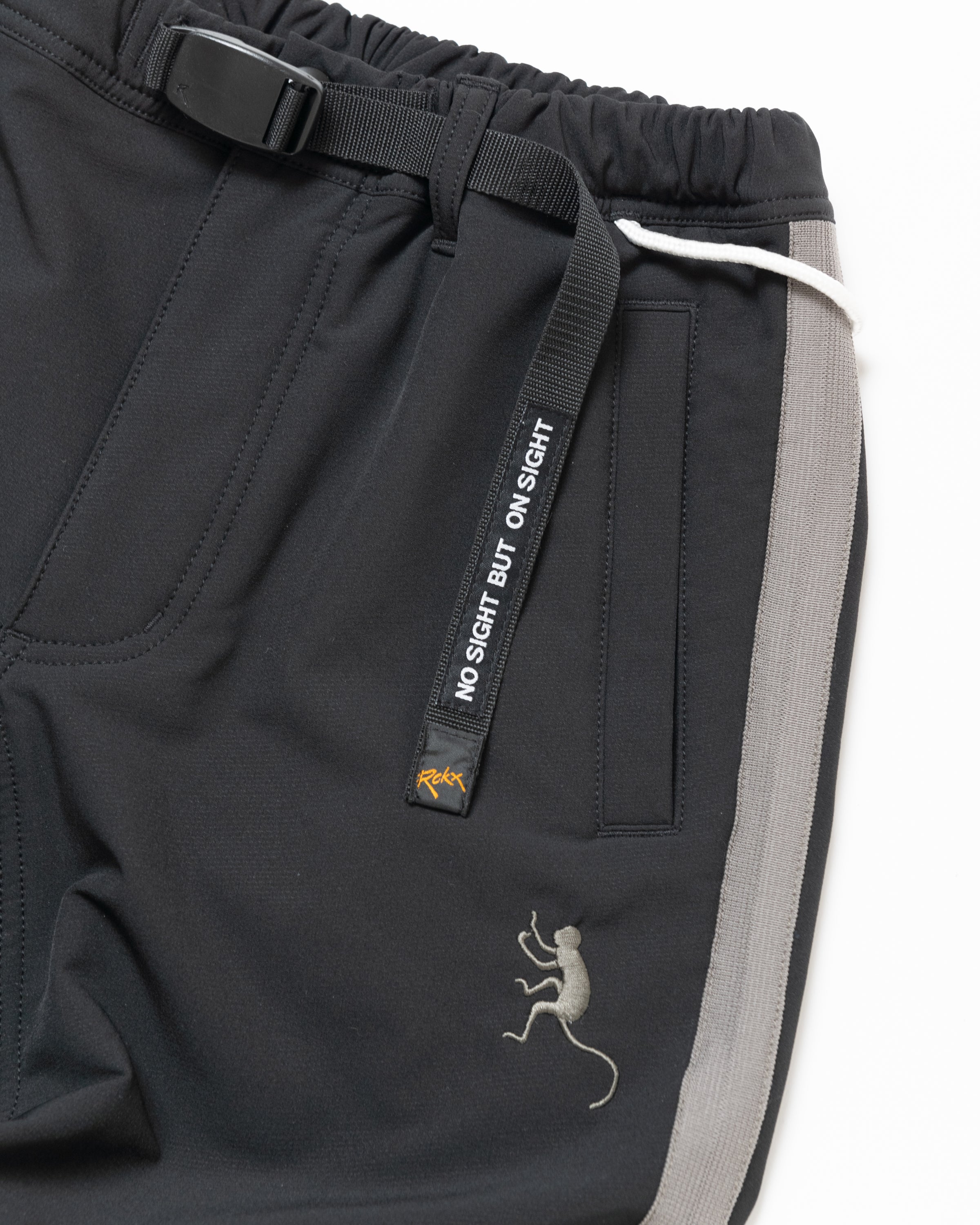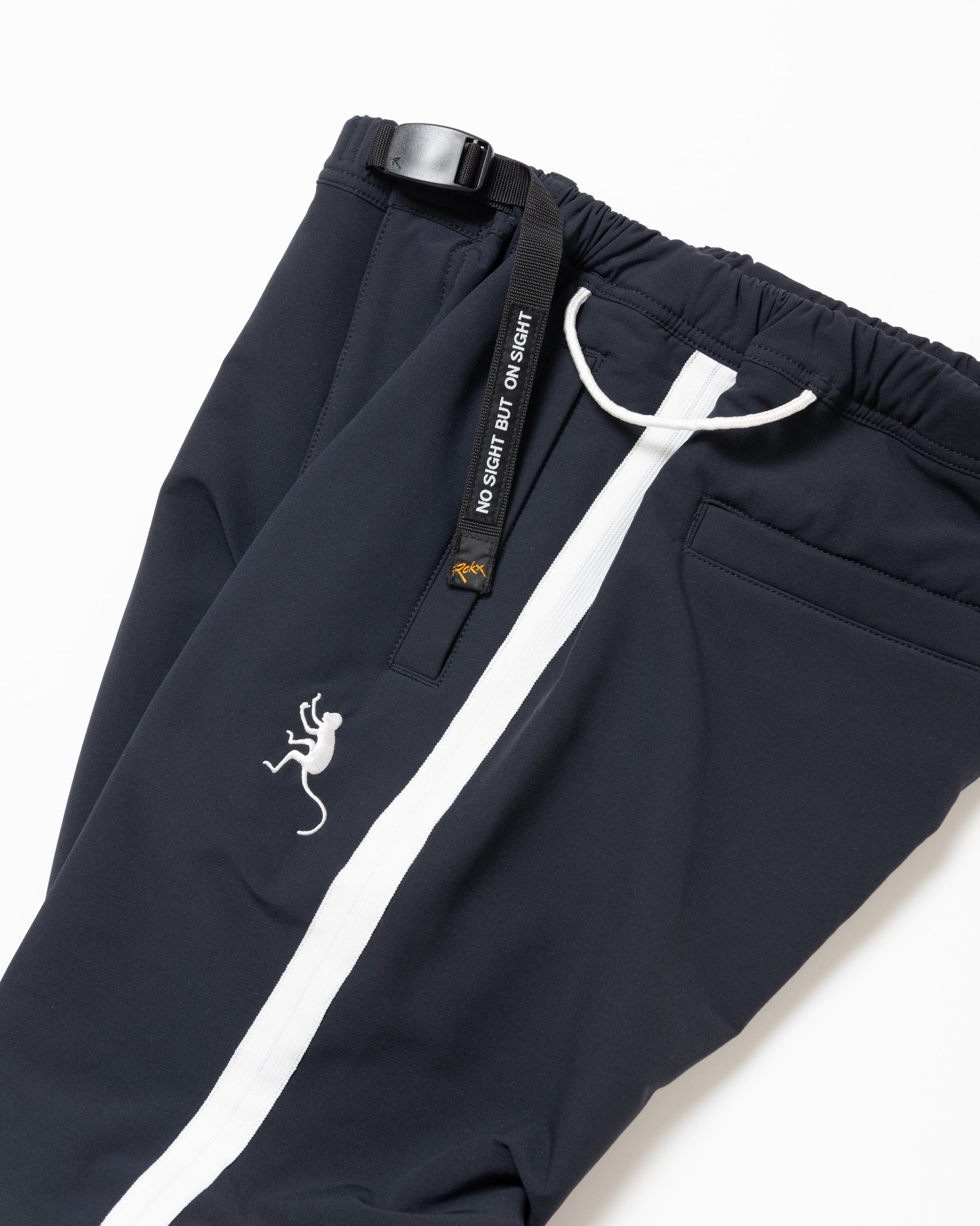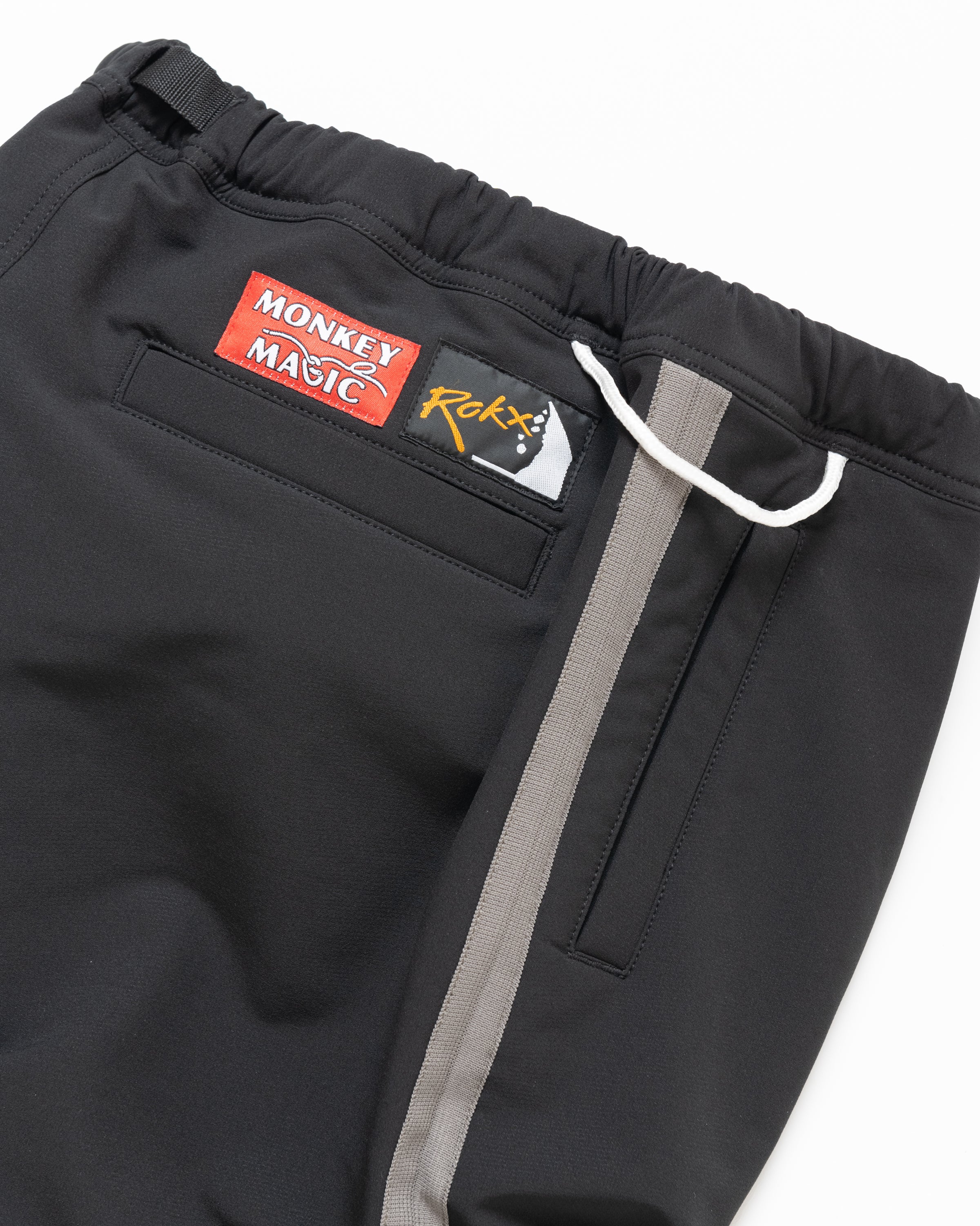 左太もも部分にはモンキーマジックロゴを刺繍、バックポケットにはROKXとモンキーマジックの両ロゴを縫い付け。ベルトにはモンキーマジックのタグライン「No Sight But On Sight! (見えなくても、一回で登り切れる!)」を印字。