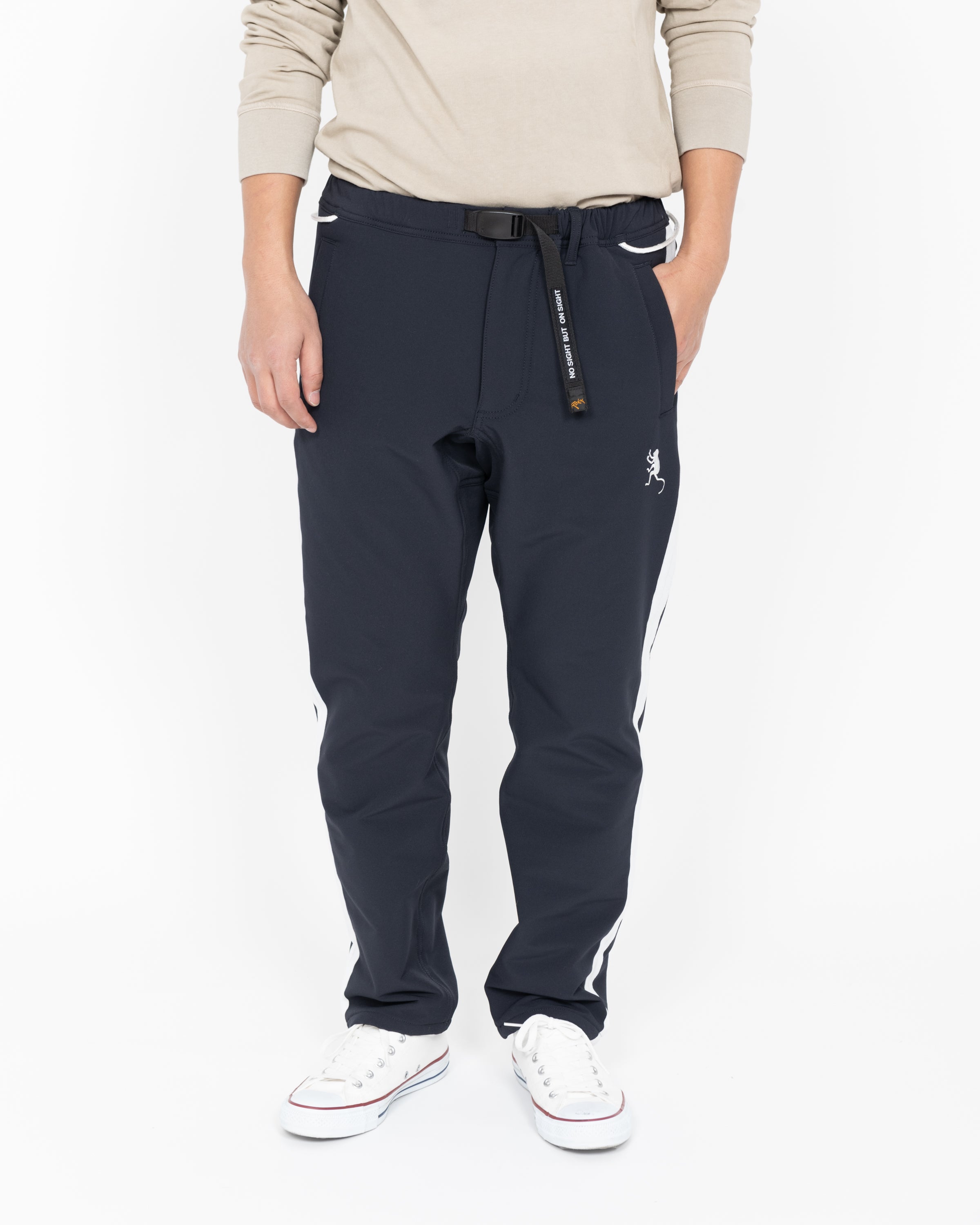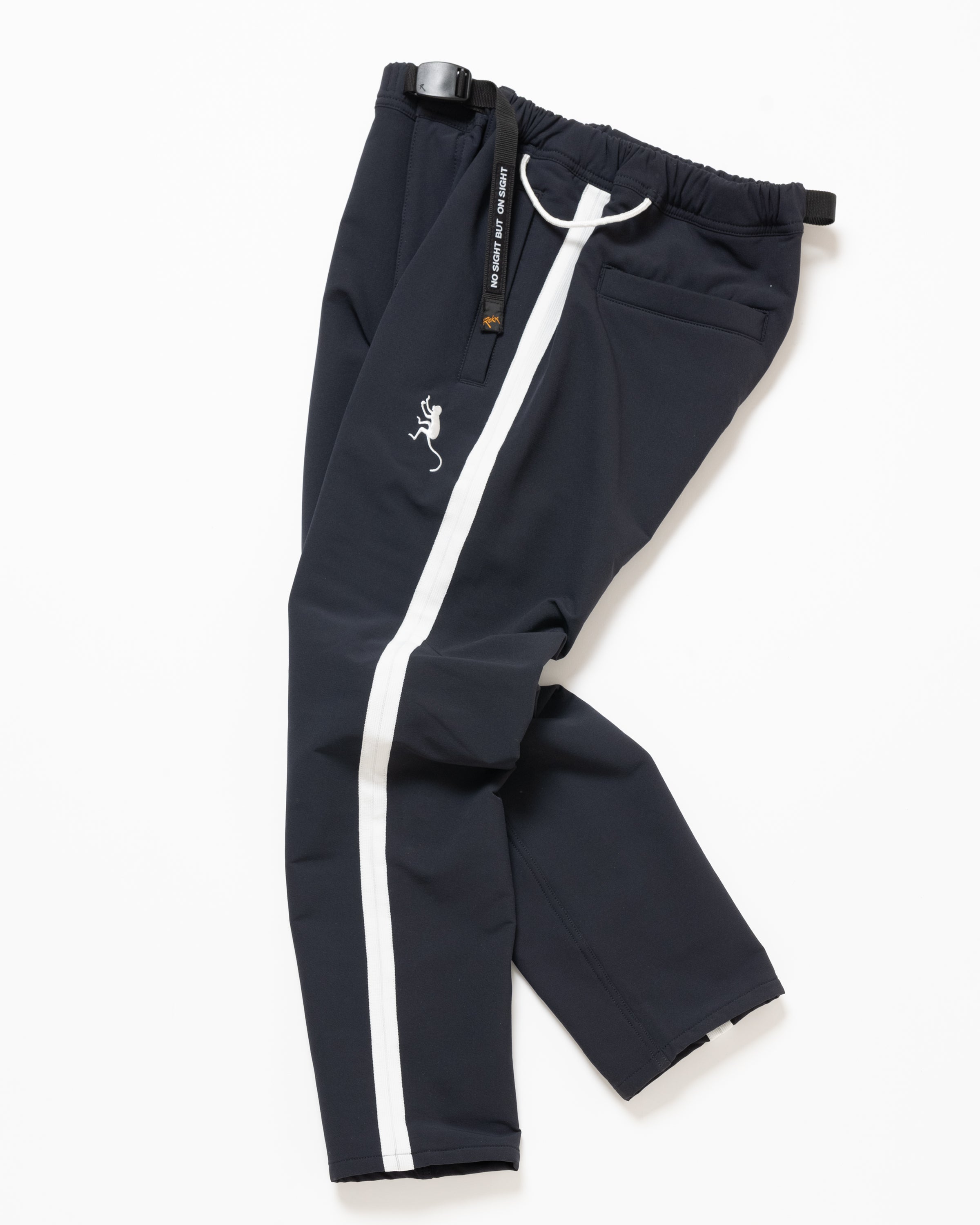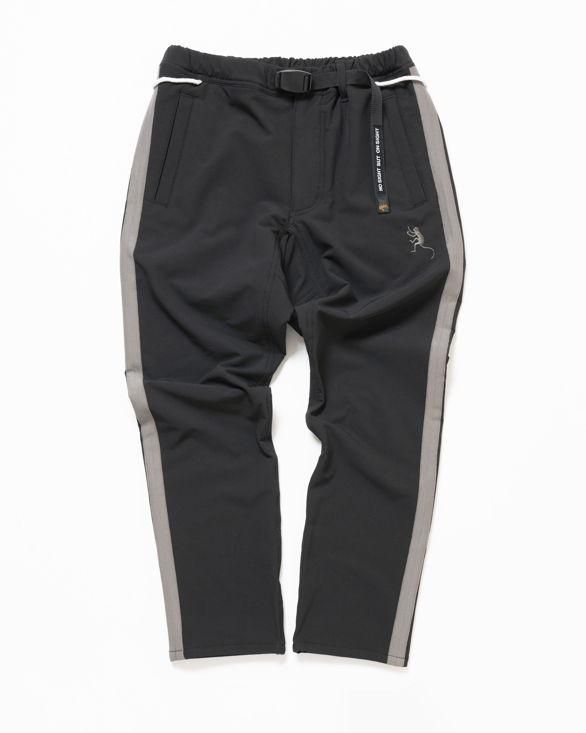 左太もも部分にはモンキーマジックロゴを刺繍、バックポケットにはROKXとモンキーマジックの両ロゴを縫い付け。ベルトにはモンキーマジックのタグライン「No Sight But On Sight! (見えなくても、一回で登り切れる!)」を印字。