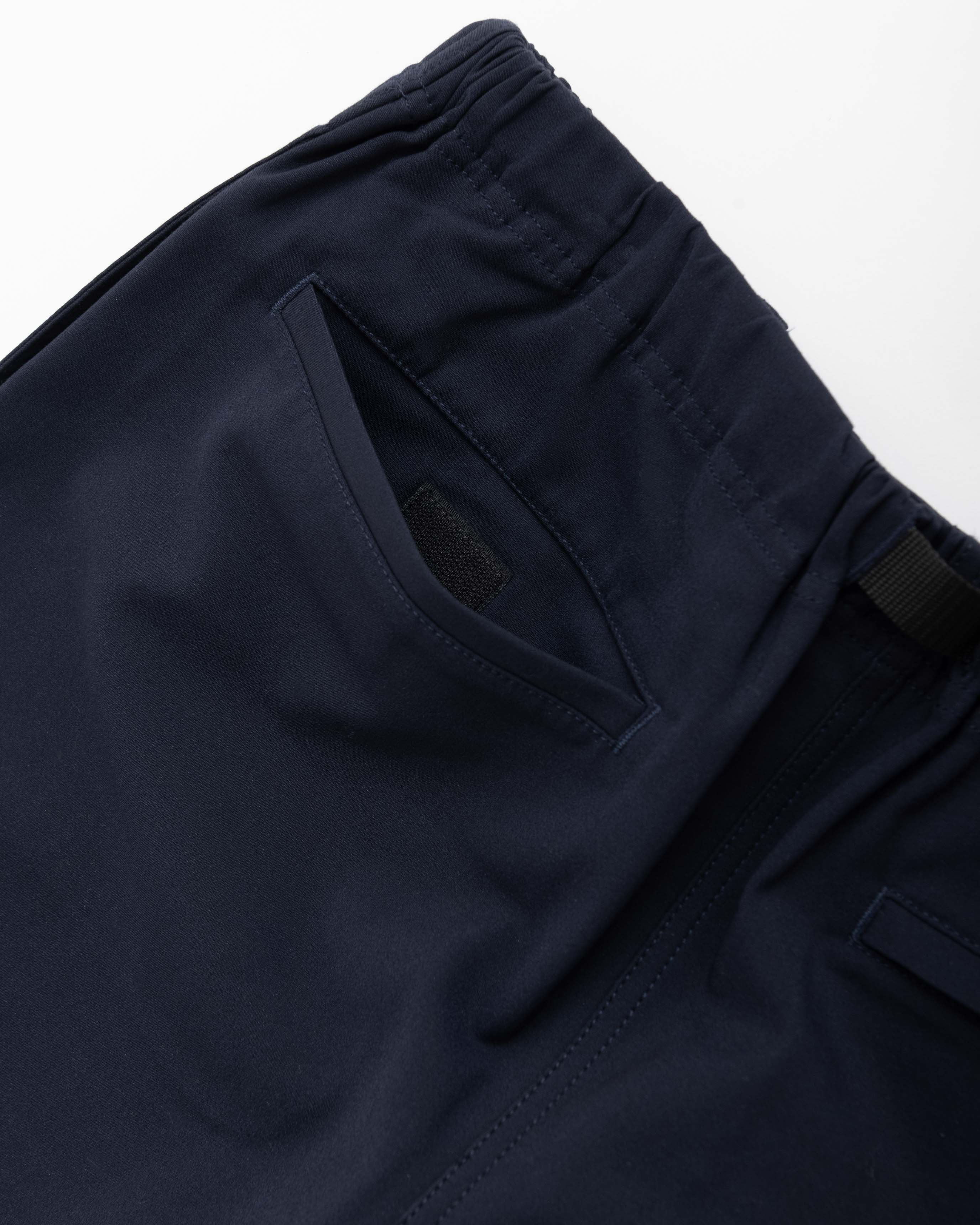 リフレクターにもなっている左腿上部のワンポイントロゴ、ハイカットブーツ対応のジッパー開閉の処理が施された裾、両サイドのポケットとバックポケットなど、ハイキングなどでの使い勝手も抜群。