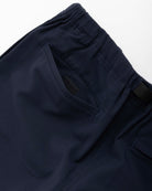 しなやかな肌触りと光沢感のあるコットンに、強度と速乾性に優れたナイロンをミックスした生地はストレッチ性も備えており、裾に向かってテーパードするスリムなシルエットにもかかわらず、窮屈さはなく快適な吐き心地をキープ。