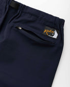 ROKXパンツの特徴である股下のガゼットクロッチやウエストのウェビングベルト、膝の立体裁断などクライミングパンツとしてのベーシックなディテールも健在。