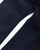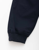 しなやかな肌触りと光沢感のあるコットンに、強度と速乾性に優れたナイロンをミックスした生地はストレッチ性も備えており、裾に向かってテーパードするスリムなシルエットにもかかわらず、窮屈さはなく快適な吐き心地をキープ。