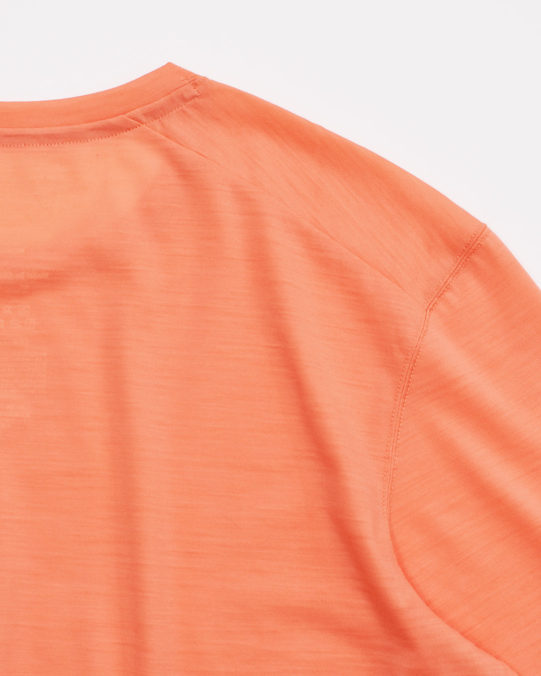 一枚でもスタイリッシュなシルエットはややゆったりめ。着丈は短すぎず、長すぎない絶妙な長さにし、裾のサイドにさりげなくスリットを入れて動きやすくしています。さらに、ザックを背負った時の肌あたりを良くするために、肩線を後ろ側に。山にも街にも、ボーダレスで愛用いただけるデザインです。