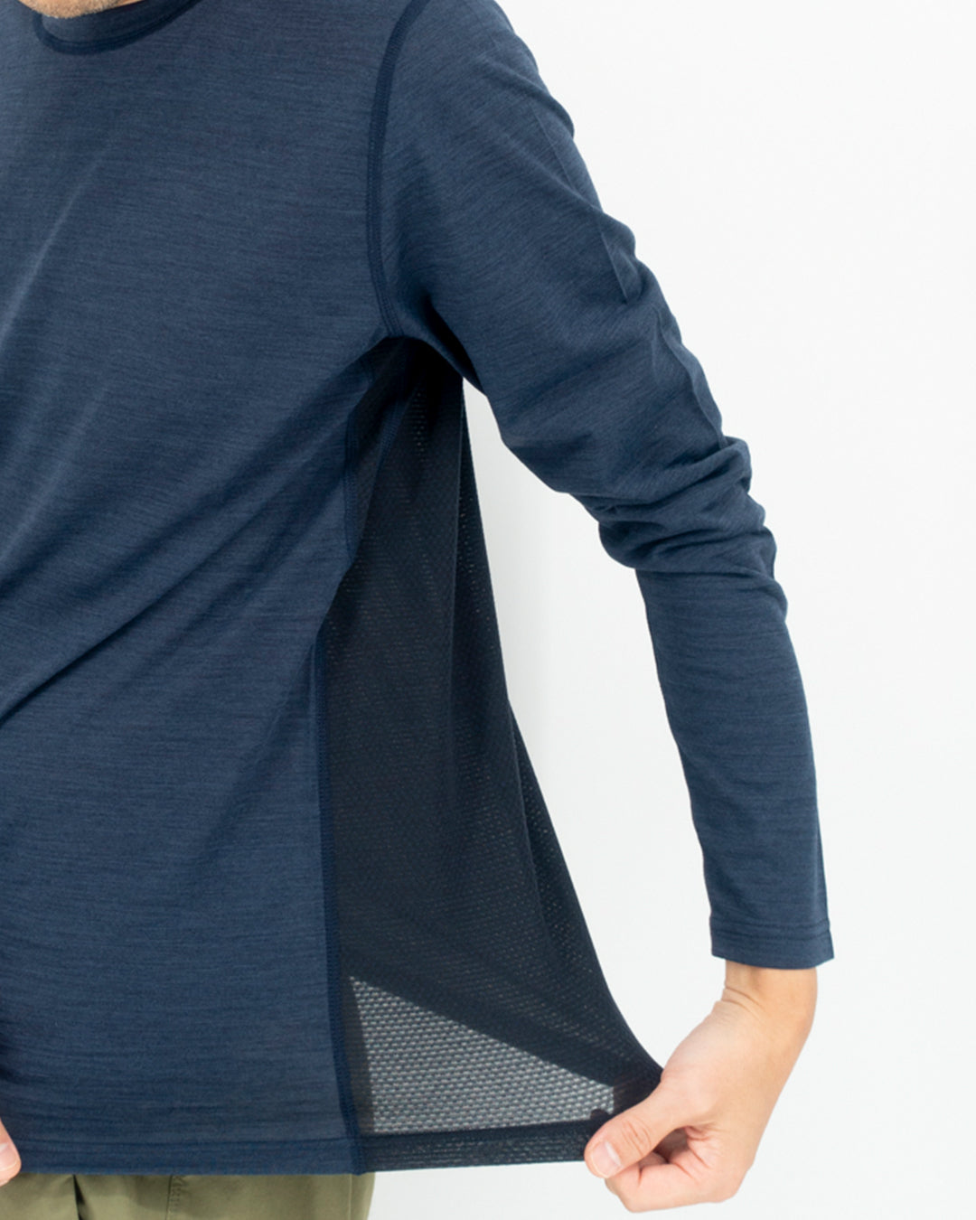 メッシュ部分は着用した際の透け感が極めて低く、男女問わず安心して着用して頂けます。またメッシュ部分にもメリノウールが混紡されているため汗の匂いを抑え、長期縦走登山で快適な着心地を提供します。