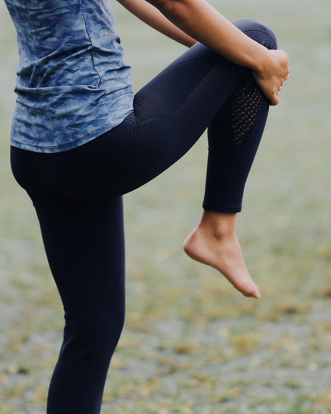 縫製部分を極力少なくし、運動時の縦方向の動きにも追従する為に、経編み機で作製した3D フィットのタイツ。