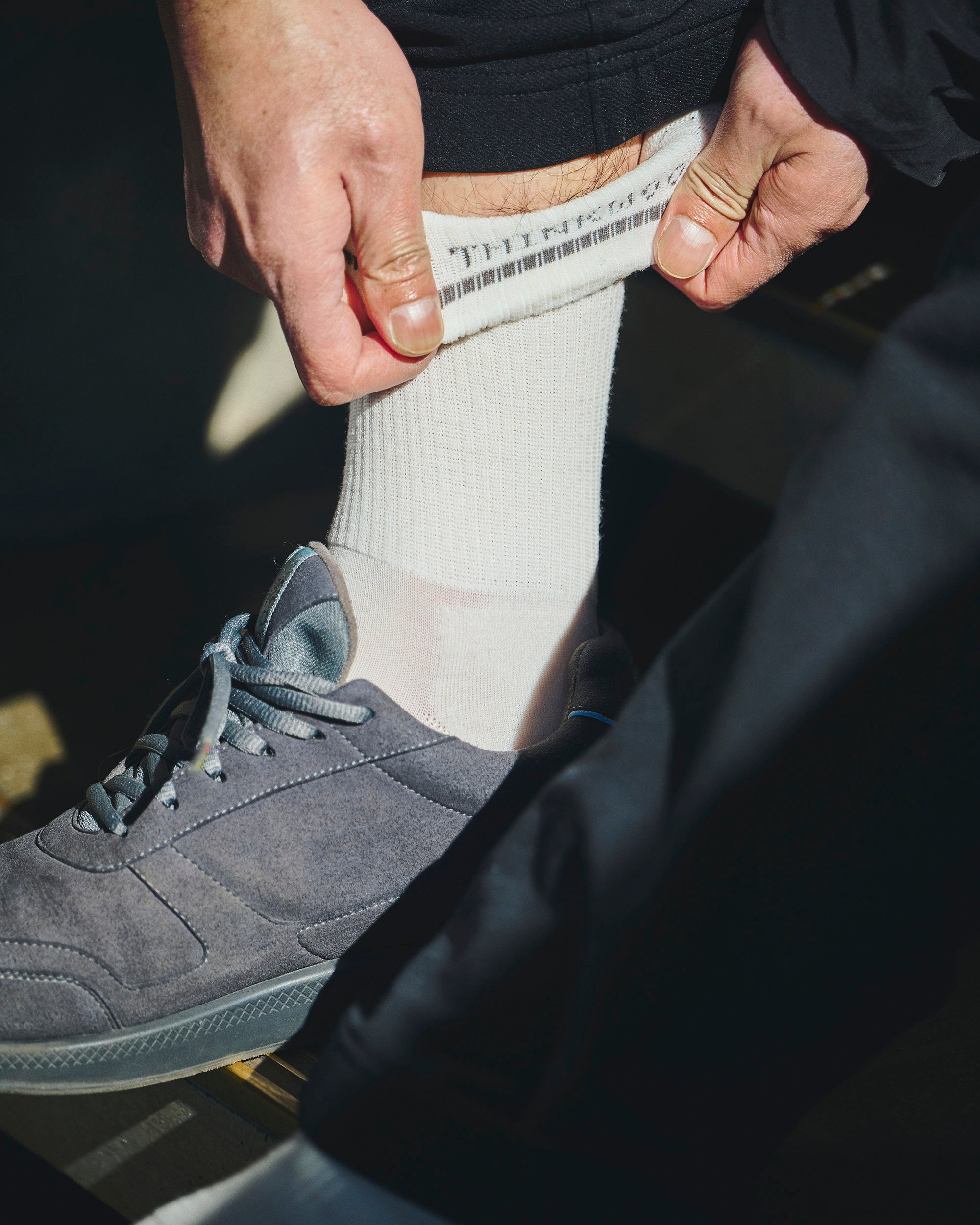 足裏・かかと・つま先にはパイルを配置しクッション性と強度を保ちながら、足の甲は薄手のニットで着用感を必要以上に感じさせないようにしています。リラックスできるソックスを目指したので、あえて足裏と足の甲のリブは配置していません。