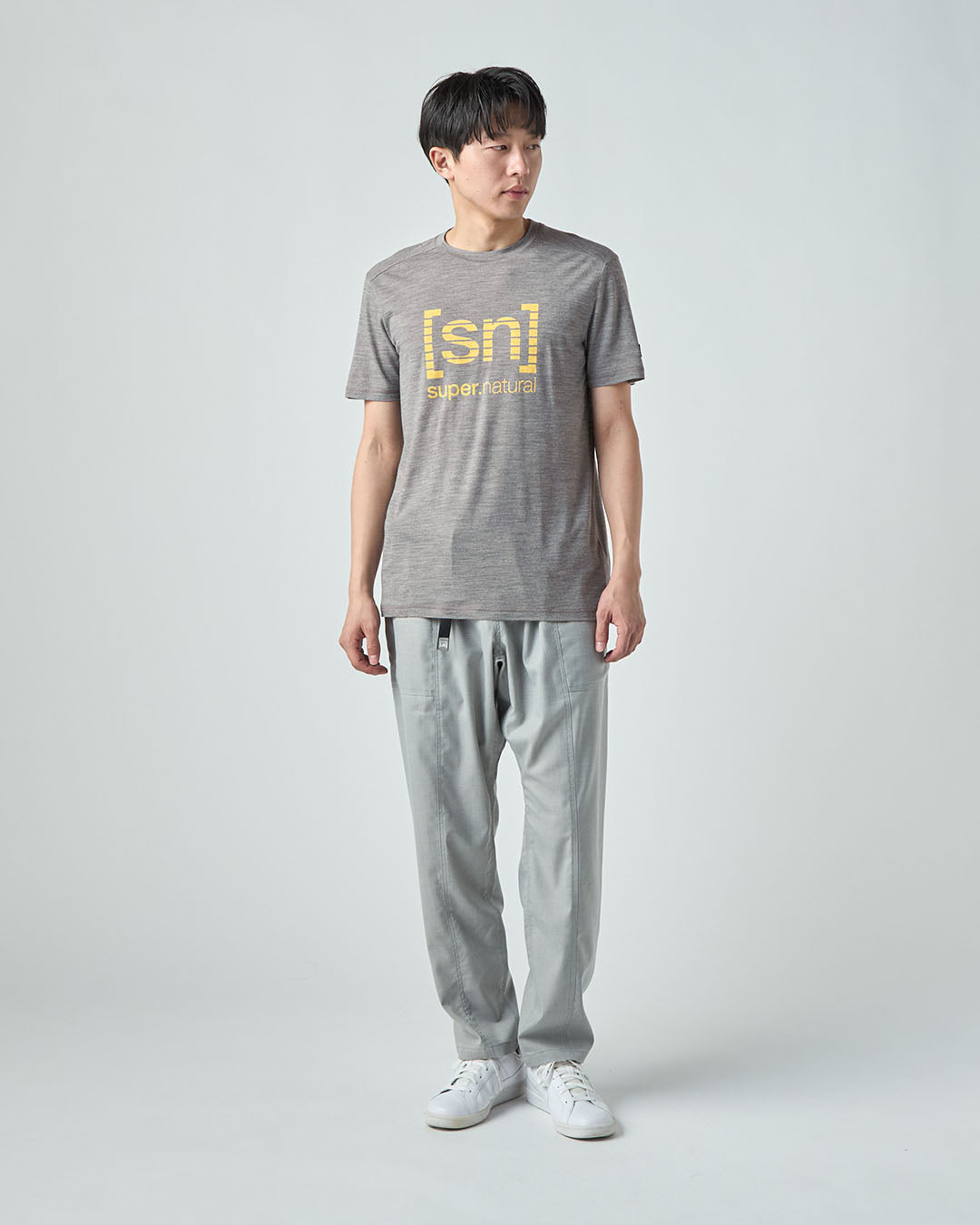 フロントに大きく配された「[sn] super.natural」のロゴグラフィックが目を引く、アイコニックな一着。
