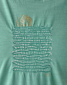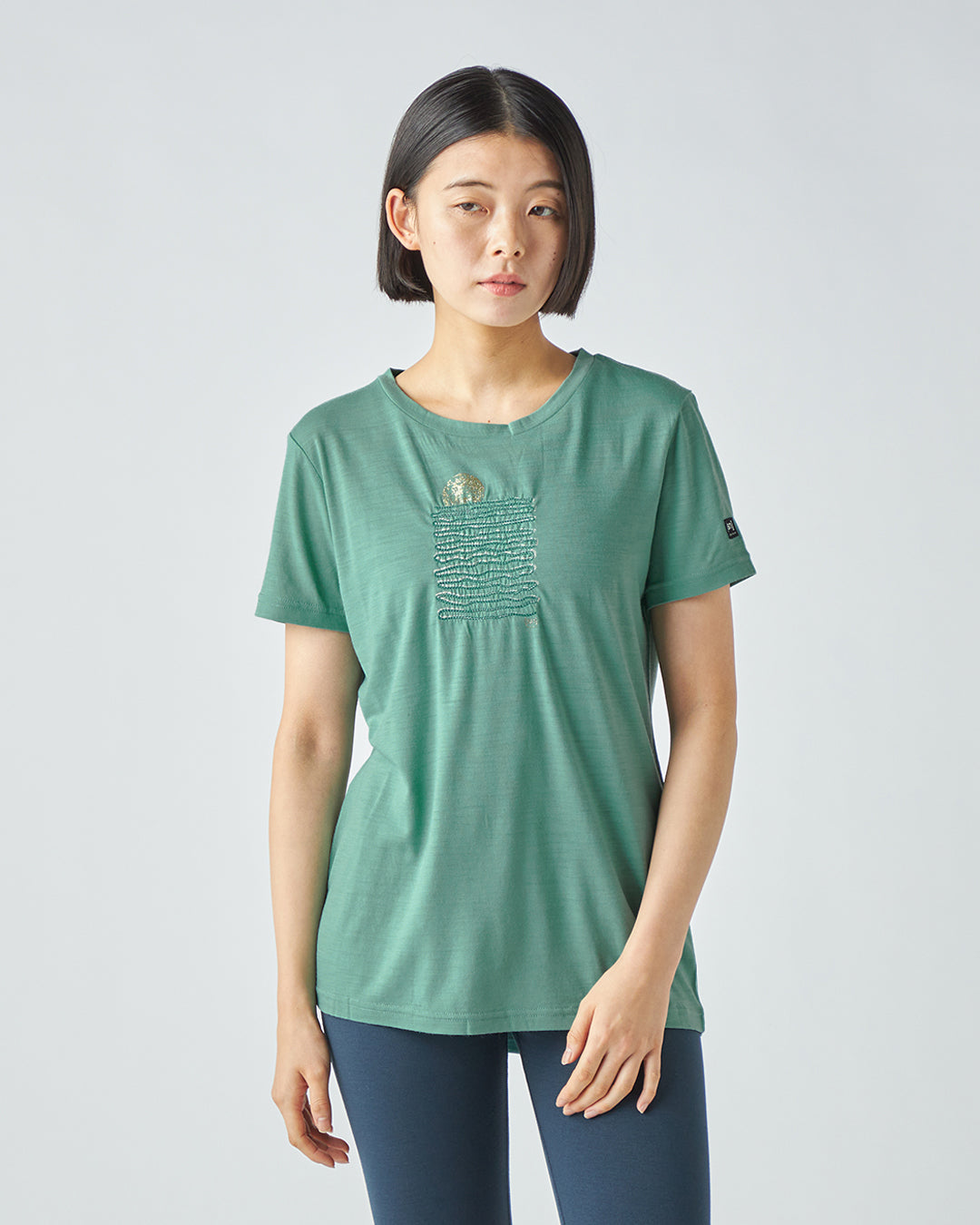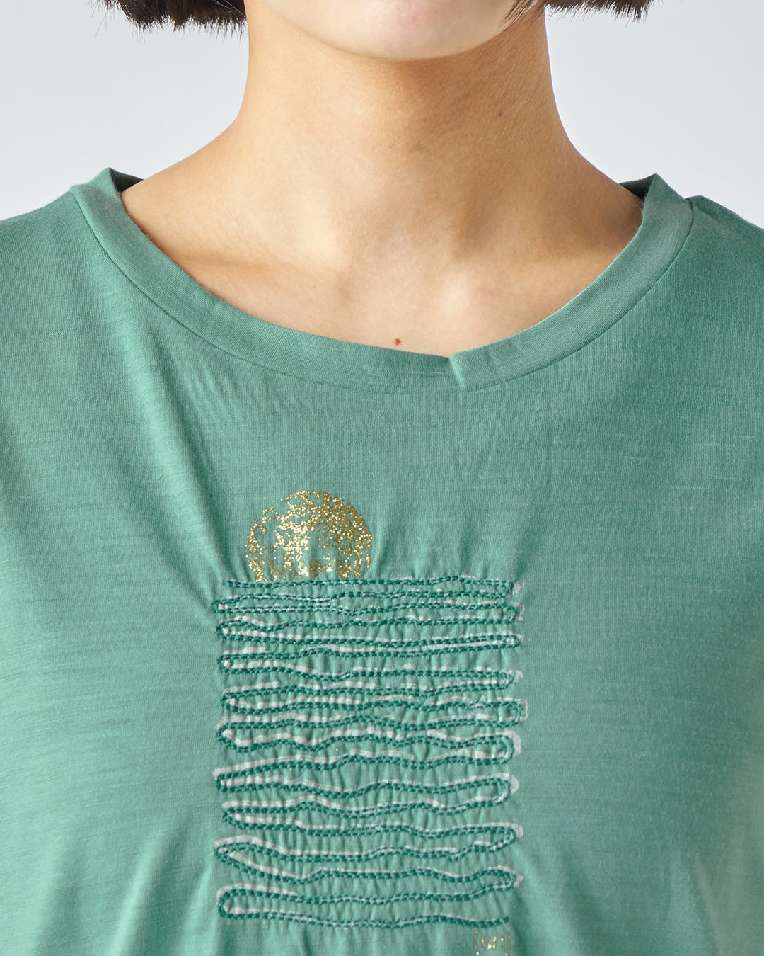 温かみを感じさせる刺繍のラインが、穏やかな波のリズムを表現しており、プリントにはない奥行きと上質な表情を与えています。