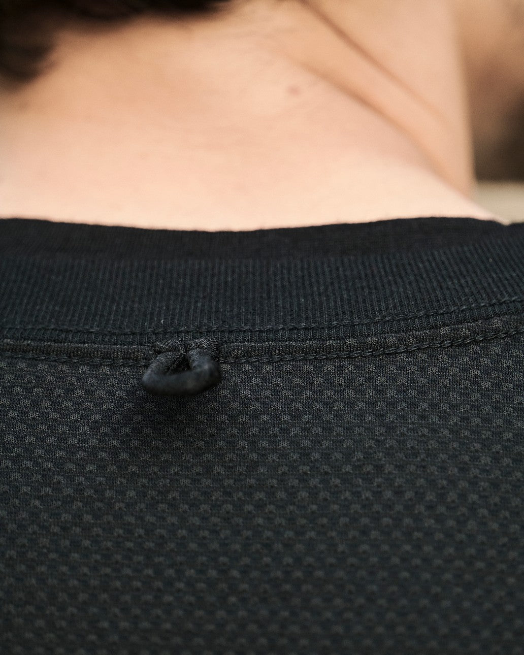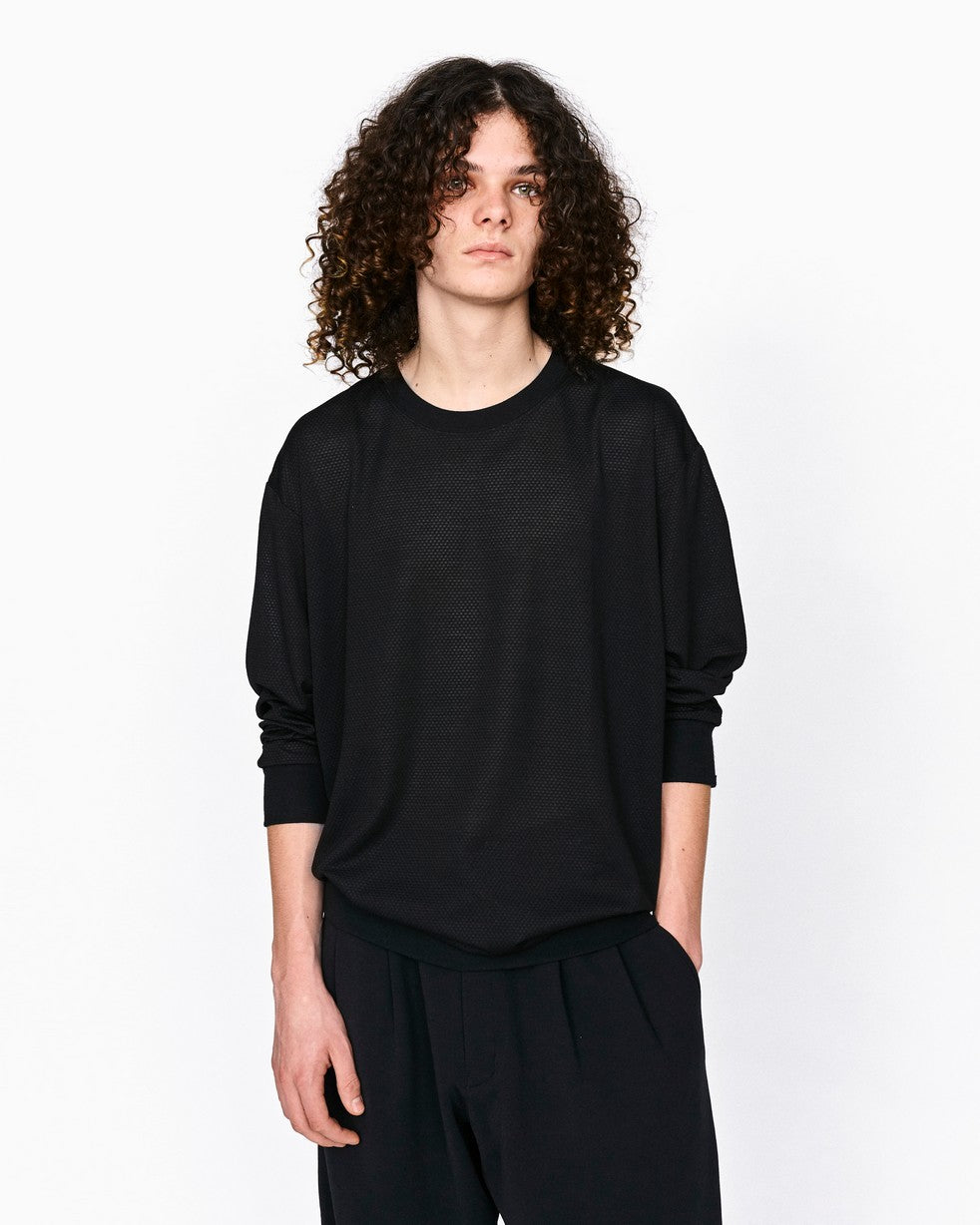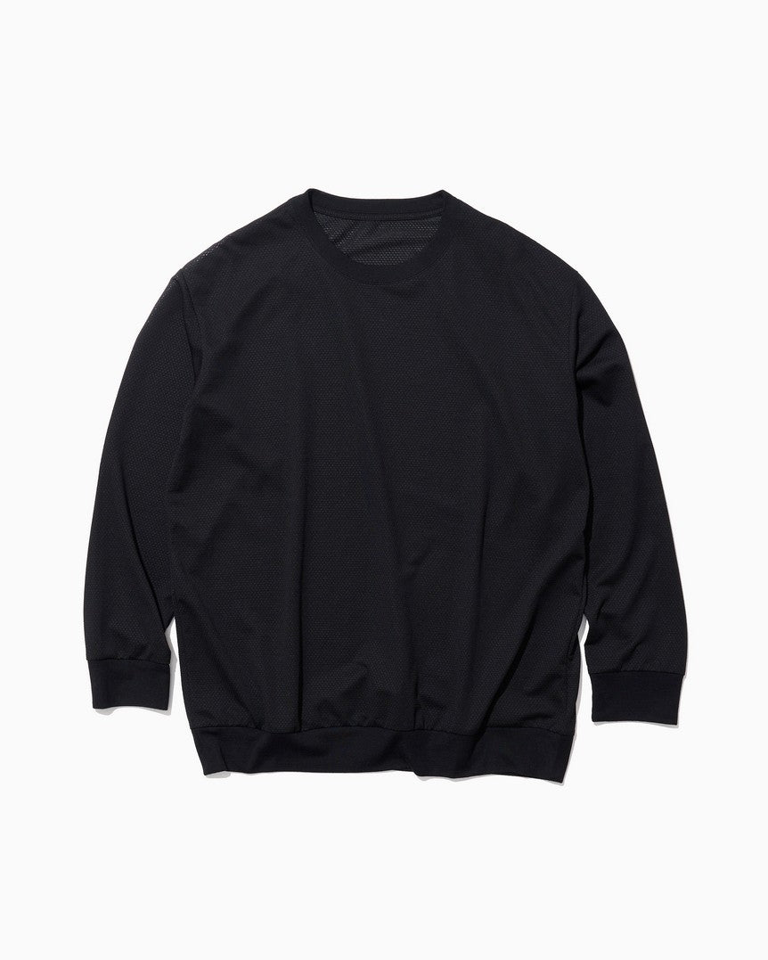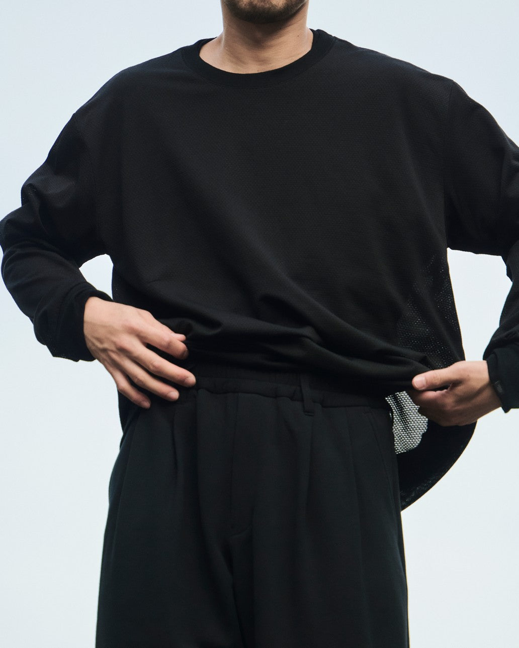 天然繊維のウールと最先端の合成繊維をブレンドしたメッシュファブリックを採用するロングスリーブリブシャツ。