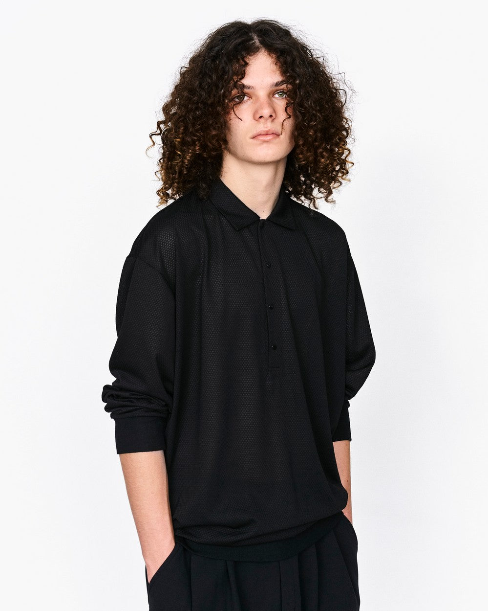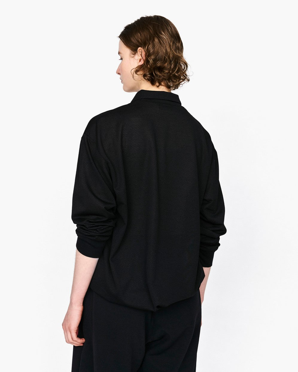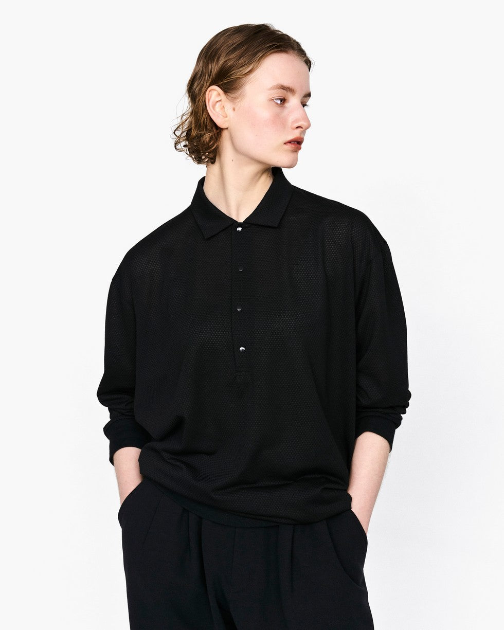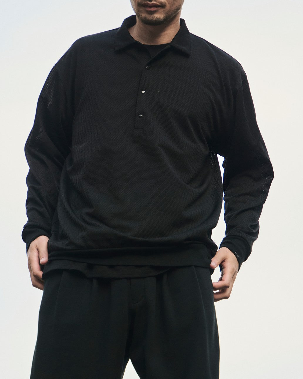 天然繊維のウールと最先端の合成繊維をブレンドしたメッシュファブリックを採用するロングスリーブポロシャツ。