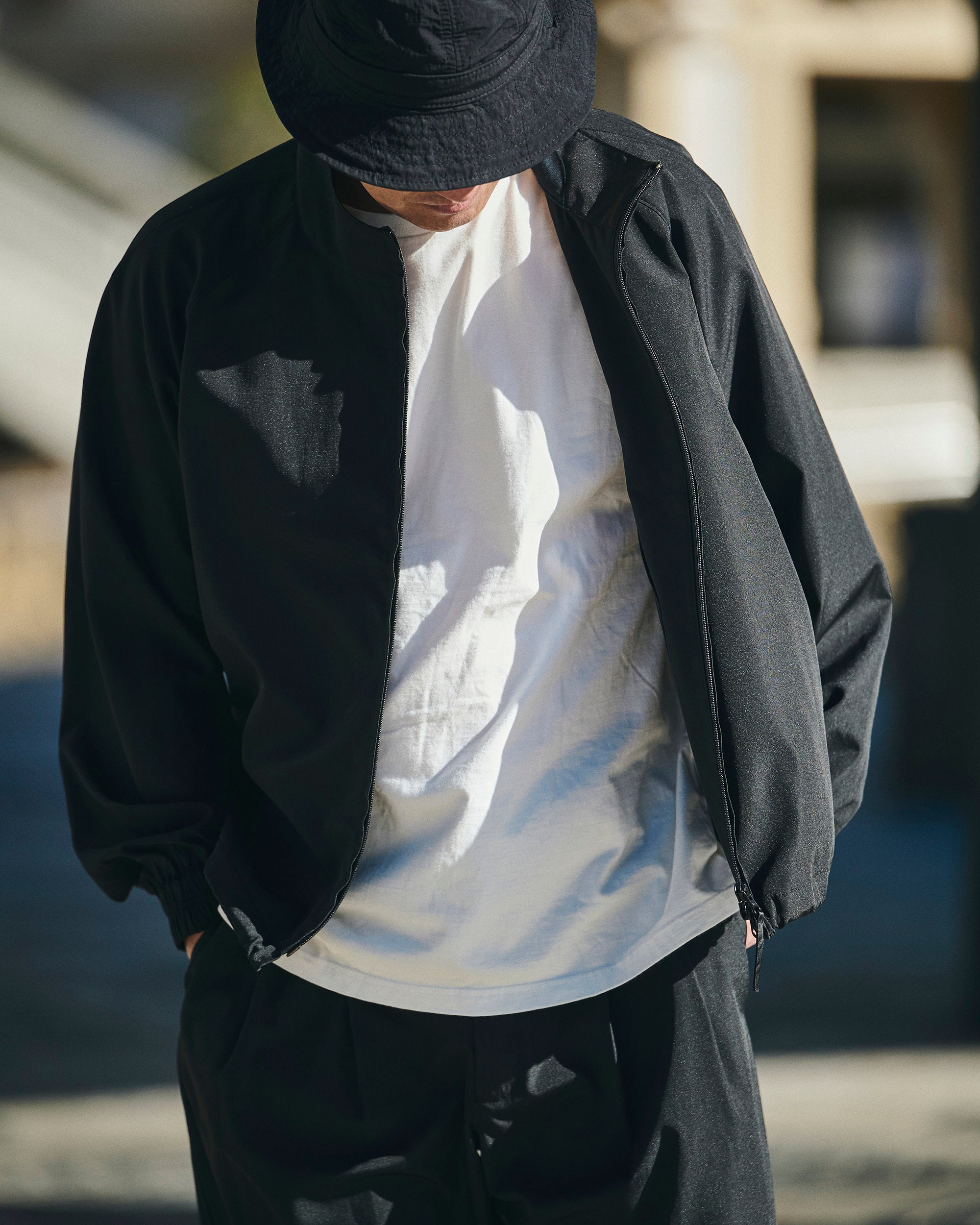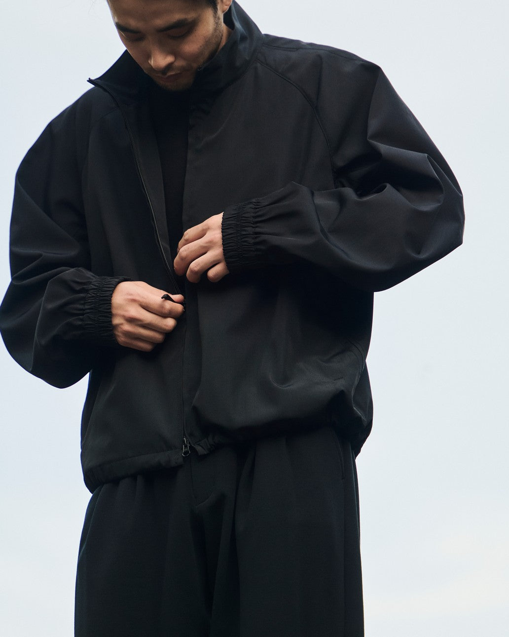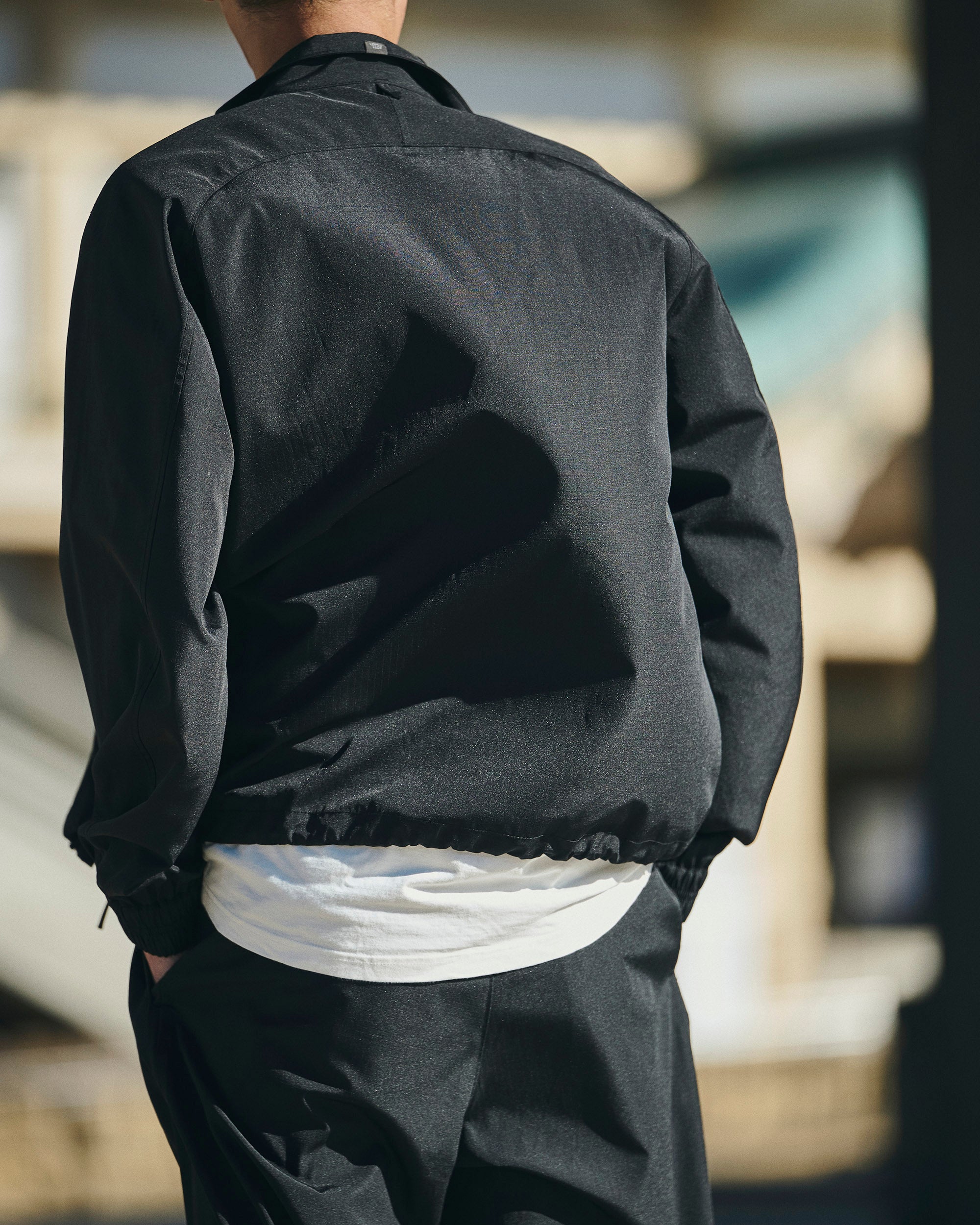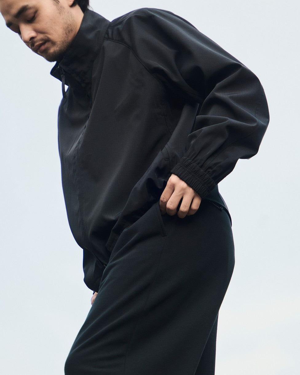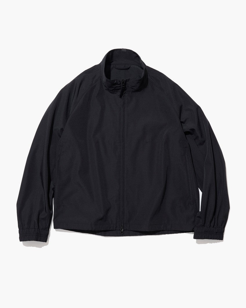 天然繊維のウールと最先端の合成繊維をブレンドしたファブリックを採用するスタンドカラージャケット。