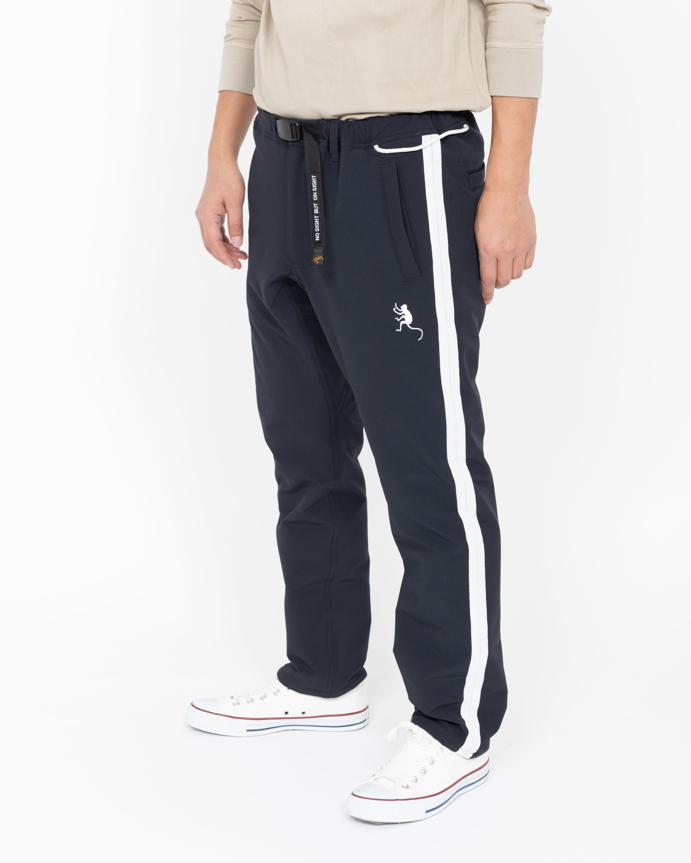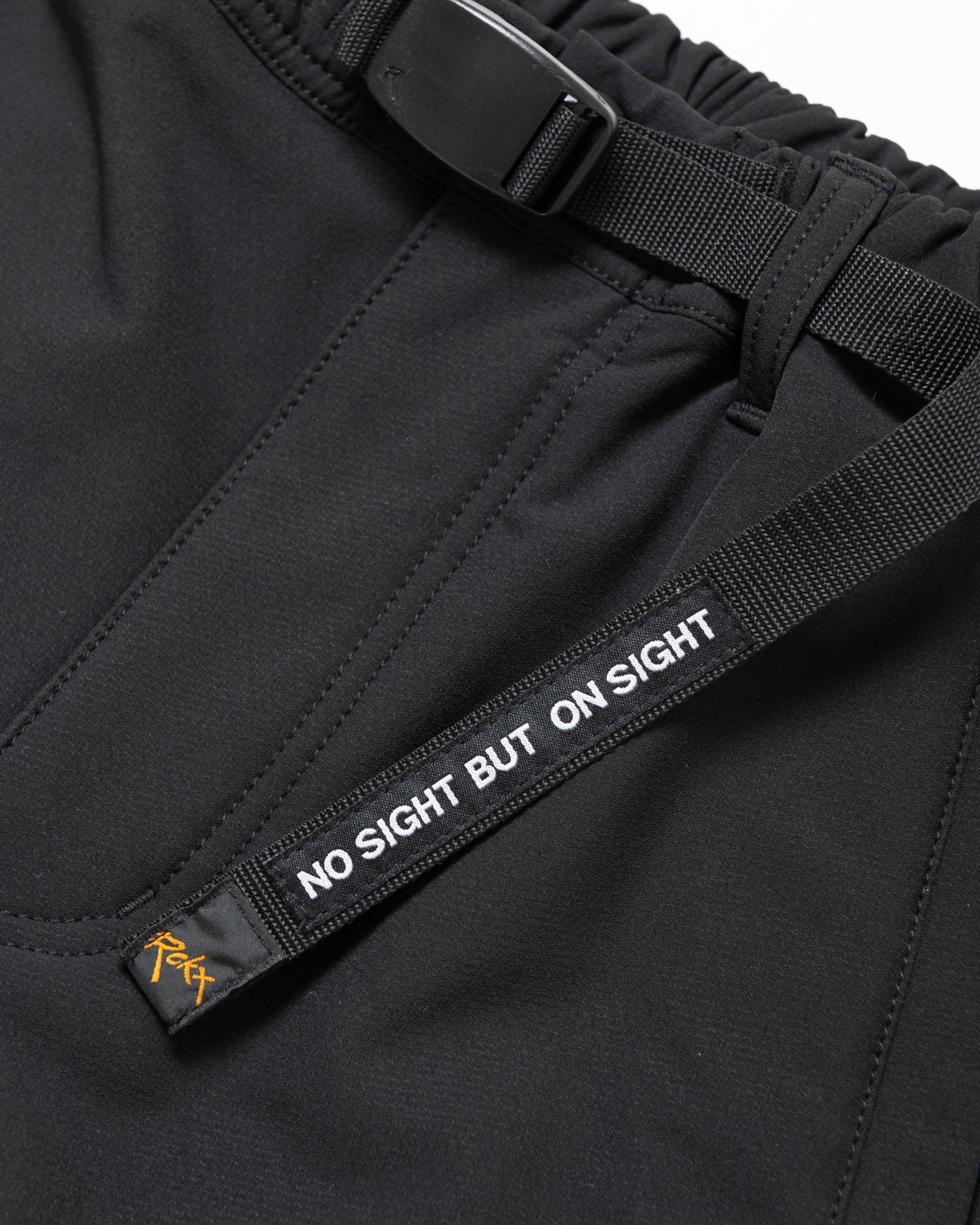 左太もも部分にはモンキーマジックロゴを刺繍、バックポケットにはROKXとモンキーマジックの両ロゴを縫い付け。ベルトにはモンキーマジックのタグライン「No Sight But On Sight! (見えなくても、一回で登り切れる!)」を印字。