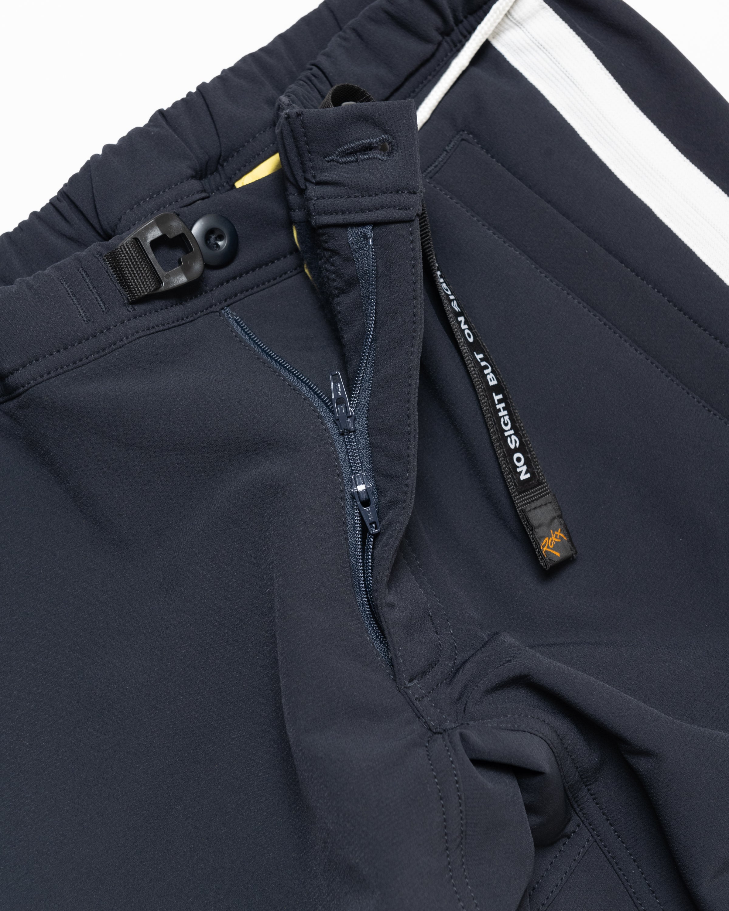 フロントジップは上下から開閉可能なWジップを採用し、やや股下深めに配置。クライミングハーネスやバックパックのウェストベルトを外さなくても下側から操作できます。