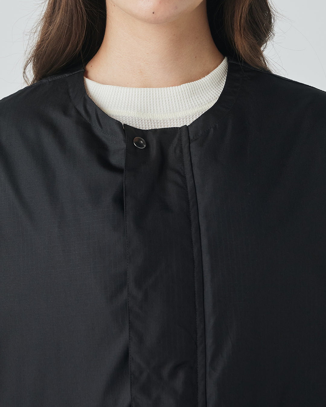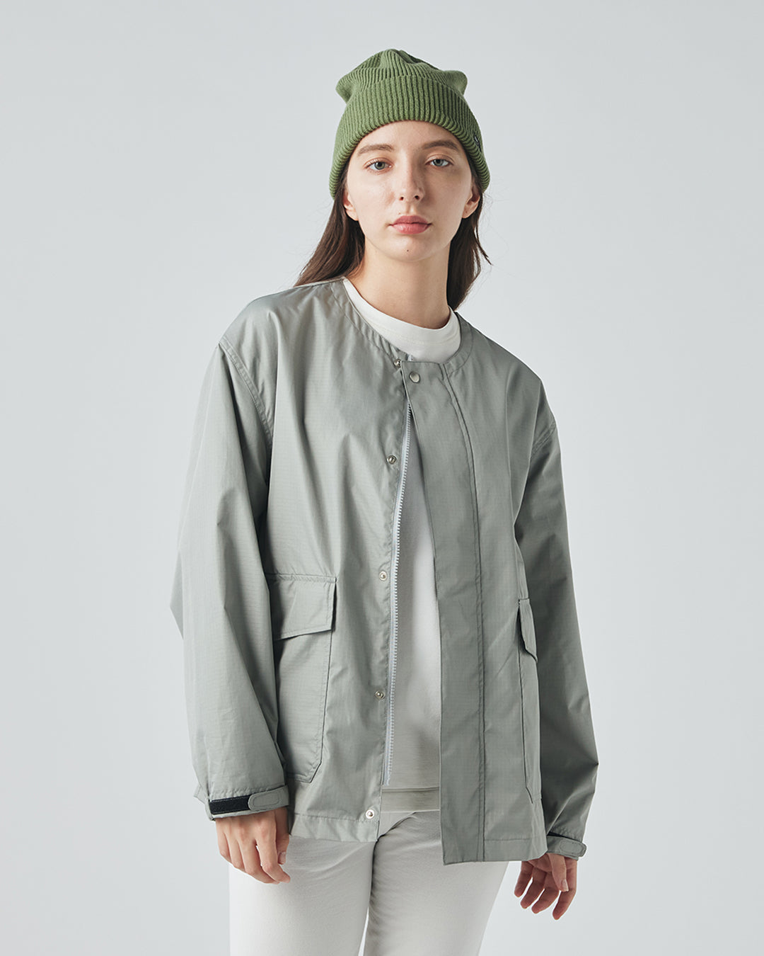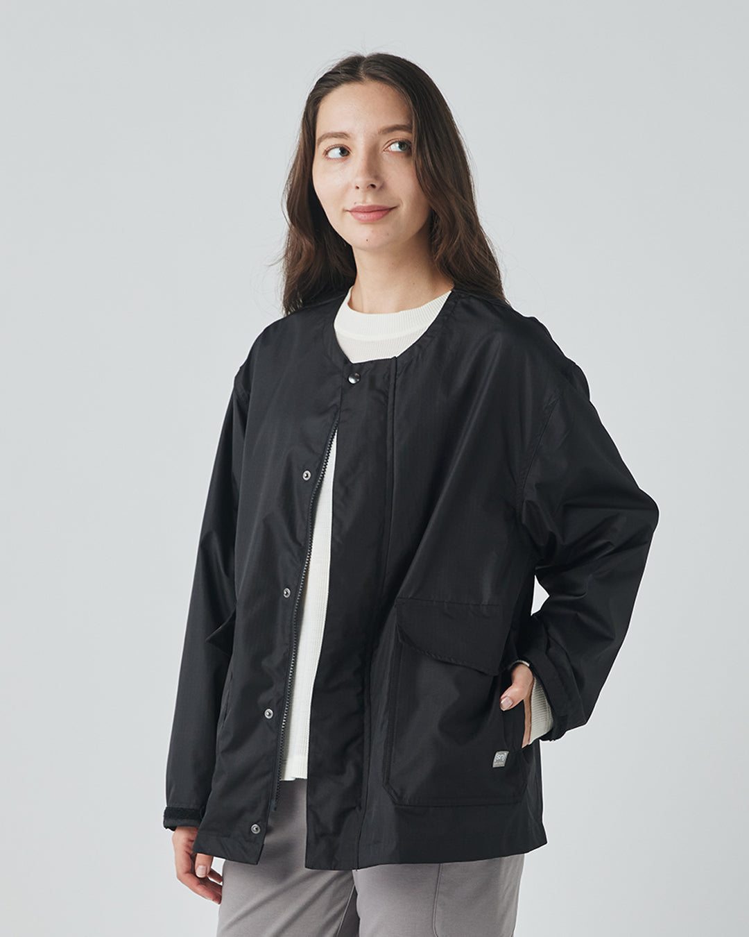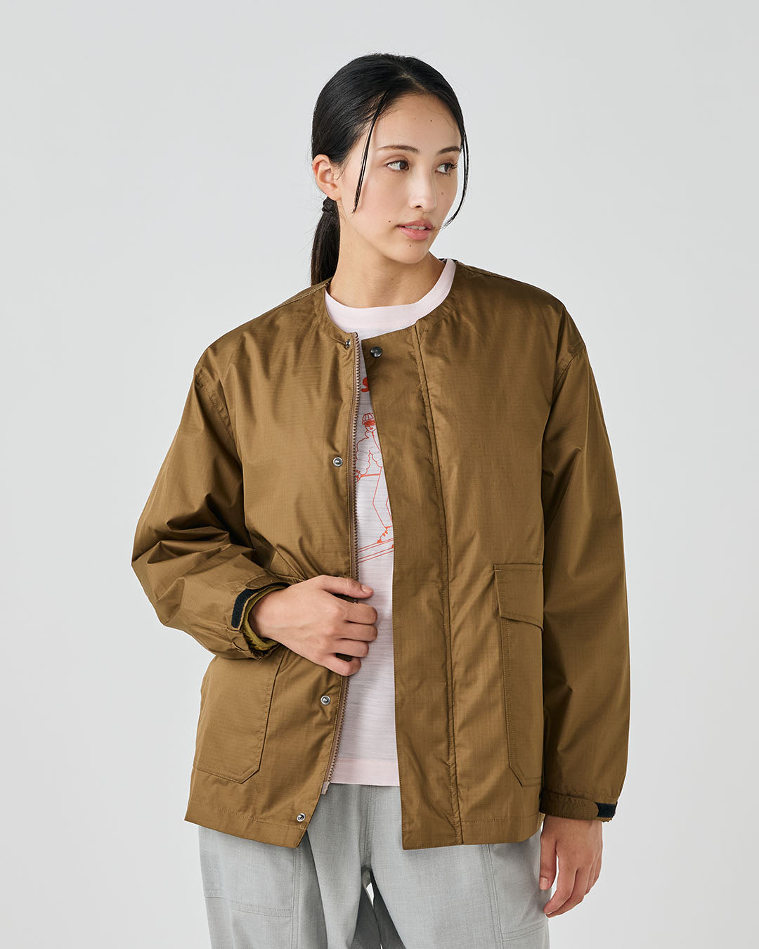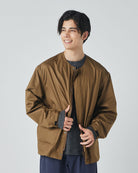 アウトドアジャケットのディテールを取り入れつつも、ノーカラーですっきりと都会的な印象に仕上げています。