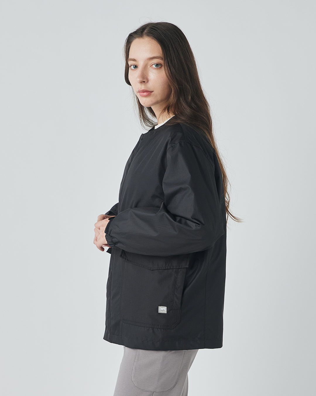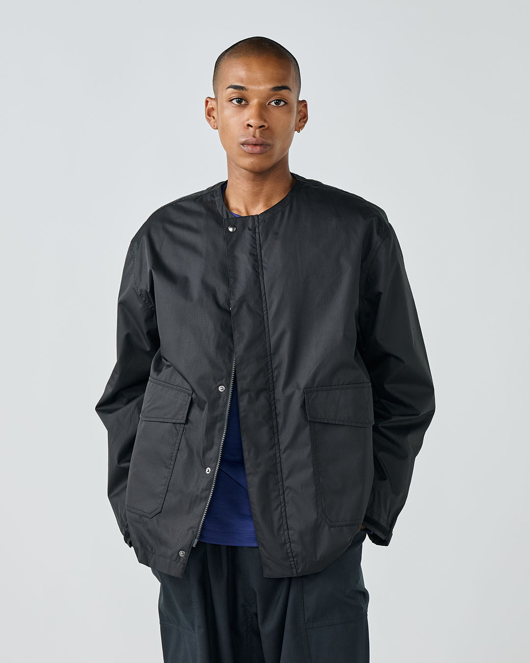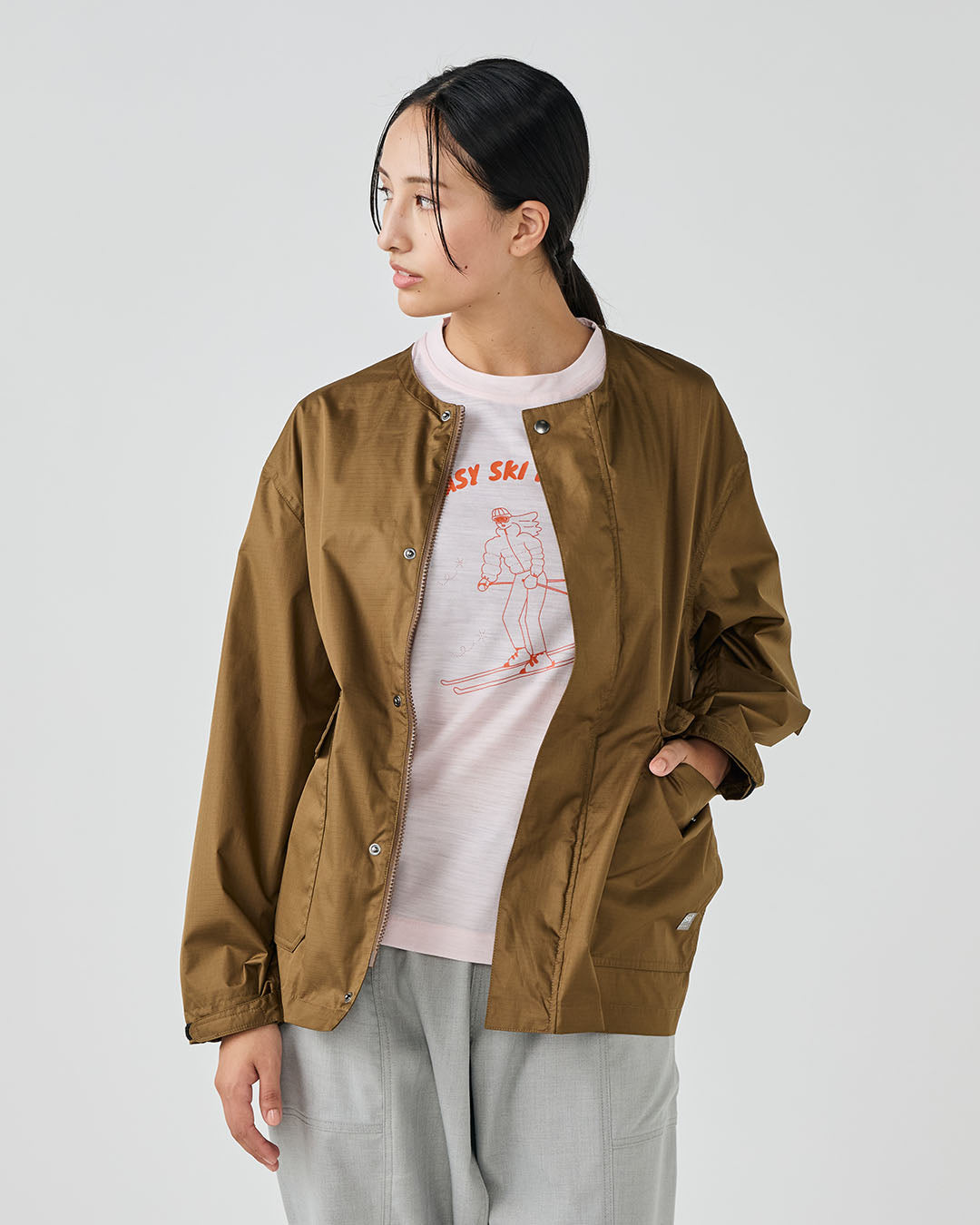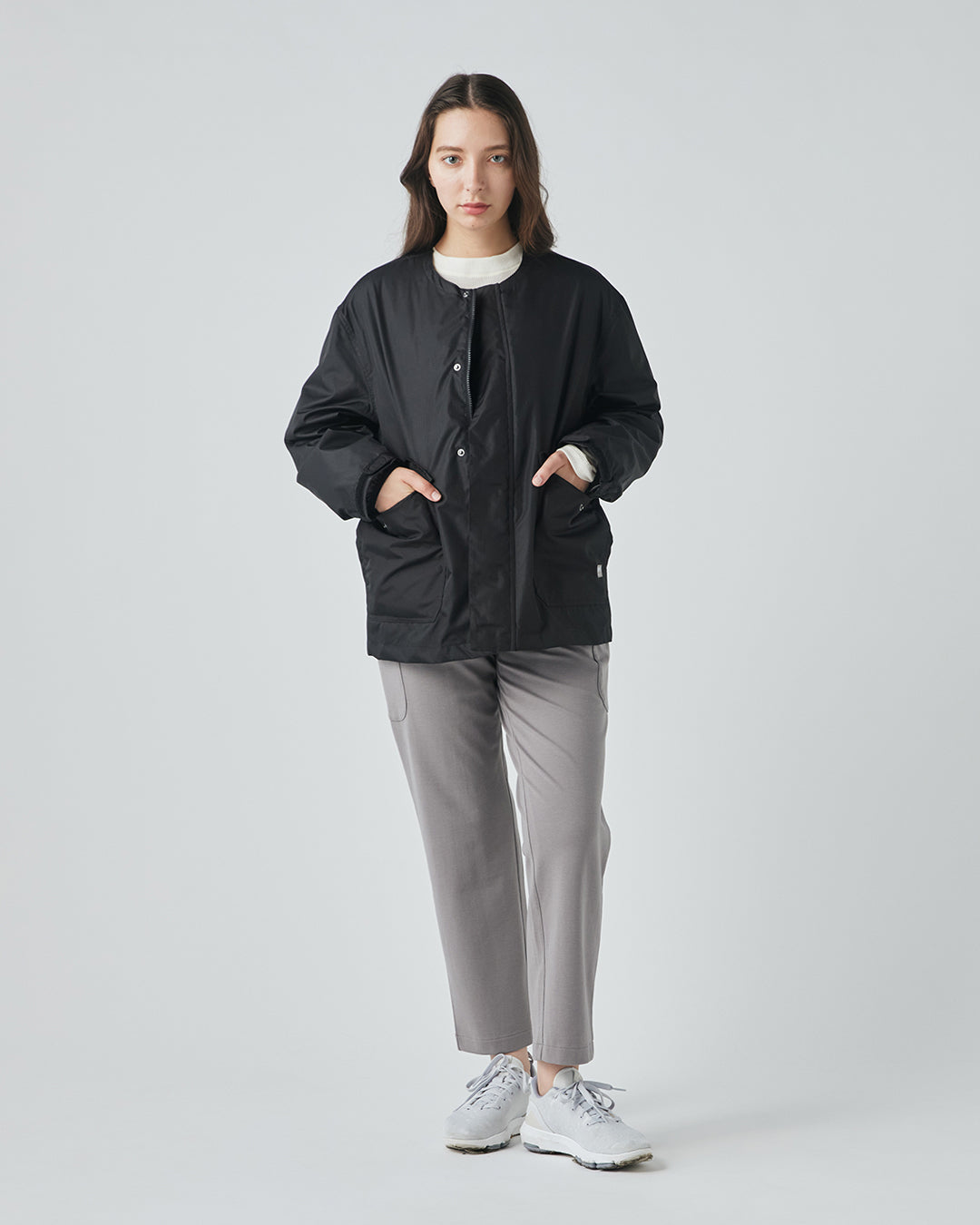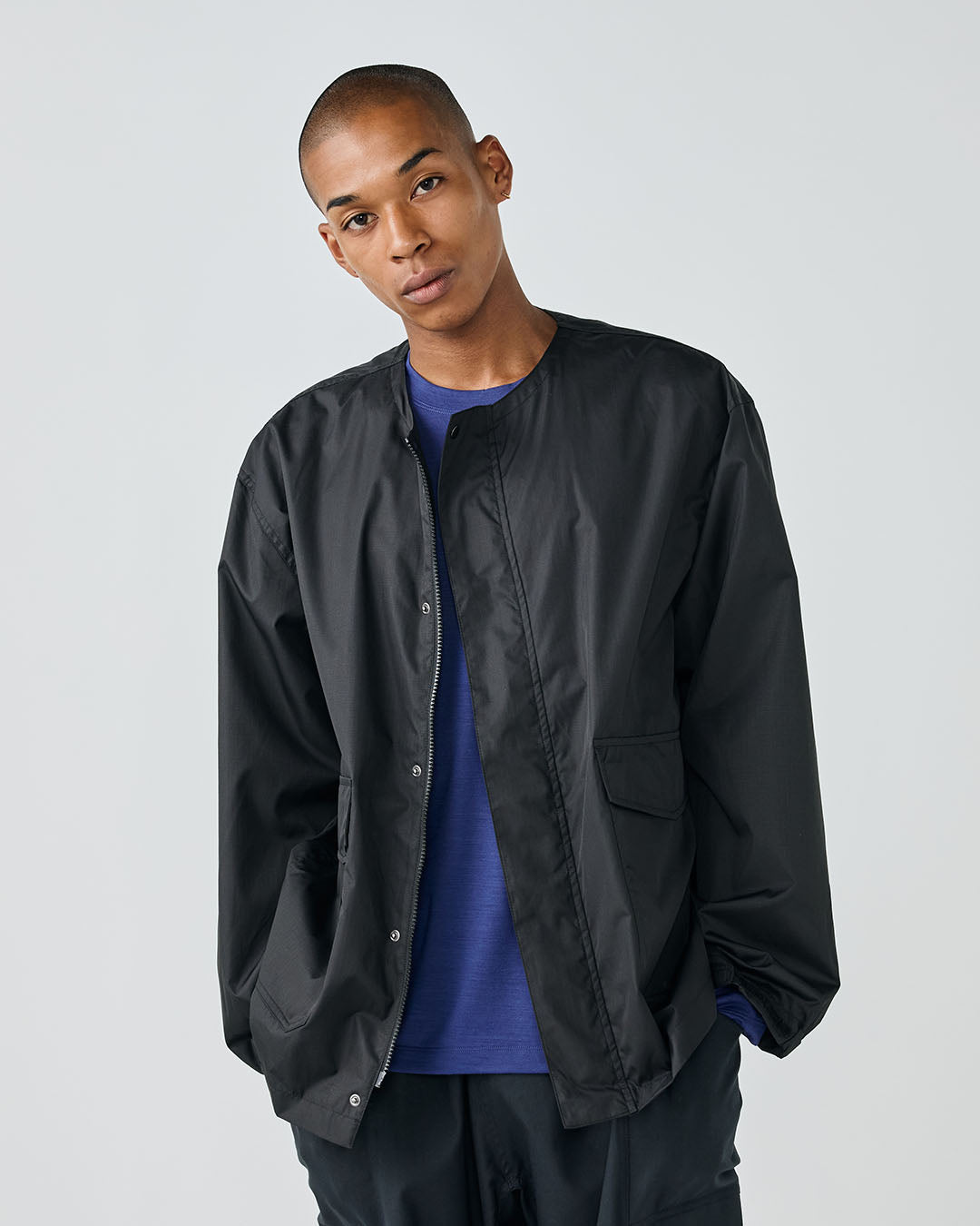 アウトドアジャケットのディテールを取り入れつつも、ノーカラーですっきりと都会的な印象に仕上げています。