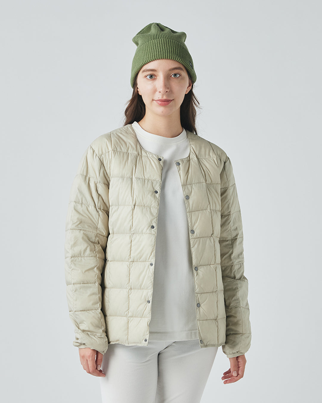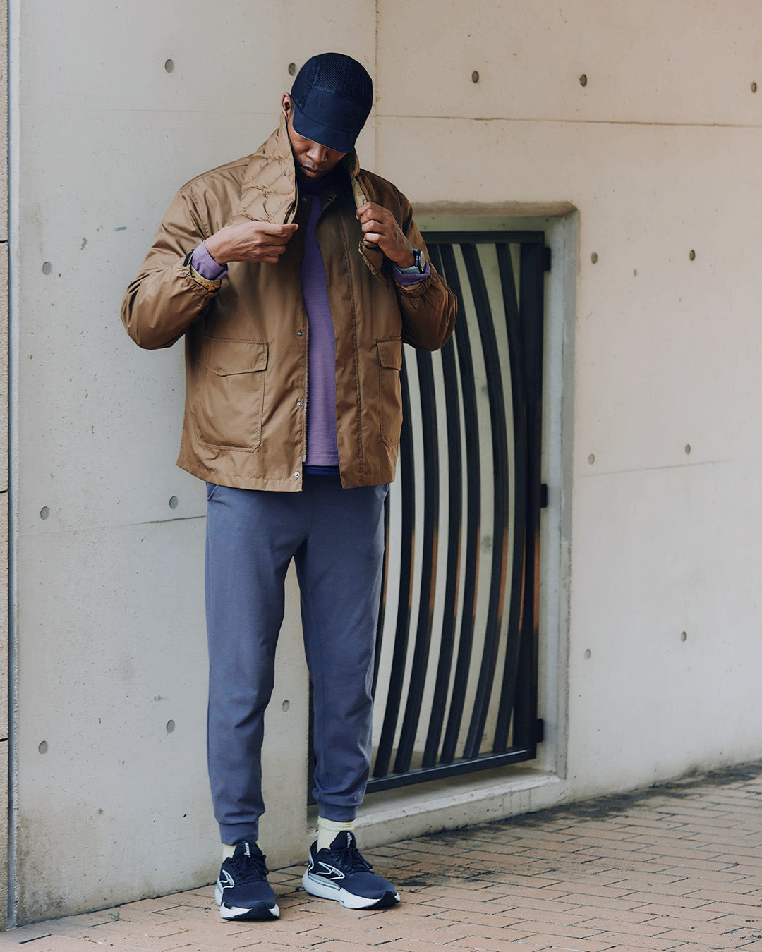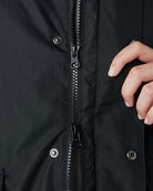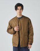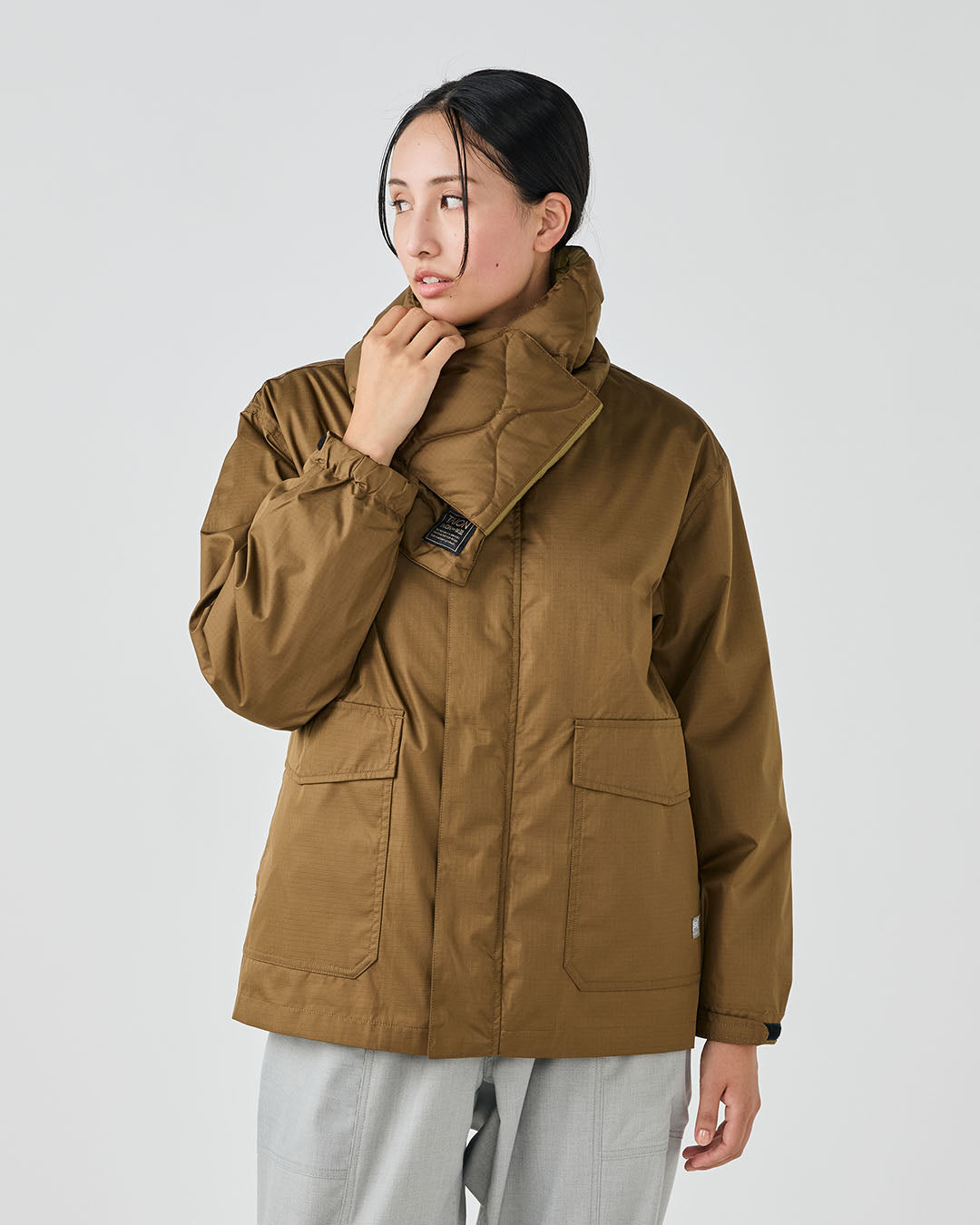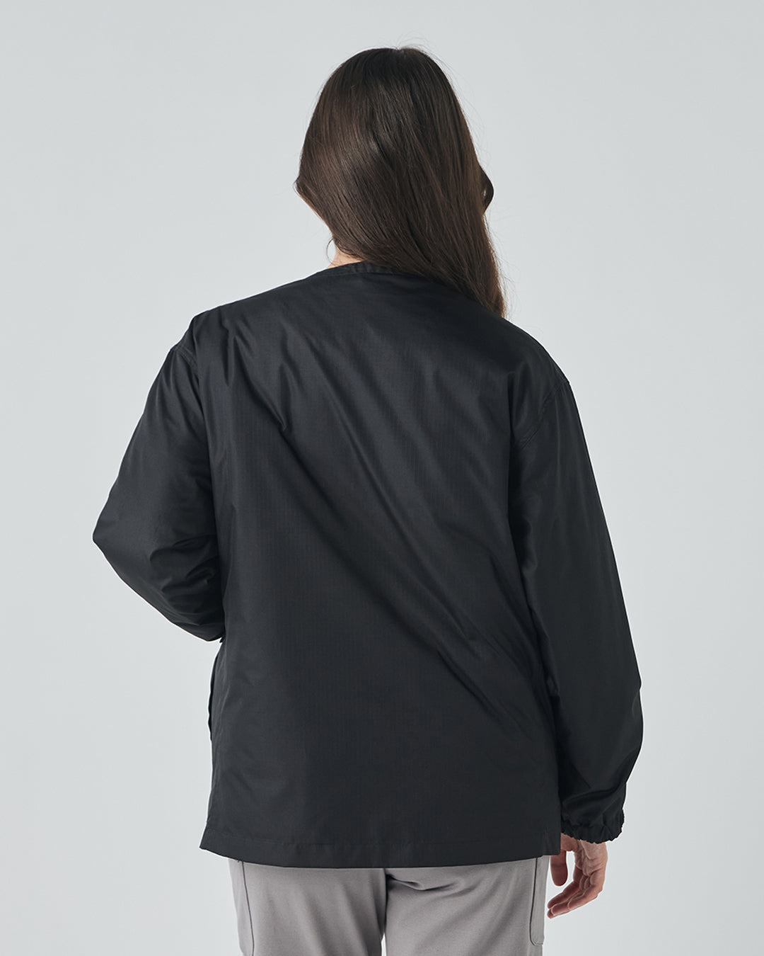 アウトドアジャケットのディテールを取り入れつつも、ノーカラーですっきりと都会的な印象に仕上げています。