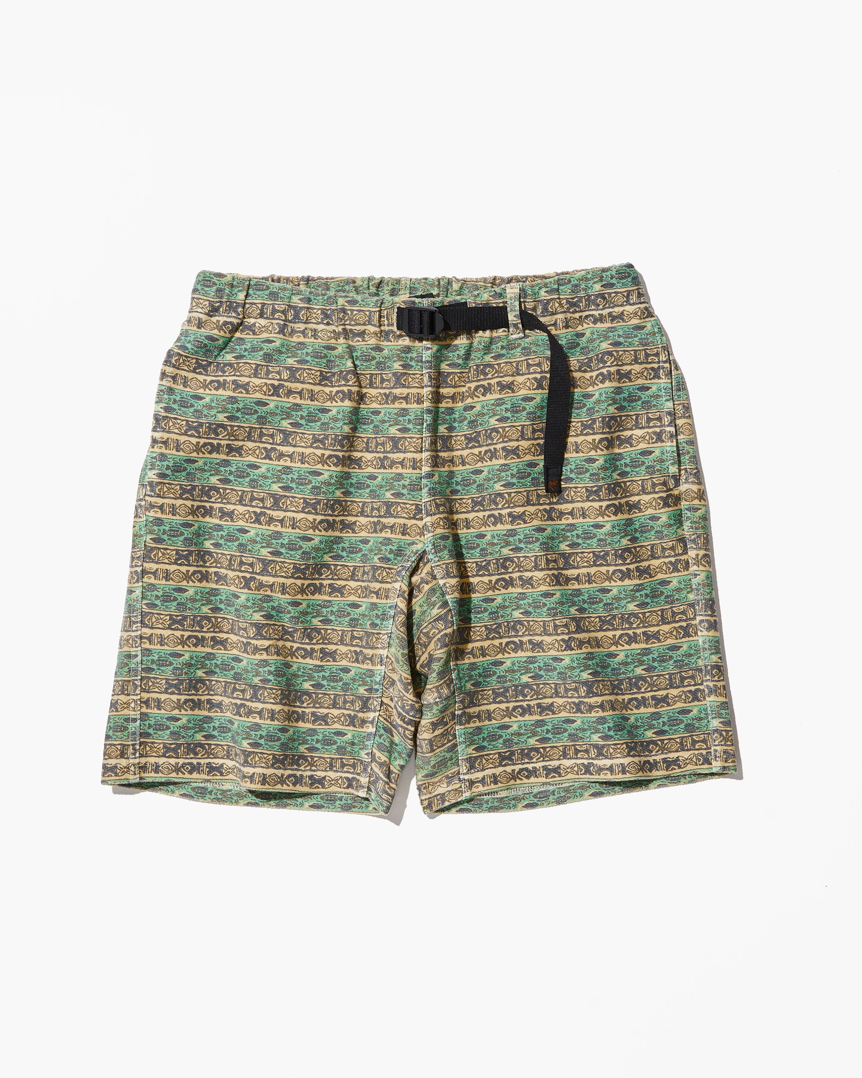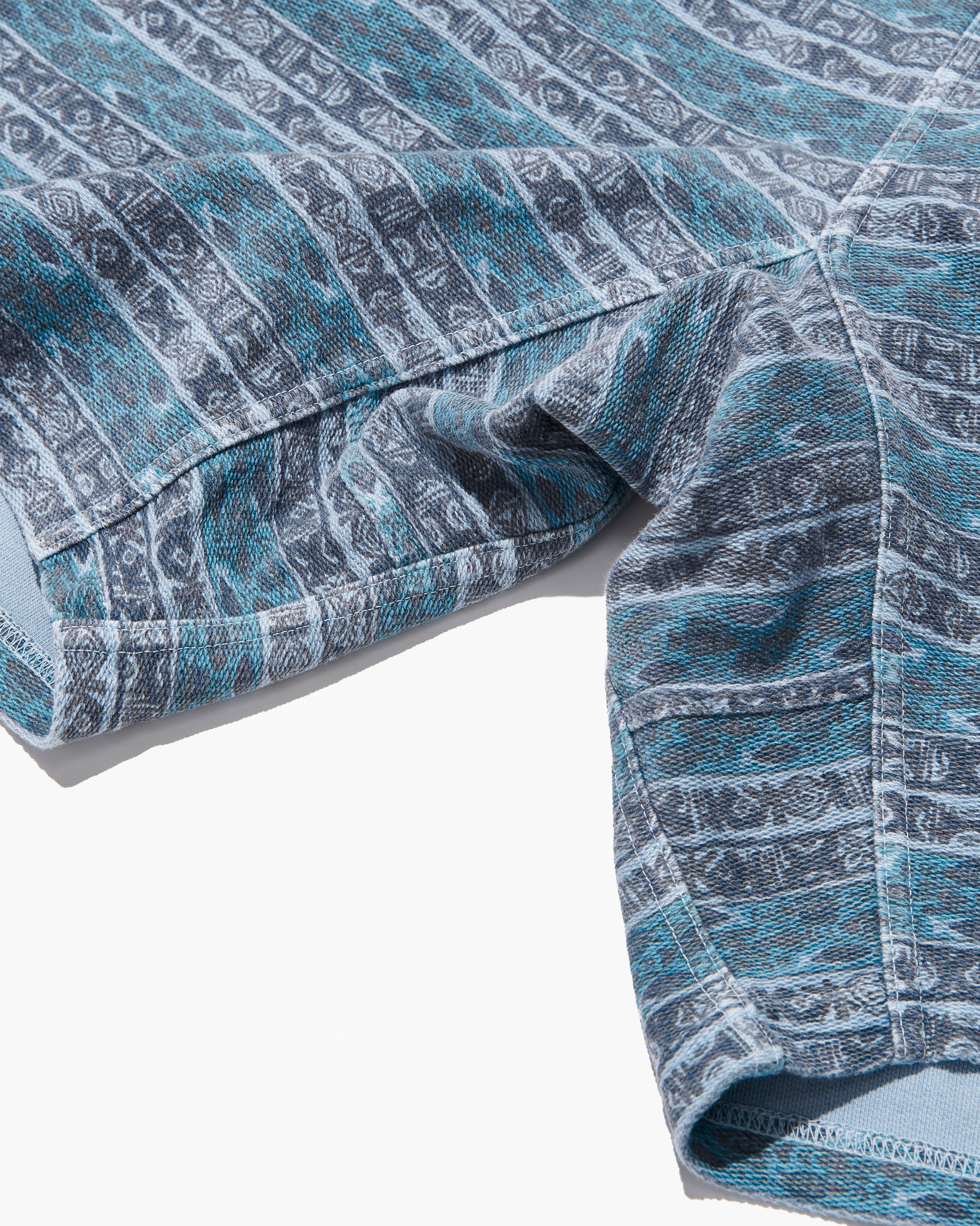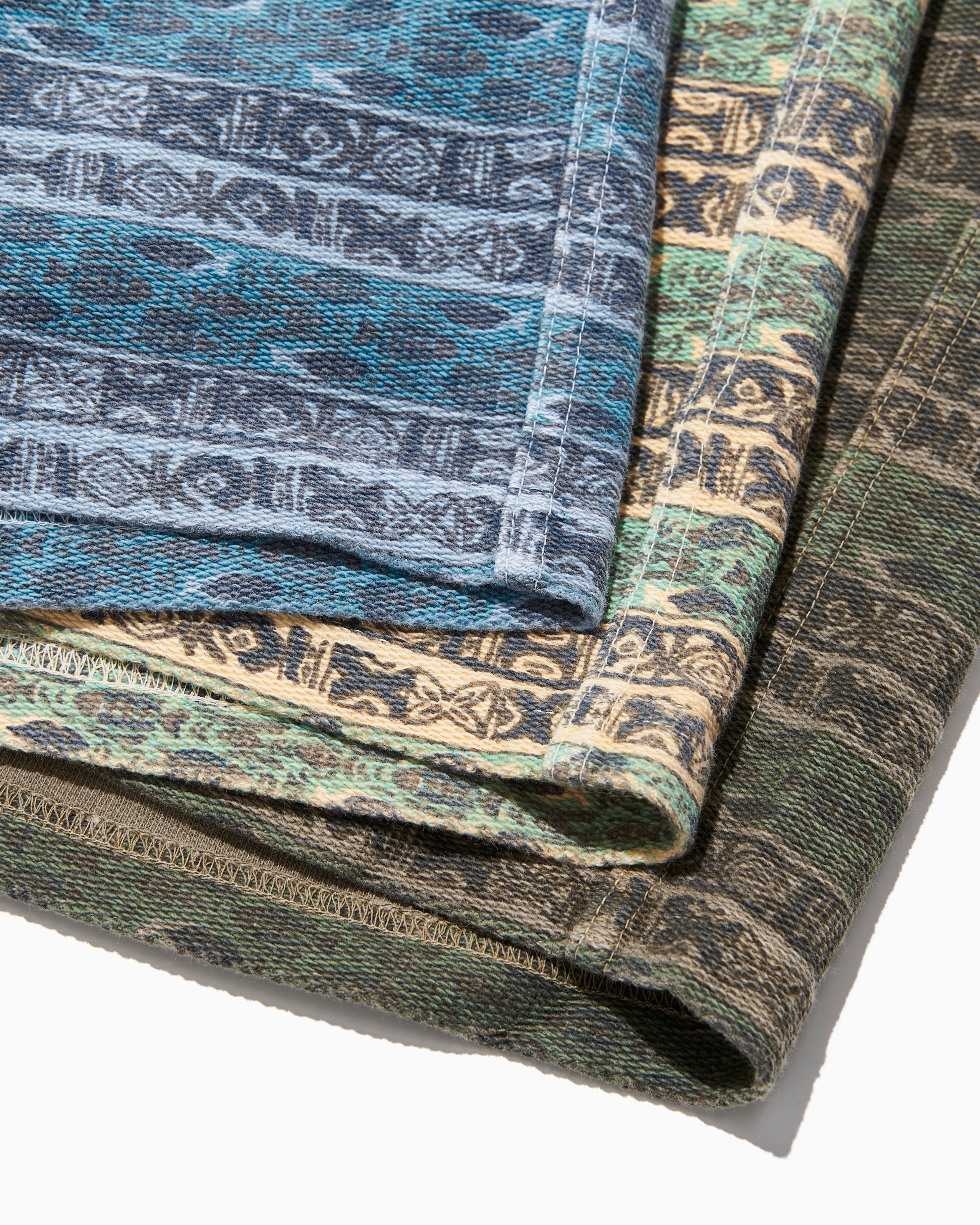 かつてマイク・グラハムが好んだフィジーの伝統的な柄からインスパイアされたグラフィックをプリント。ユニークなニュアンスに仕上がっております。程よい厚手の生地は洗濯や経年によりエイジングが進み、風合いの出てくる素材は、長い間愛着を持って着用できるでしょう。
