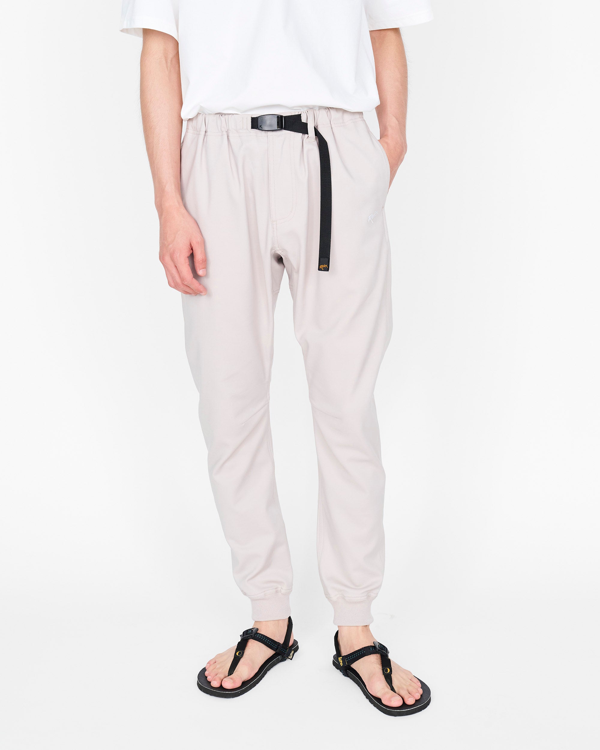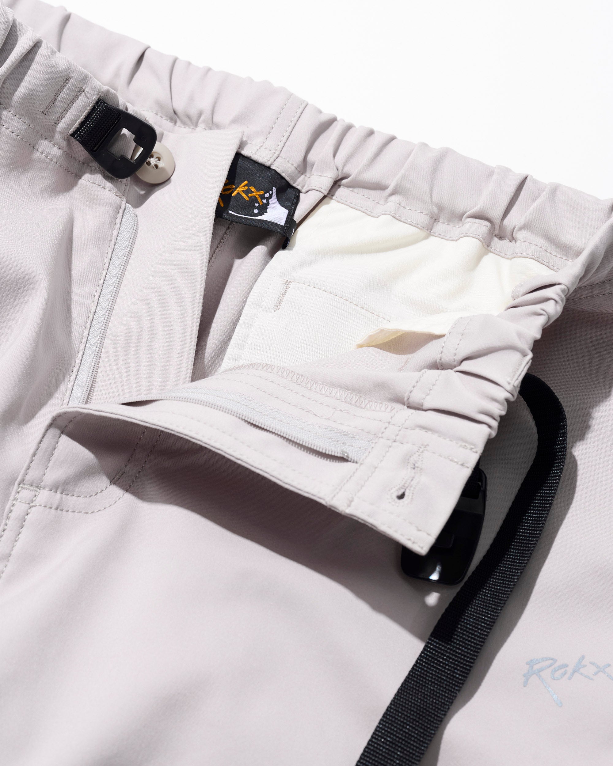 ROKXパンツの特徴である股下のガゼットクロッチやウエストのウェビングベルト、膝の立体裁断、裾のばたつきを抑える肉厚の裾リブなどクライミングパンツとしてのベーシックなディテールも健在。