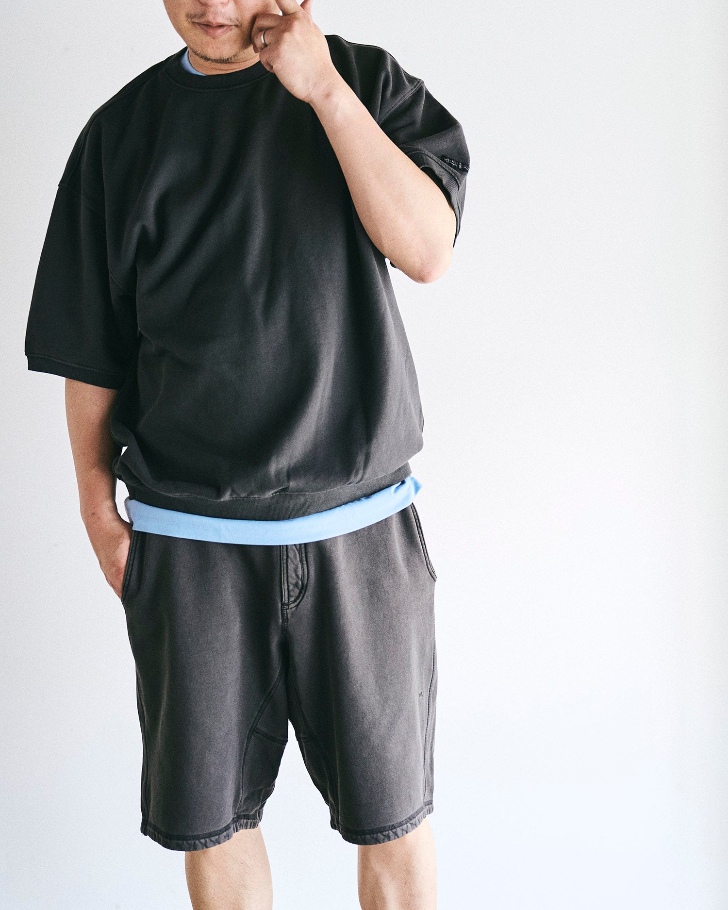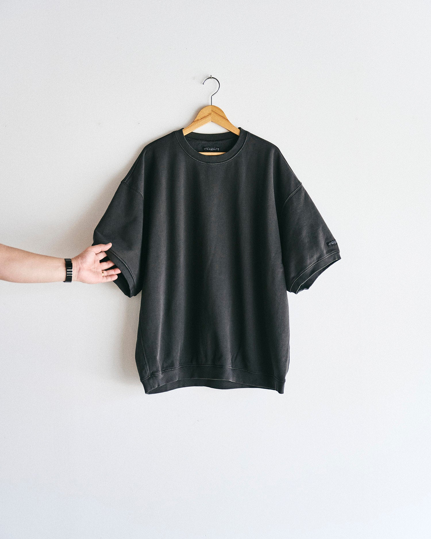 コットン100%を製品染めで仕上げた半袖スウェット。ゆったりシルエットで、レイアリングも楽しめる。ハンドポケットも装備。