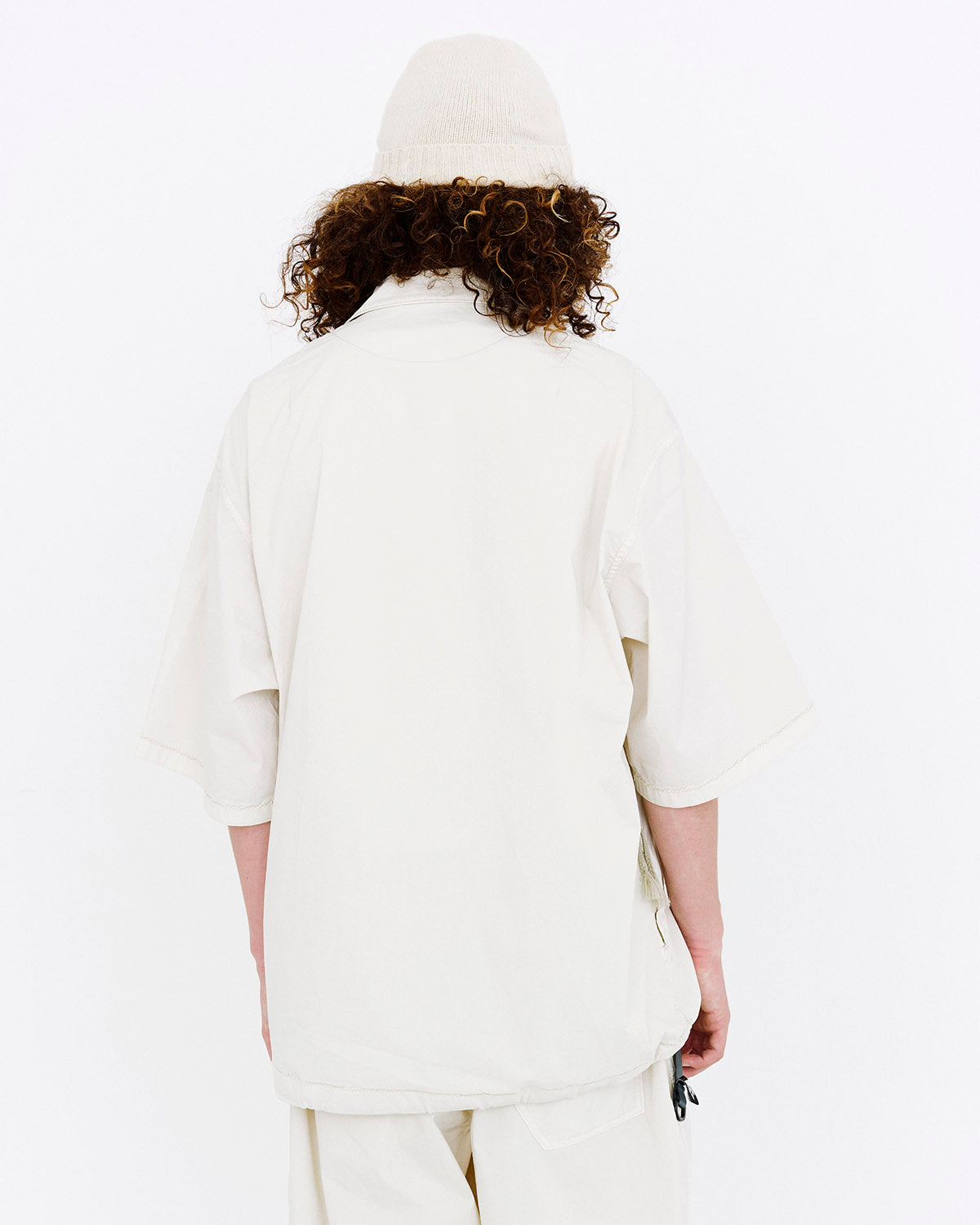 ポケット豊富な5分丈フィールドシャツ。ジッパーポケット、裾にドローコードも配備。ナイロンの持つ強度性と速乾性、そしてコットンの持つ風合いをミックスし、製品染めで仕上げております。薄くて軽量なパッカブル仕様。速乾性にも大変優れており、旅先で重宝します。