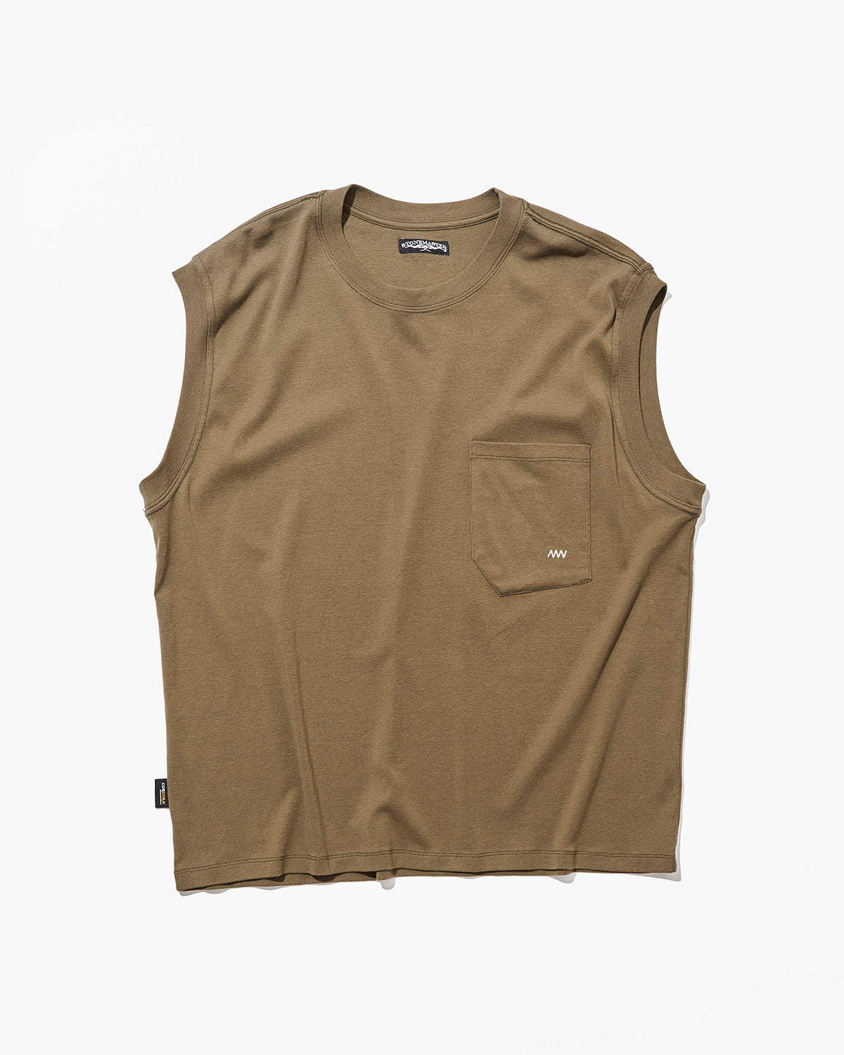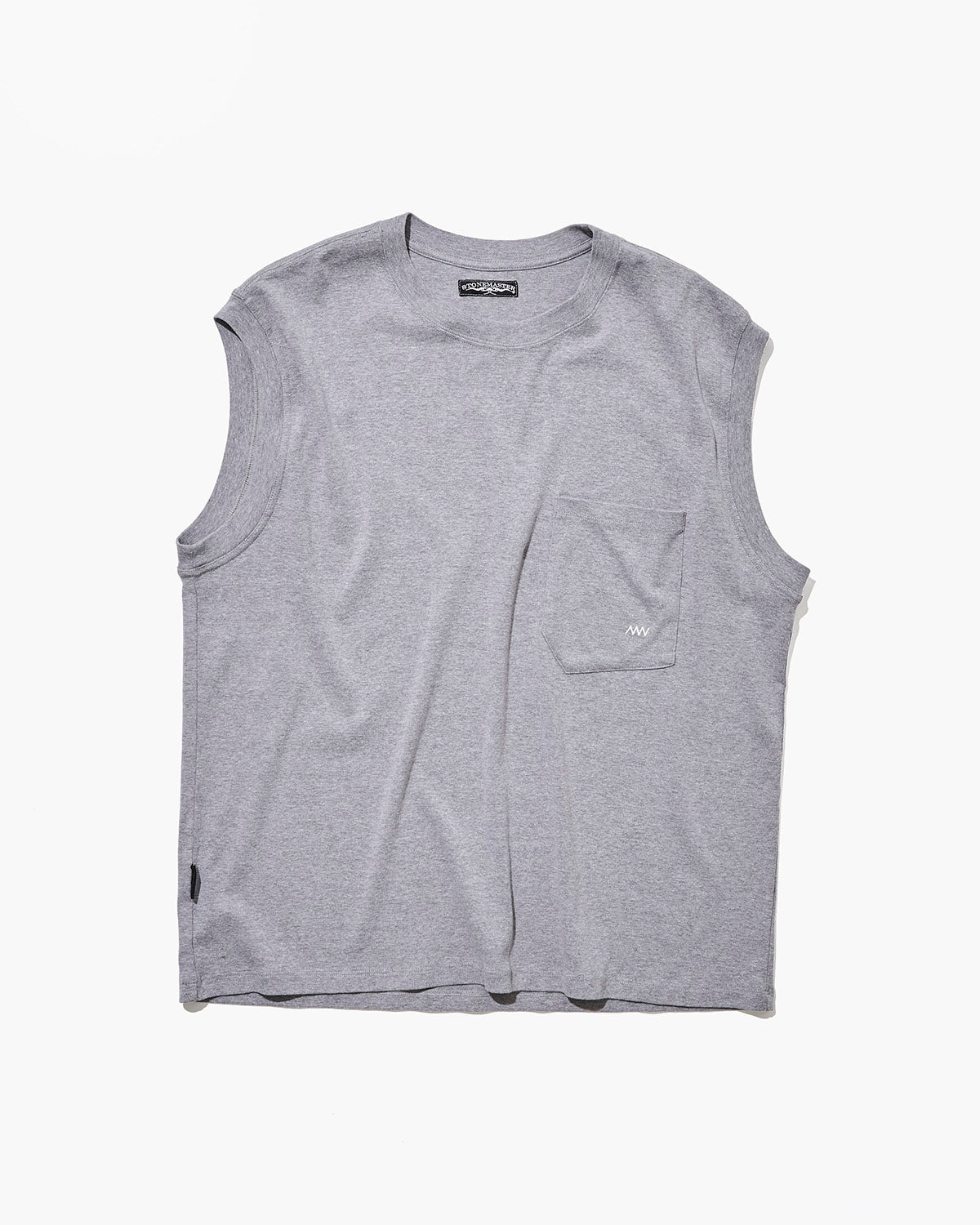 CORDURA® ナイロンとコットンをミックスしたノースリーブシャツ。こちらは16番天竺を用いた肉厚で上質な素材を更にワンウォッシュ加工仕上げ。着心地良さはもちろん、暑い時期でもドライをキープし、洗ってもくたびれない耐摩耗性に優れたTシャツ。マイクのハンドドローイングで作られたポケットに、ストーンマスターの象徴的なギザギザステッチをワンポイント刺繍。