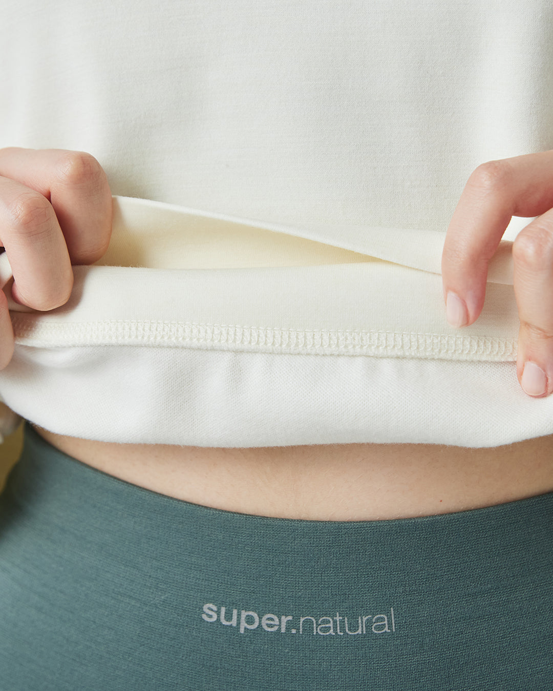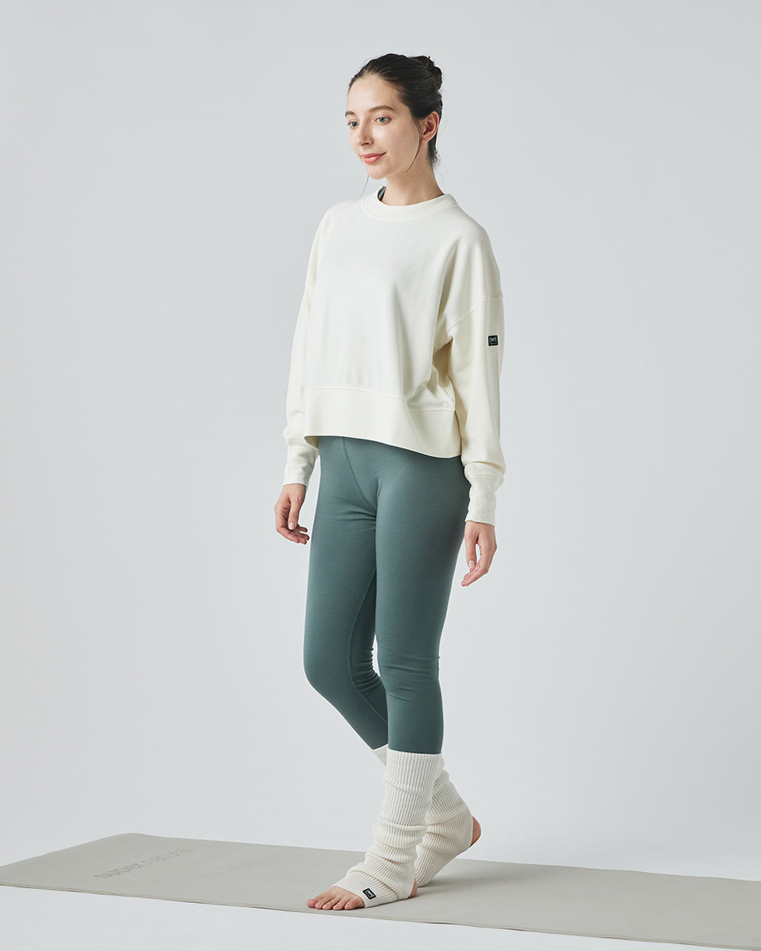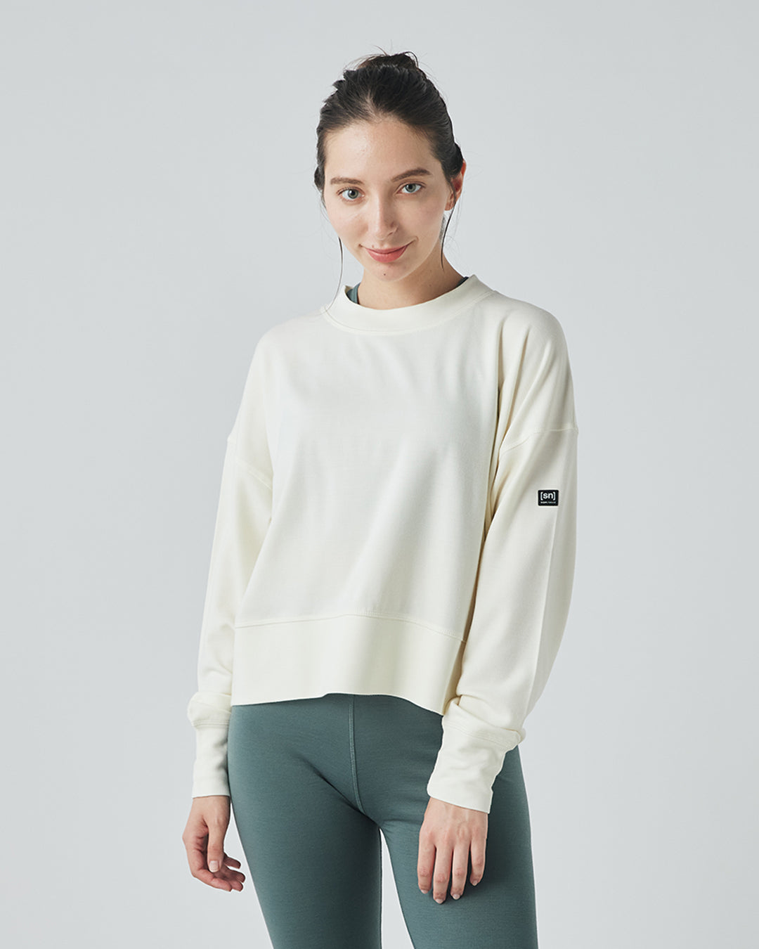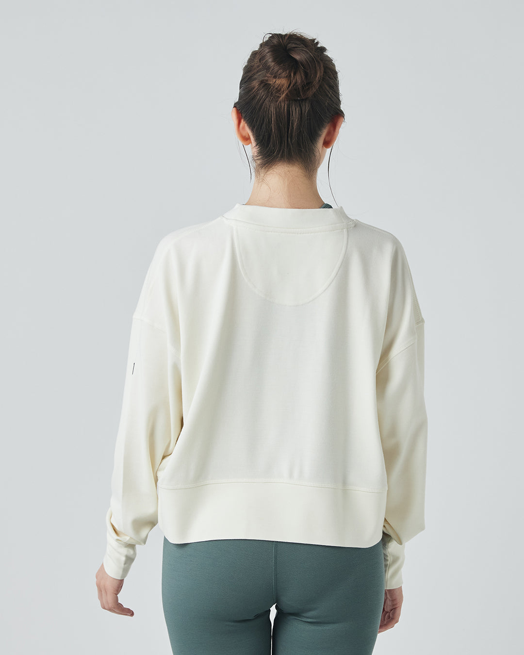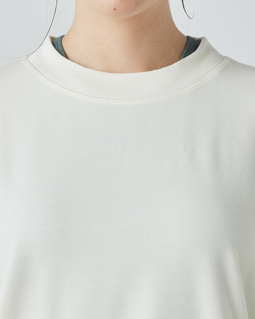 少し高めのラウンドネックやドロップショルダーのゆったりとしたシルエットは、アクティブシーンはもちろん、日常着にもおすすめのデザインです。