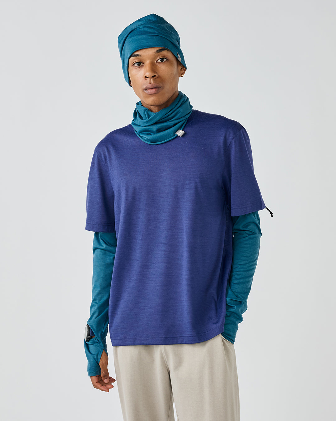 メリノウールのさらりとした風合いと吸湿効果、抗菌・防臭効果、UVカット効果に、更にポリエステルの優れた速乾性と耐久性も備えました。家庭での洗濯も可能。