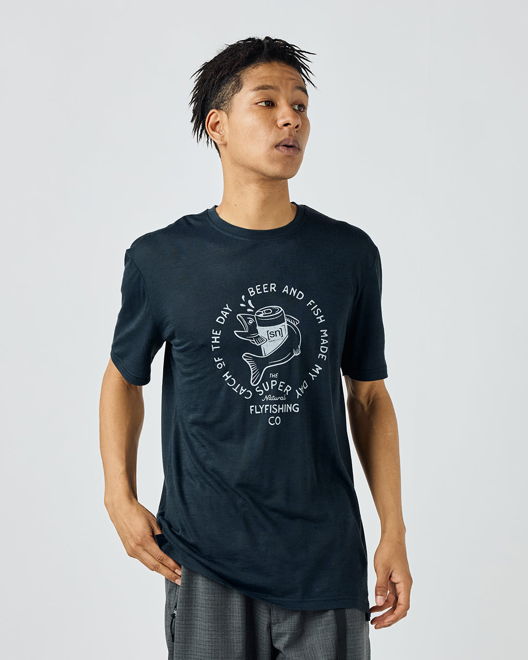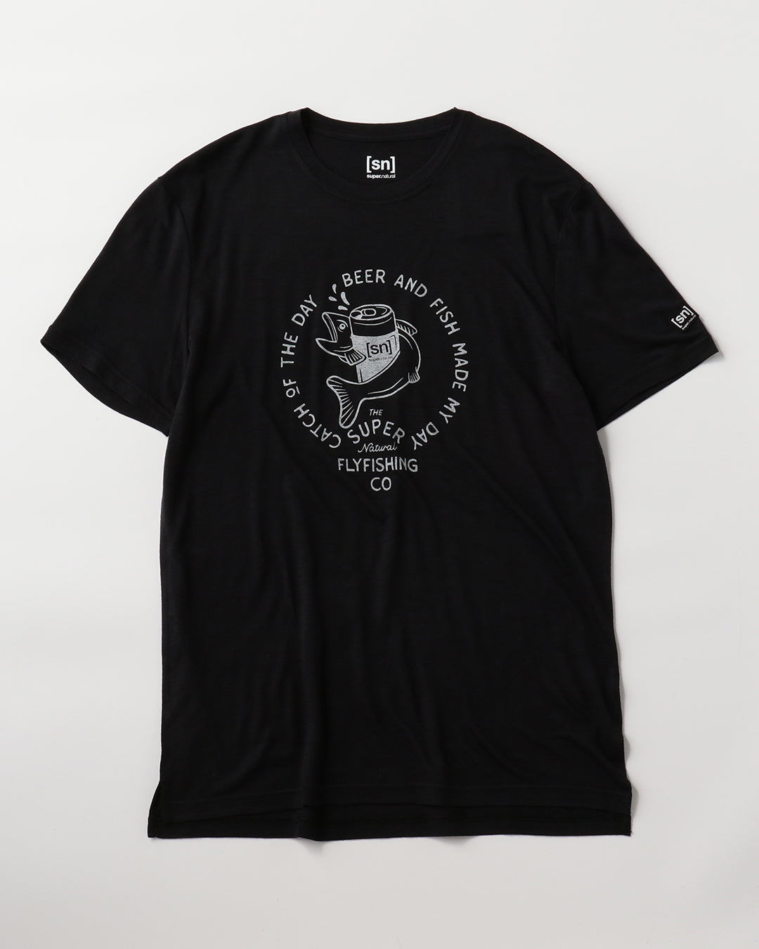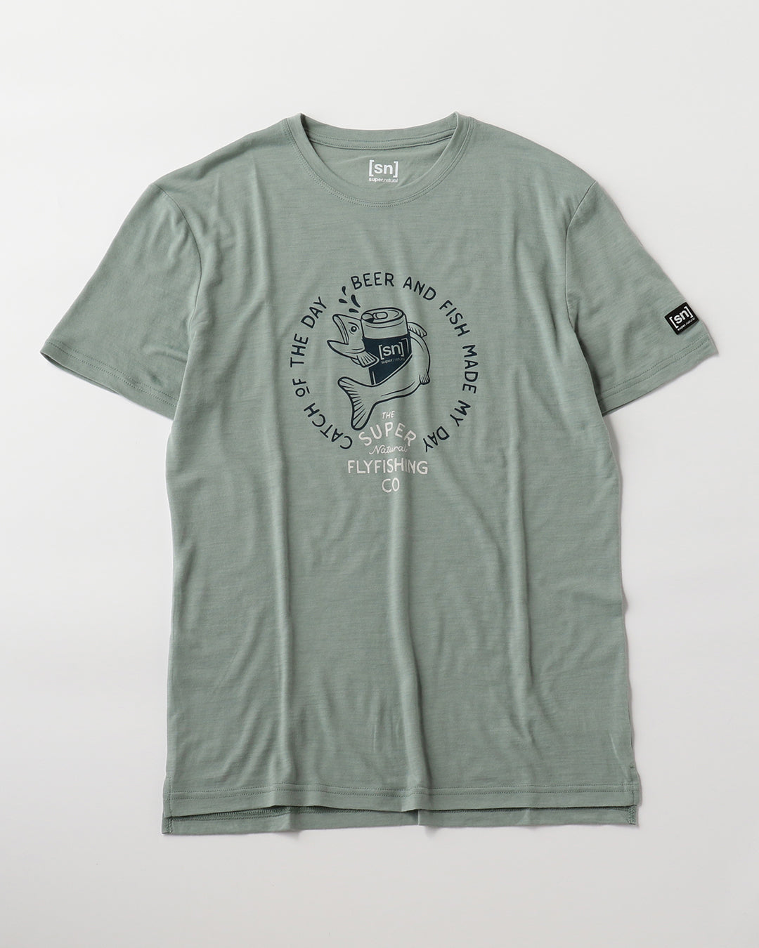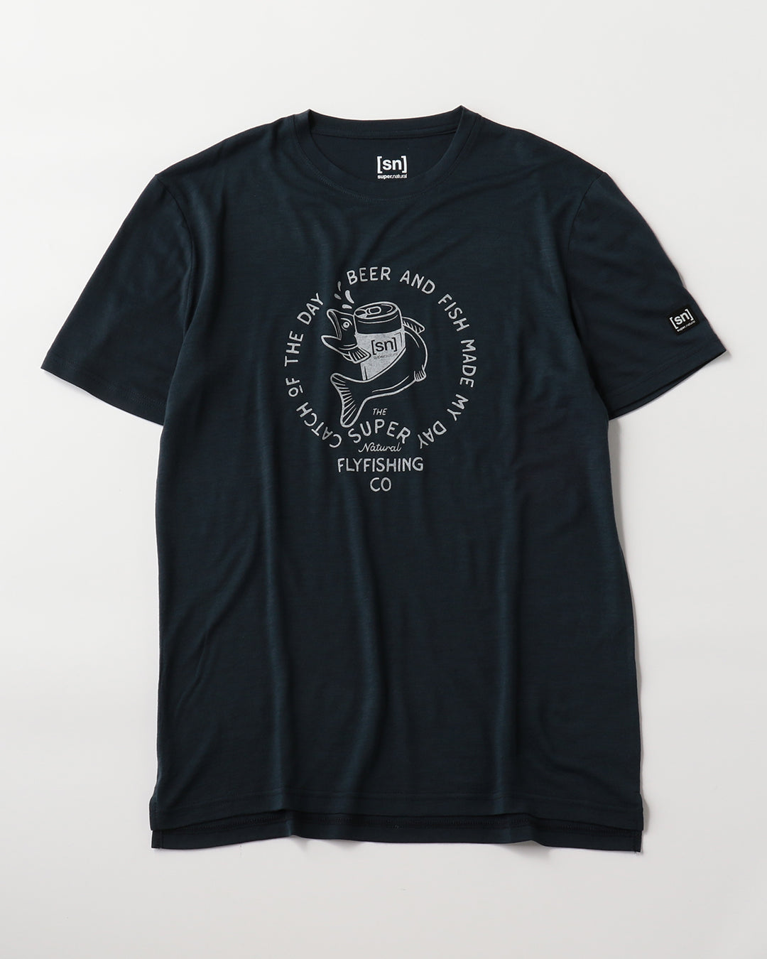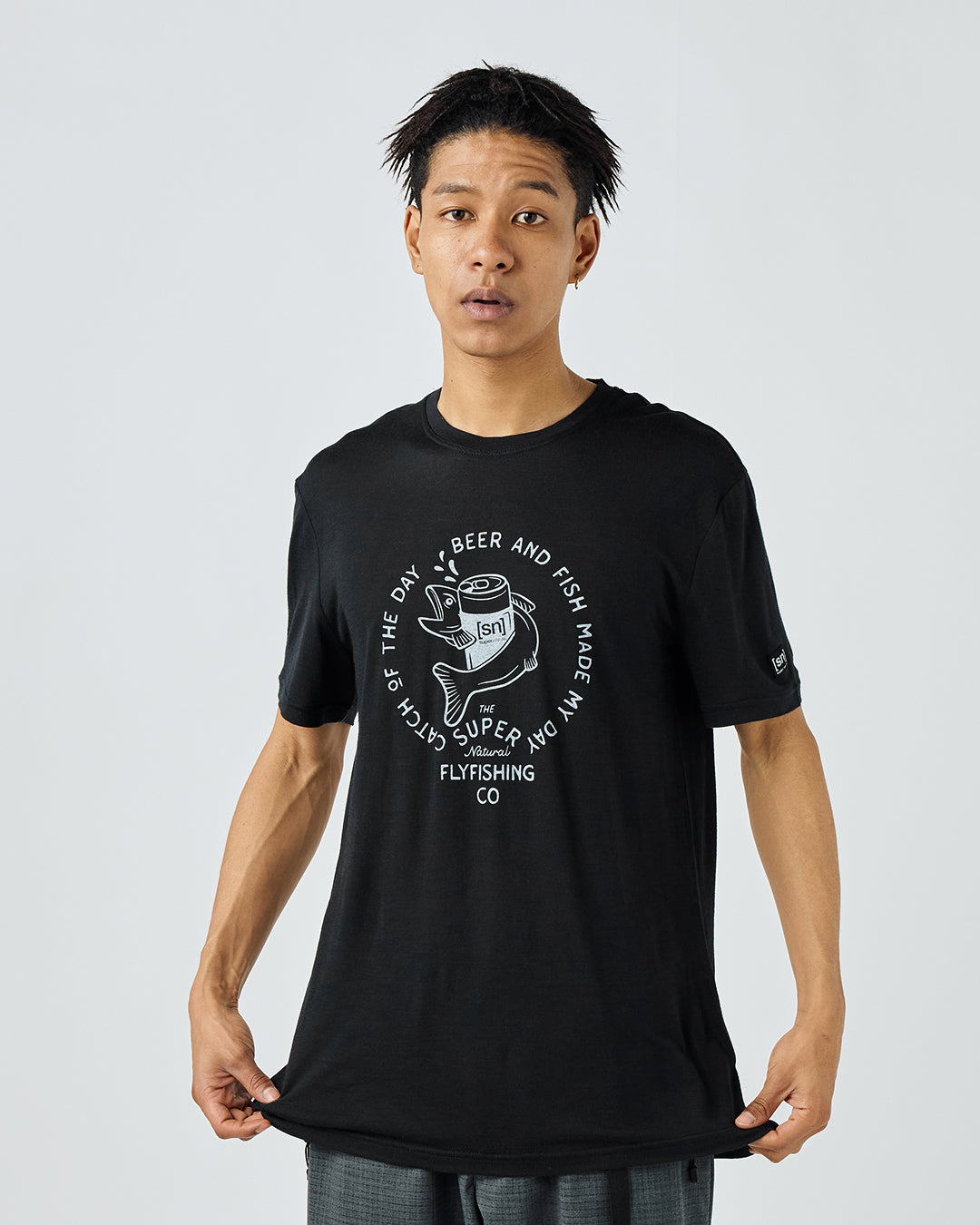 [sn]ロゴのビール缶と魚がキャッチーなグラフィックTシャツ。