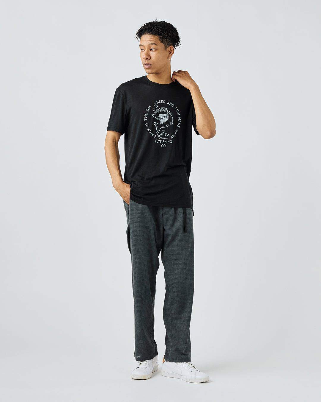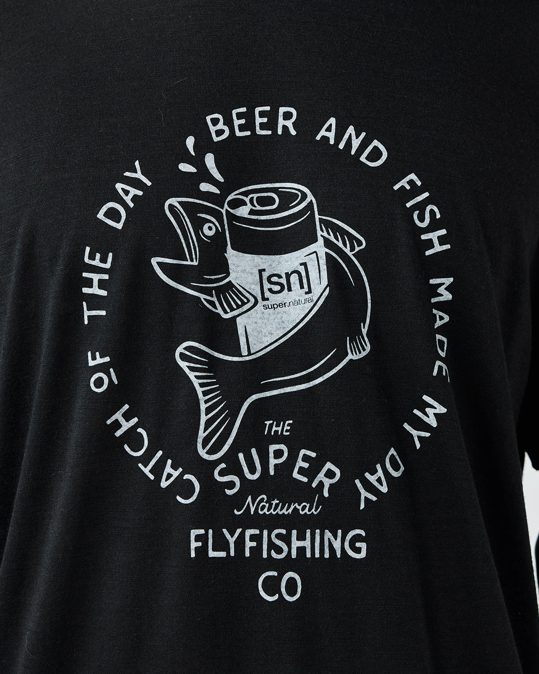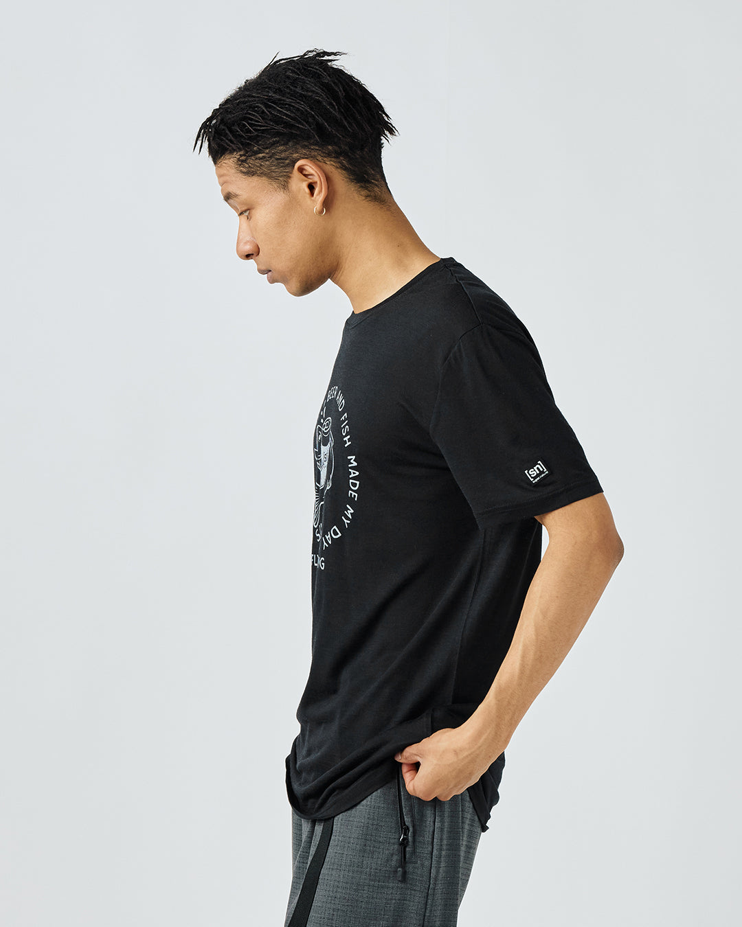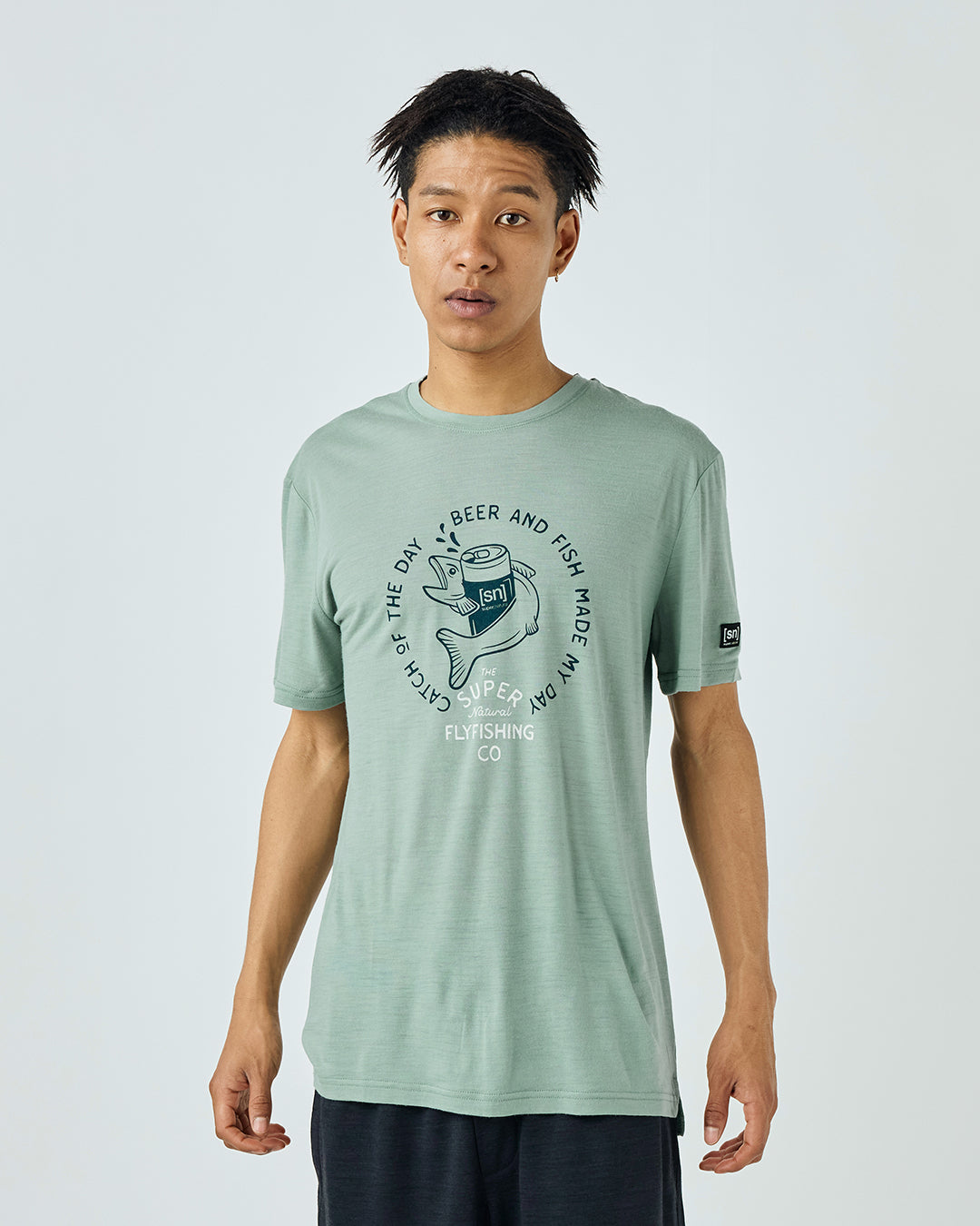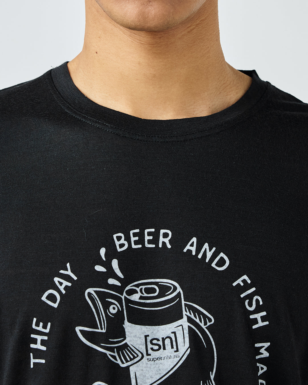 [sn]ロゴのビール缶と魚がキャッチーなグラフィックTシャツ。