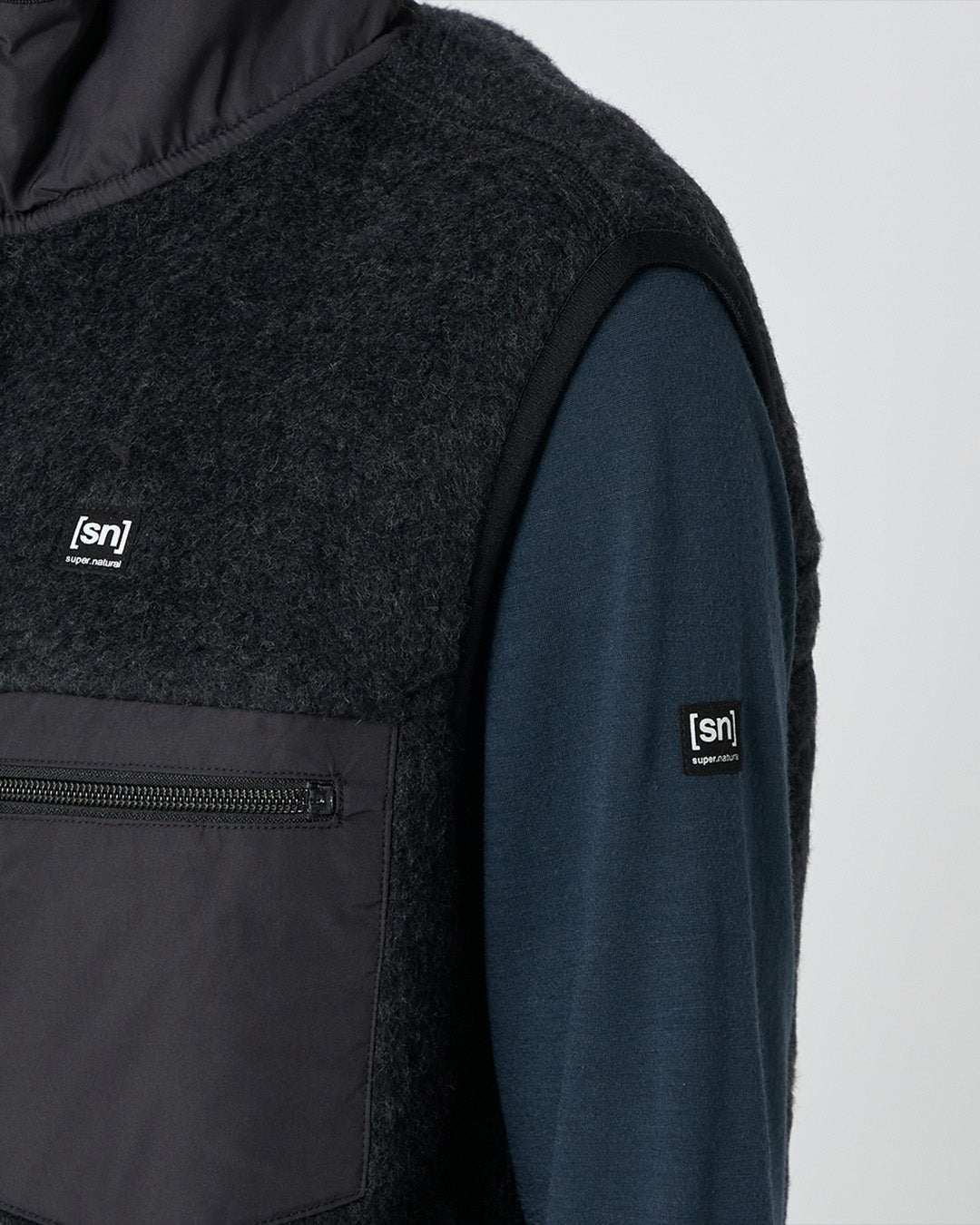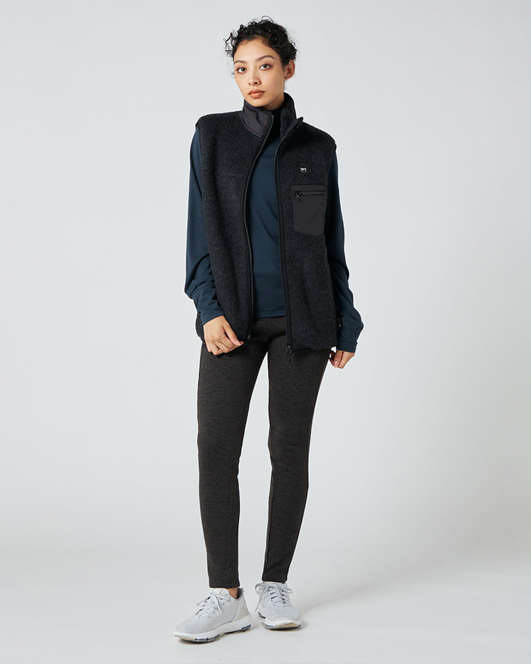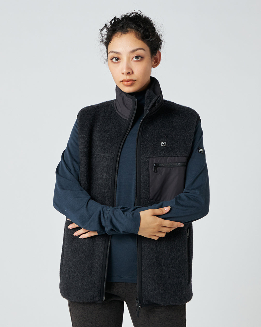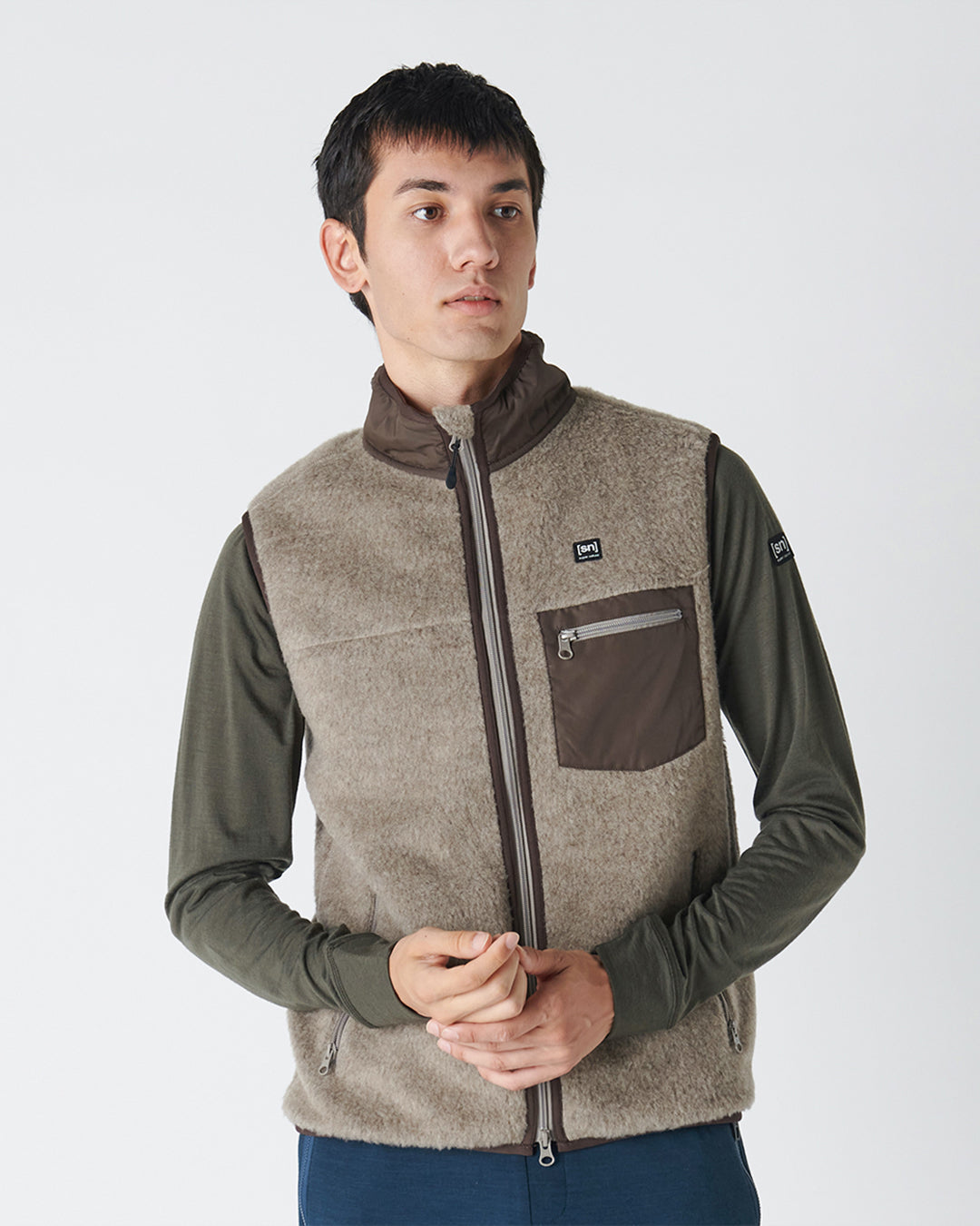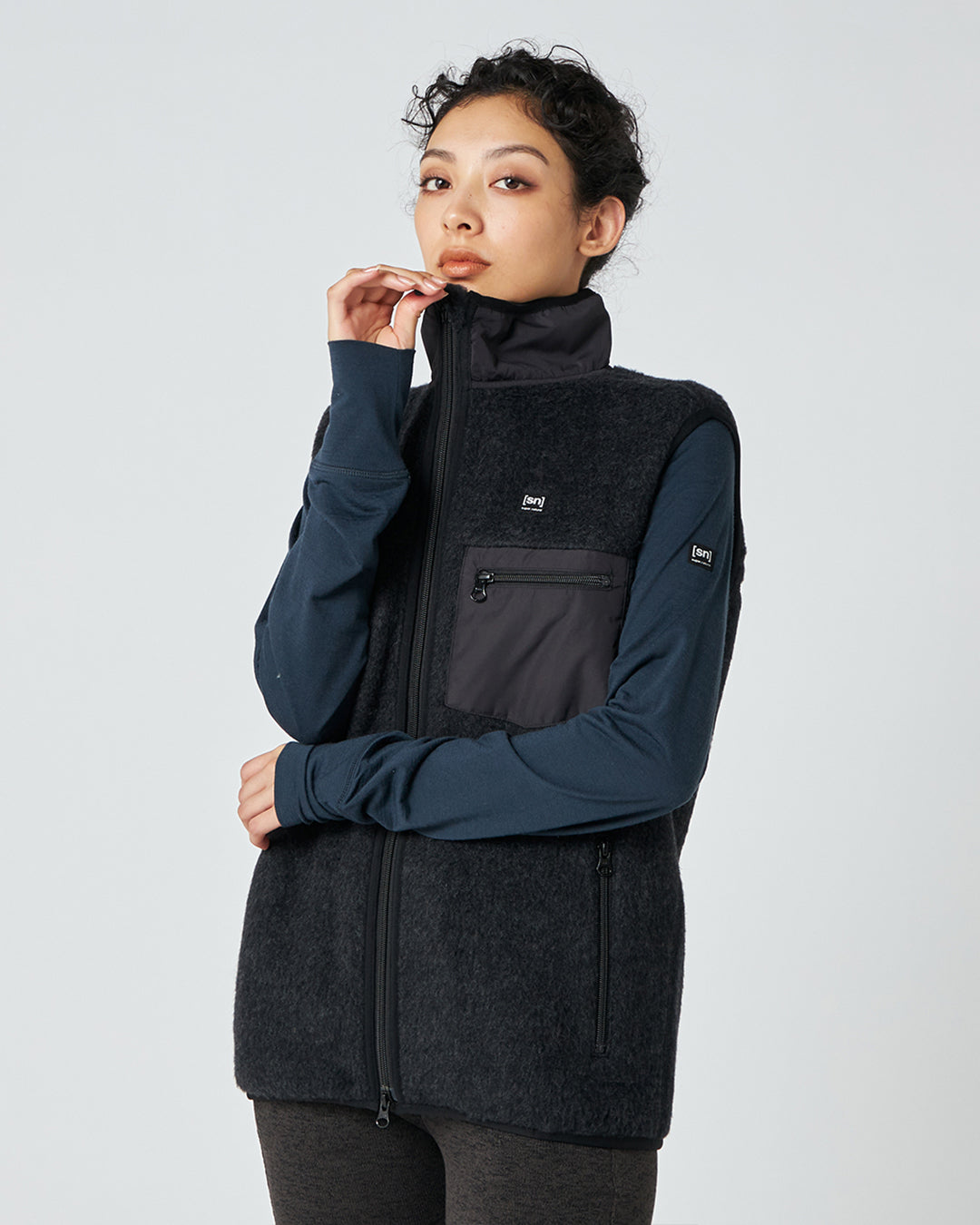 襟の切り替えと胸のポケットがアクセントのフリースベストは、軽量でコンパクトなサイズ感はアクティブな動きの邪魔にならず、しっかりとボディを保温。