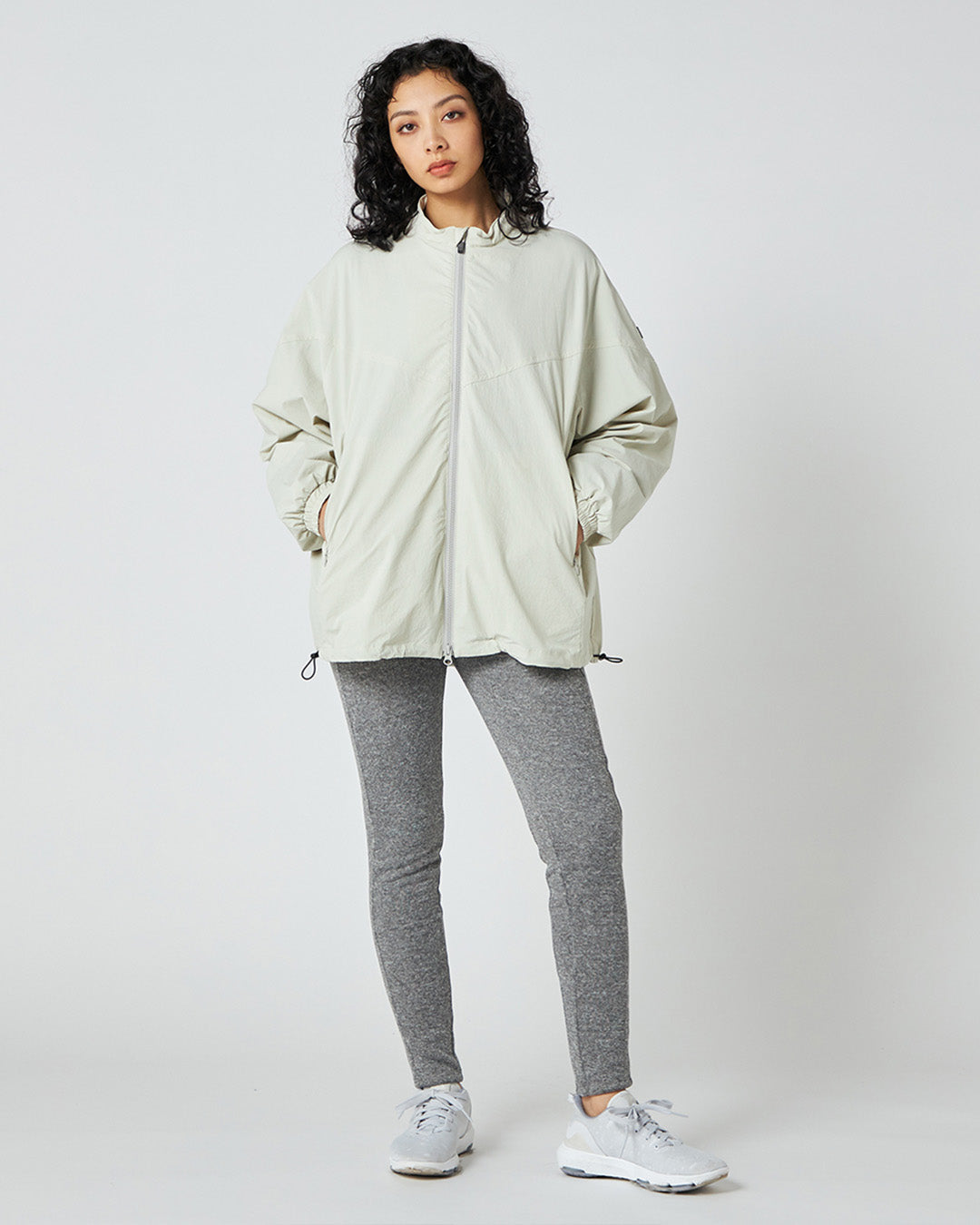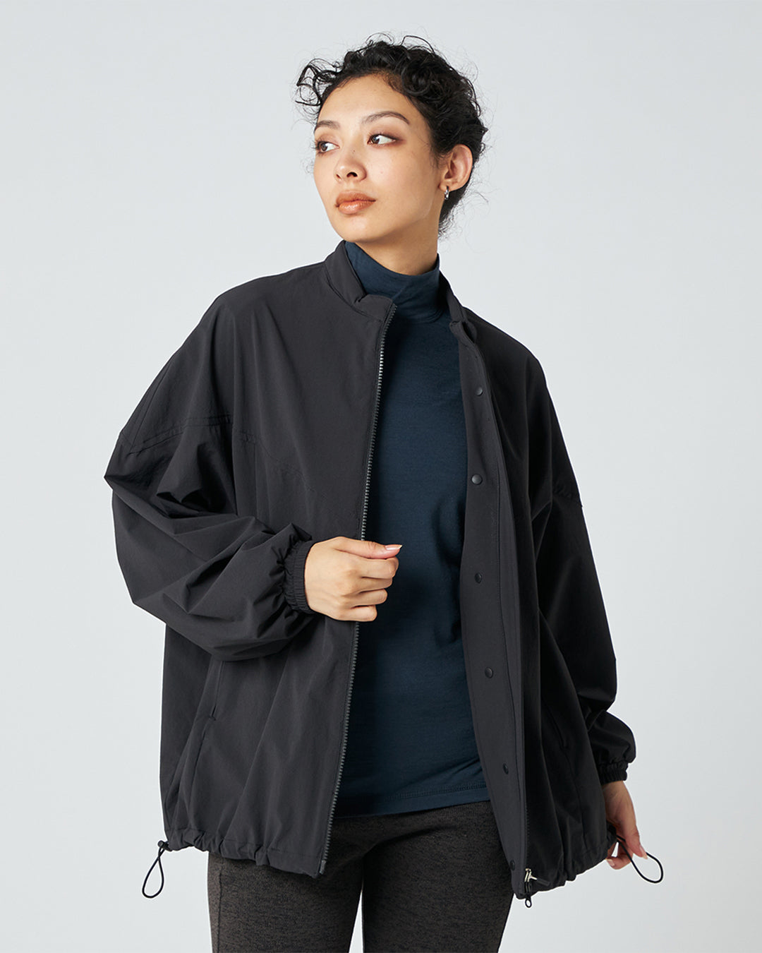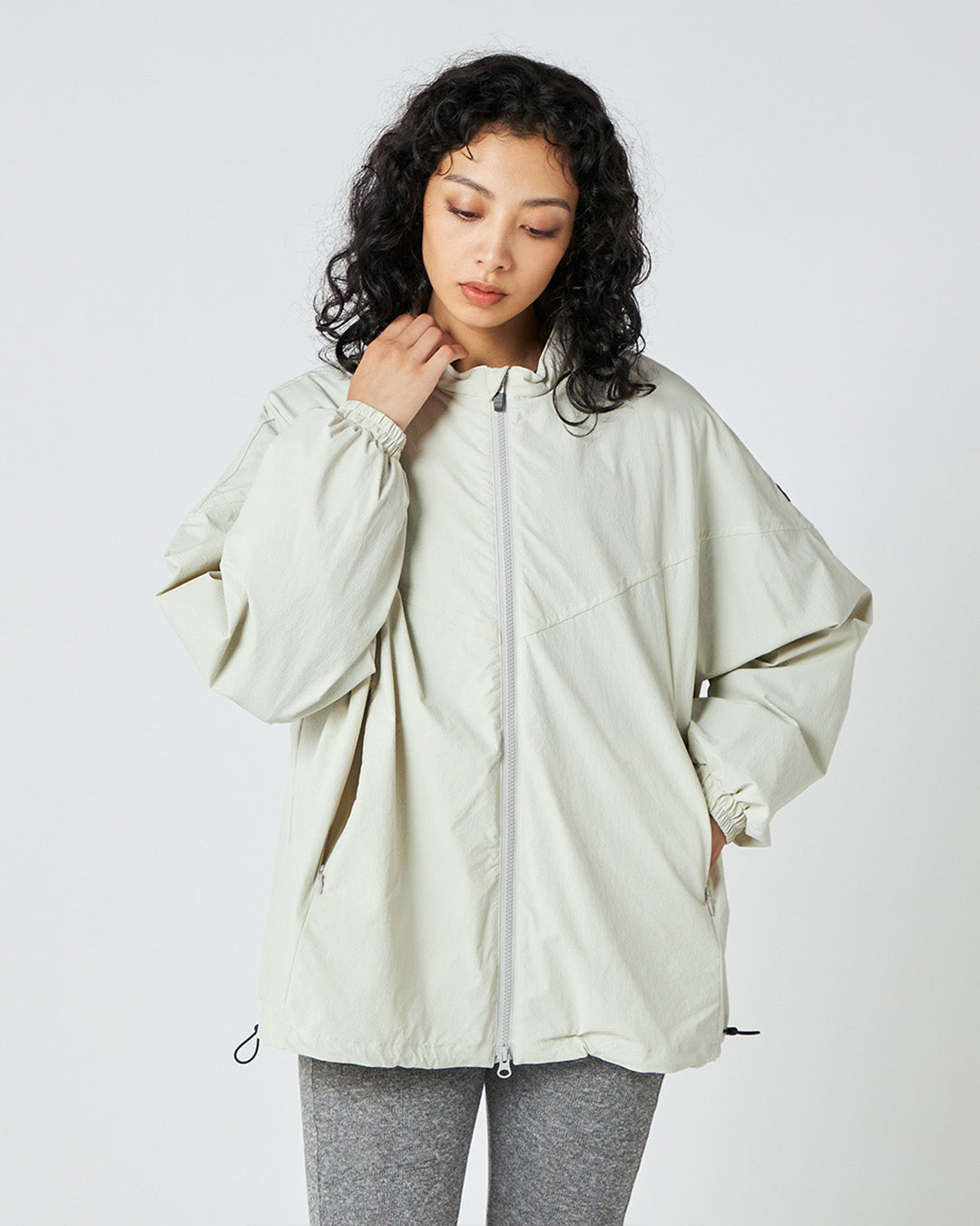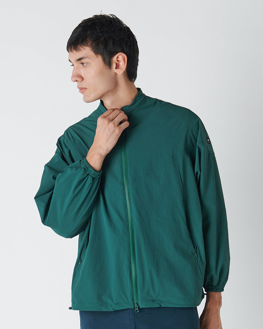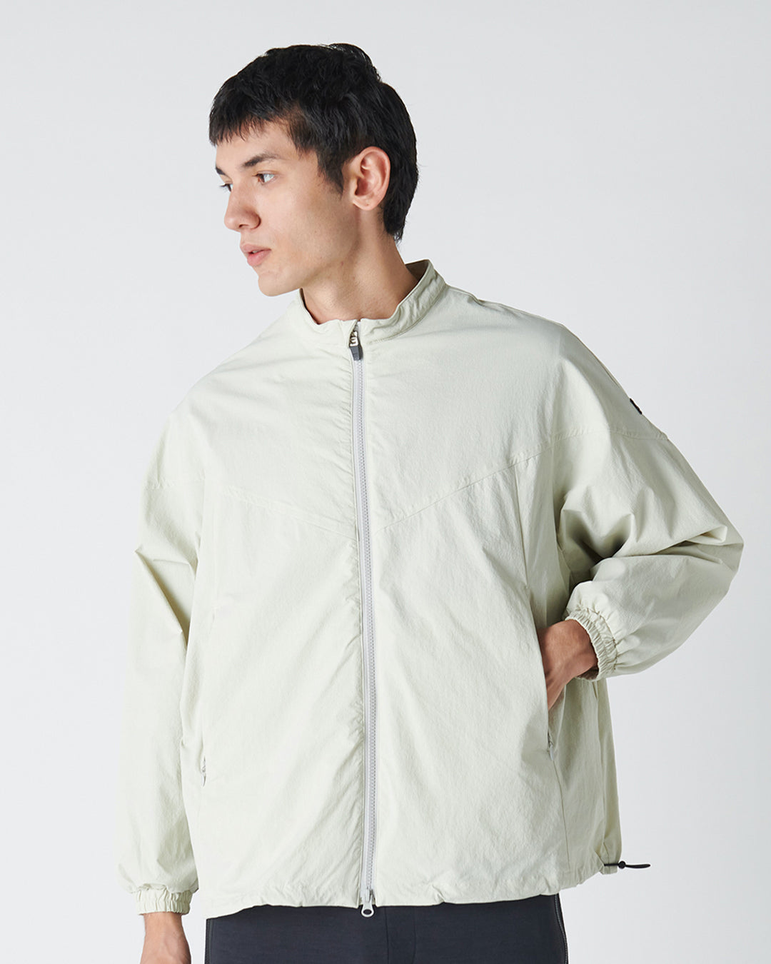 4方向に伸びる4ウェイストレッチナイロンを使用したアウターは、ゆったりとしたシルエットのユニセックスモデル。
