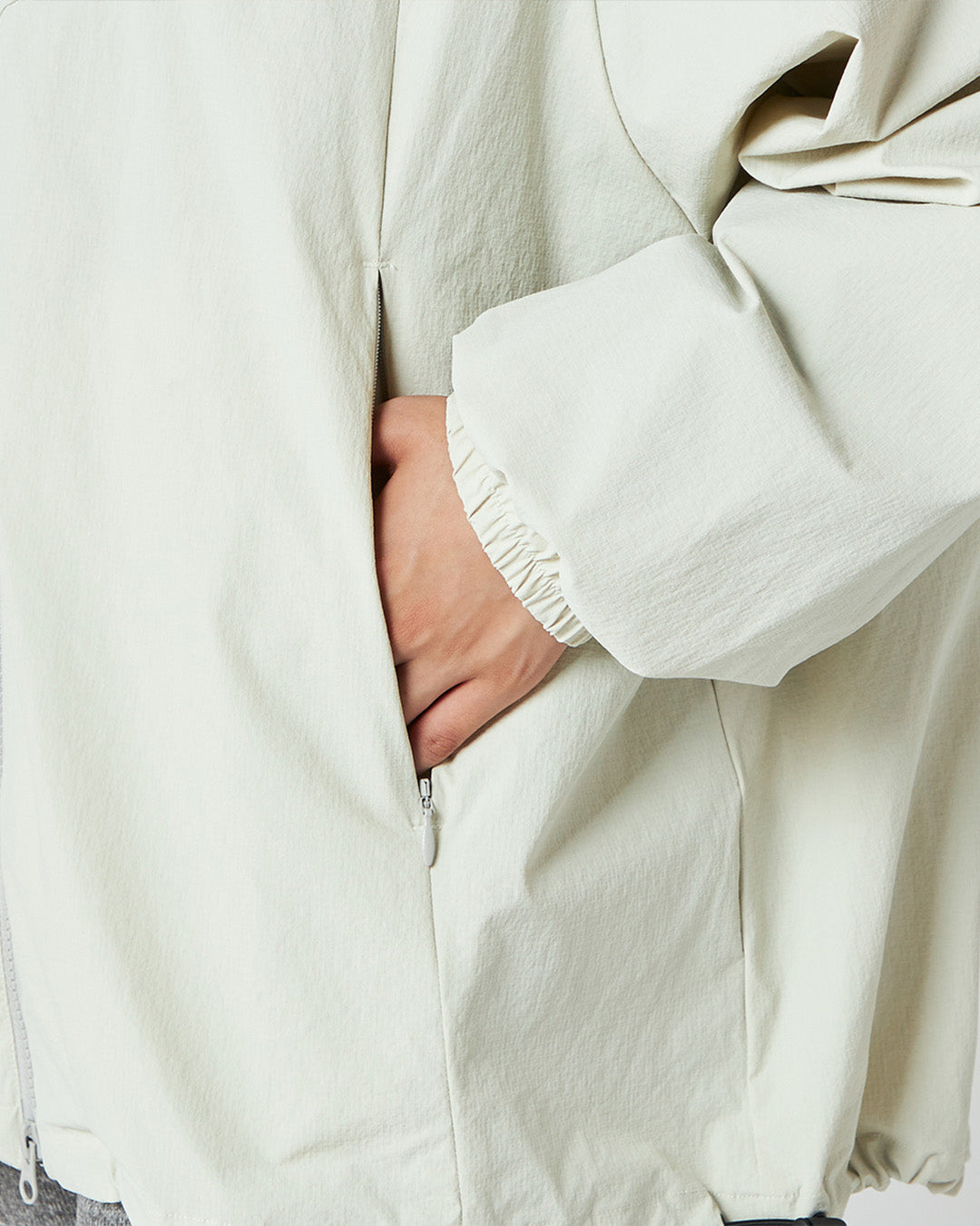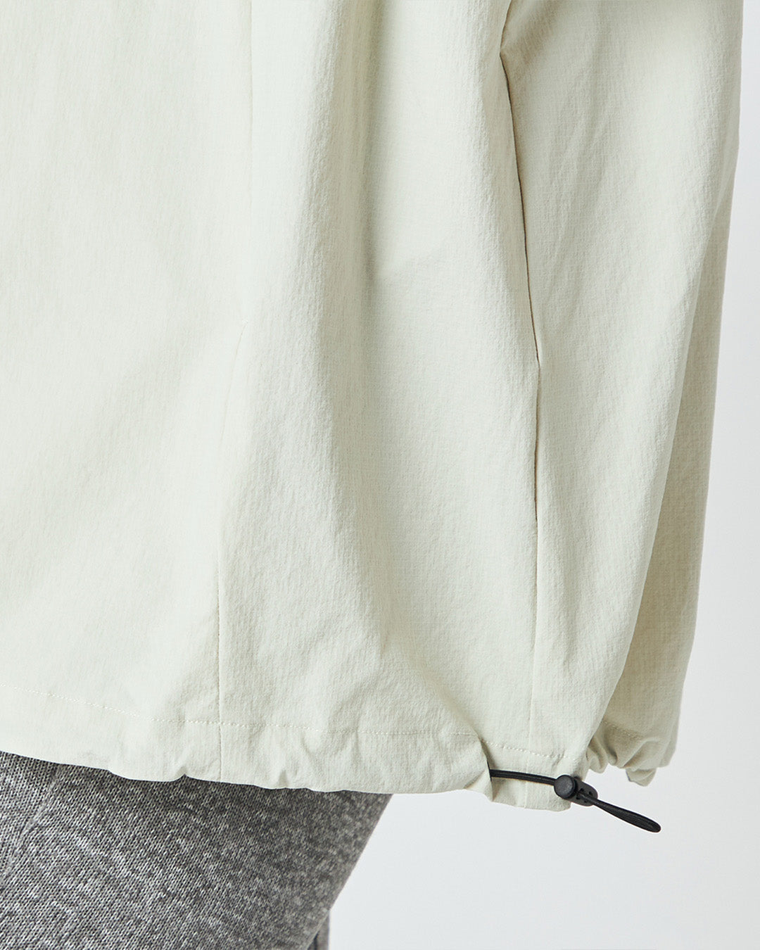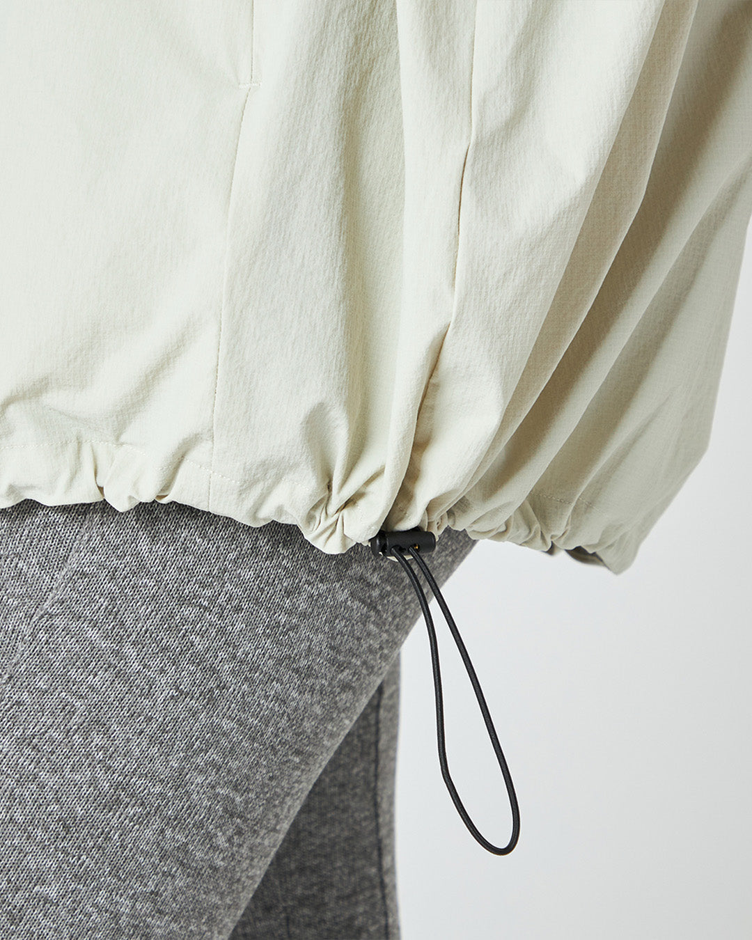 裾のドローストリングを絞ることで簡単にシルエットの調整が可能。