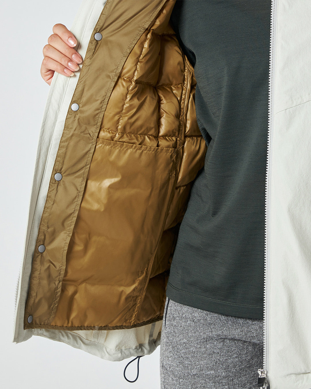 スナップボタンによりアウターとの着脱が可能なので、インナーダウンのみでの着用も可能な3WAYモデルです。(インナーダウンにはパッカブル付き。)