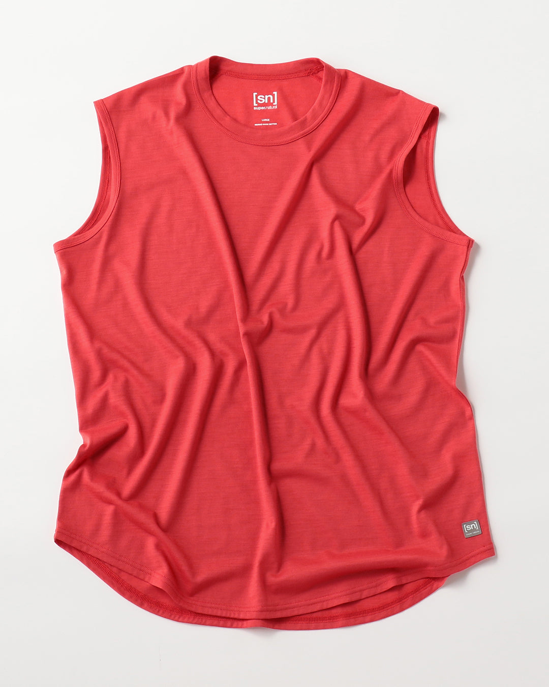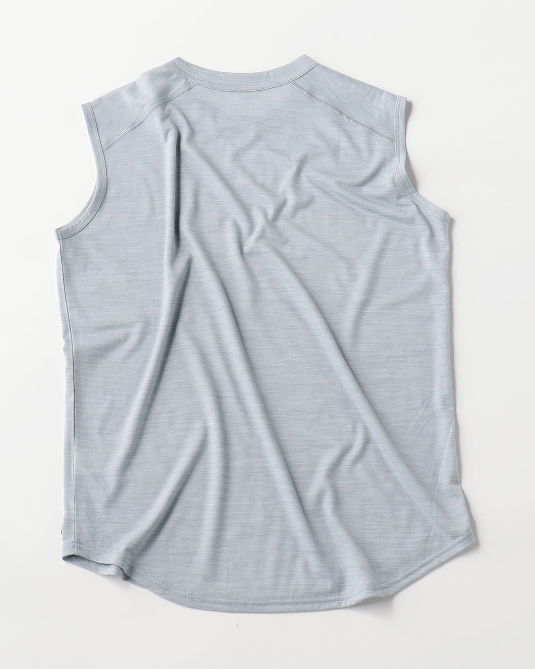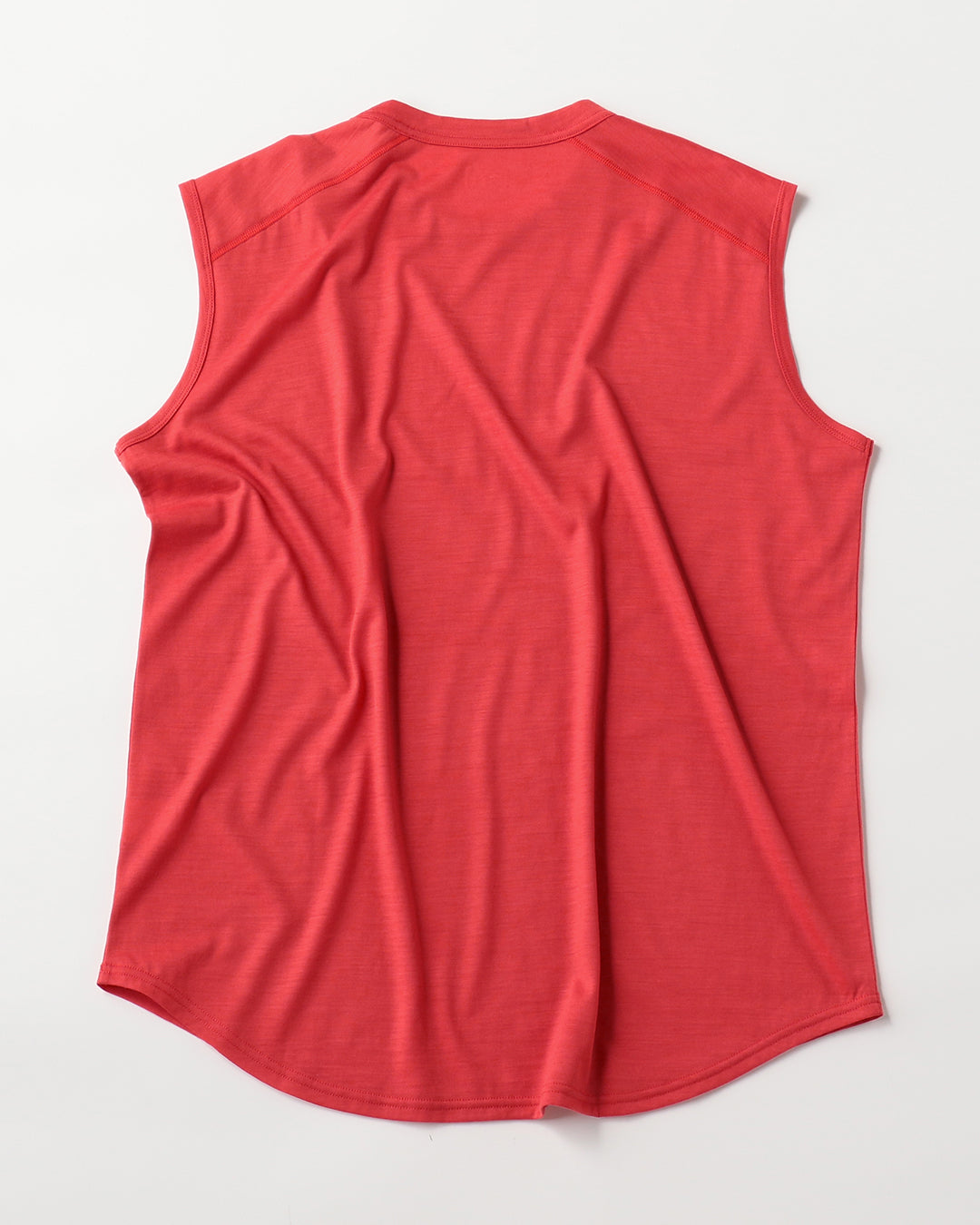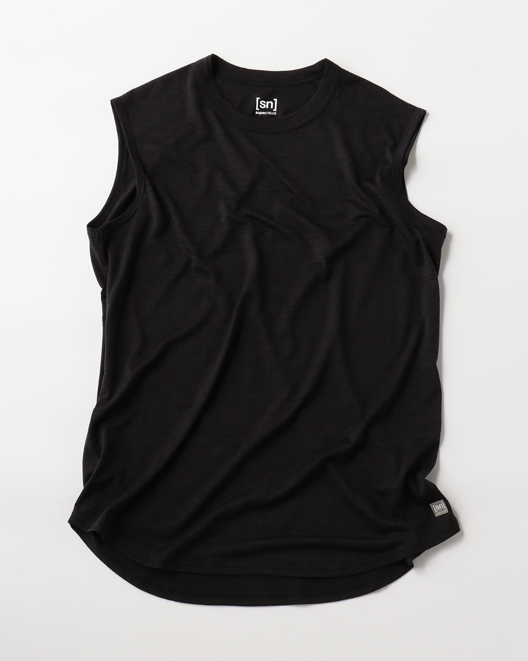 [sn]定番素材のメリノーウール50%・ポリエステル50%の混紡生地を使用したノースリーブ。普段使いから、ハードなトレーニングまで通年着用しやすいライトウェイト(140g/㎡)。