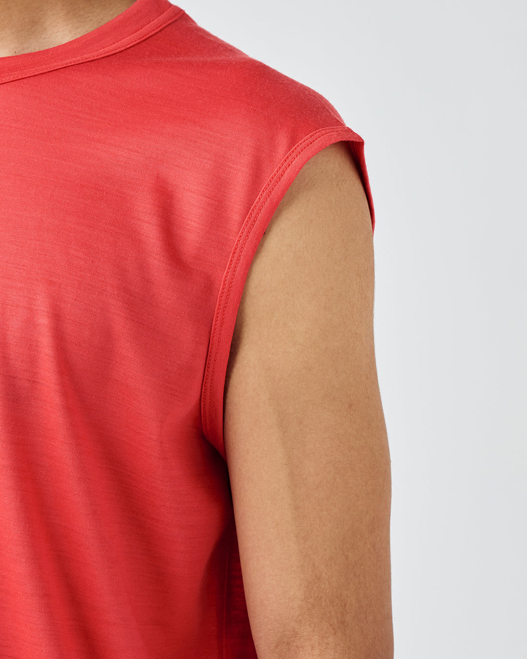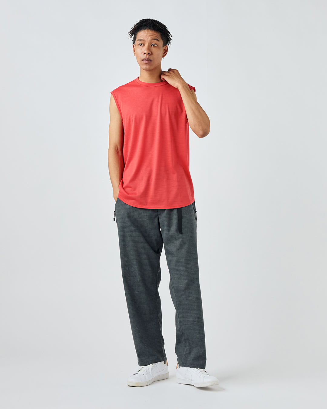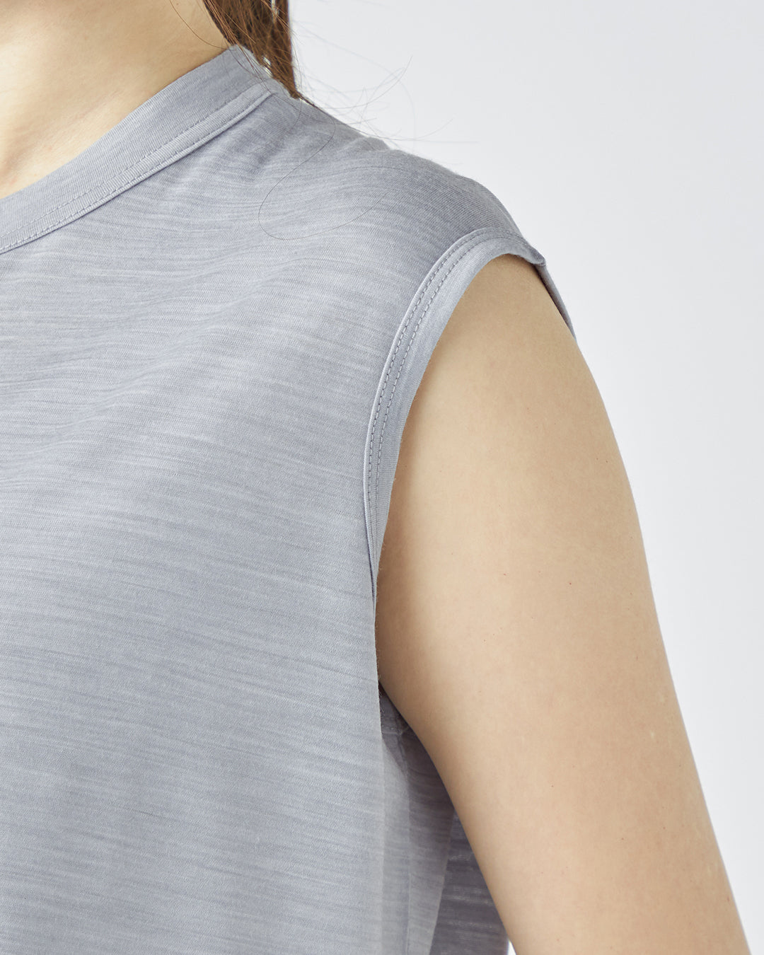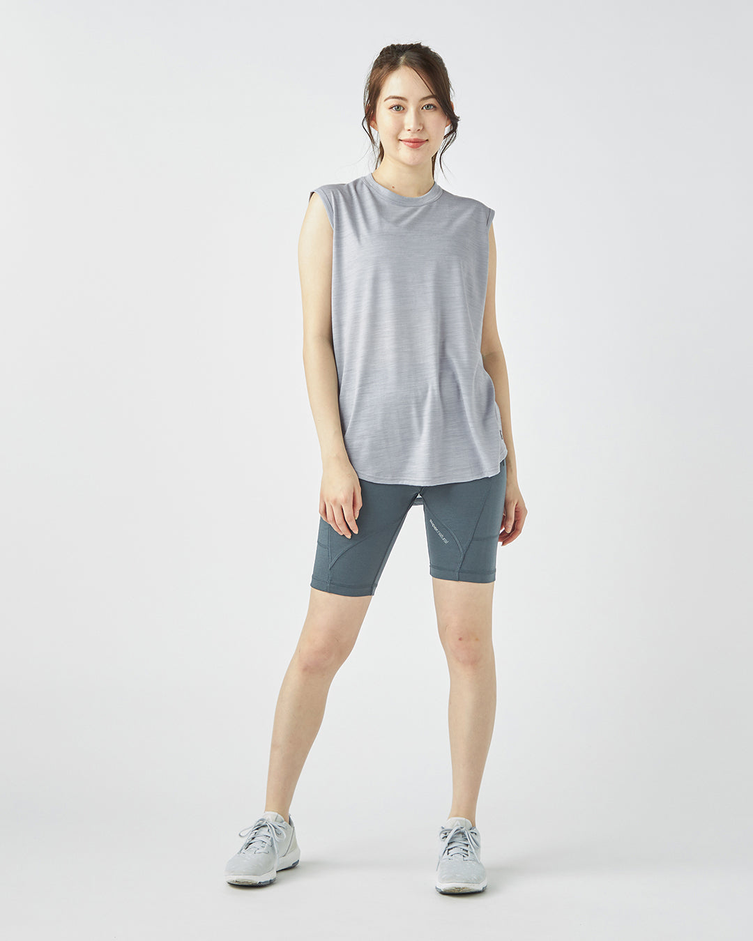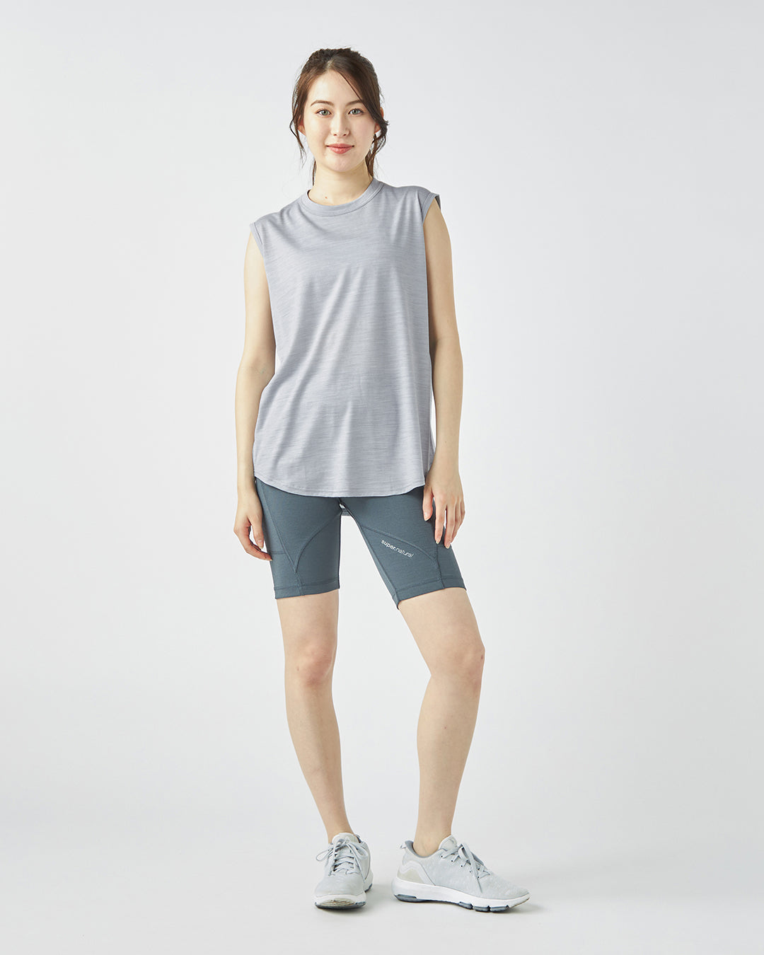 [sn]定番素材のメリノーウール50%・ポリエステル50%の混紡生地を使用したノースリーブ。普段使いから、ハードなトレーニングまで通年着用しやすいライトウェイト(140g/㎡)。