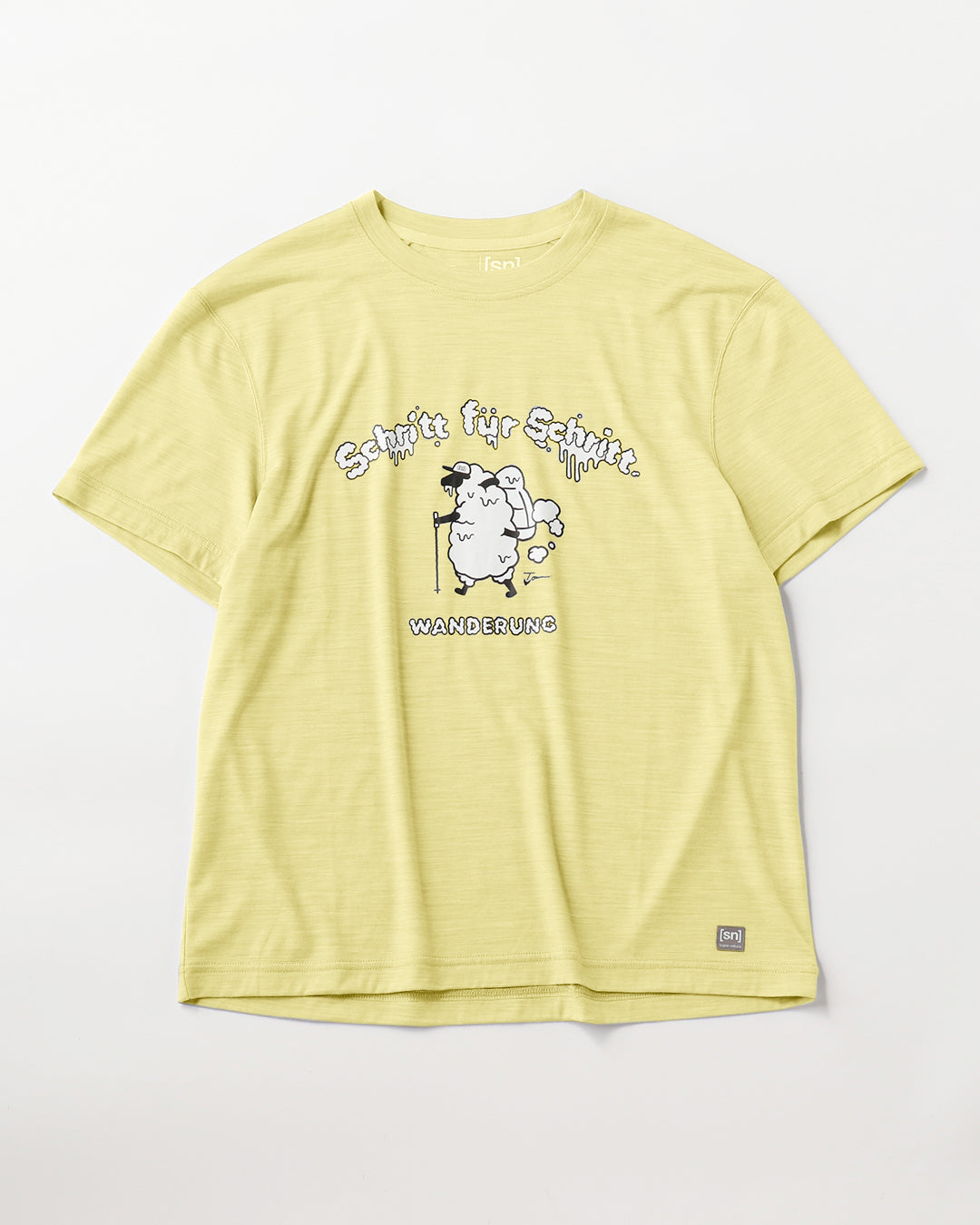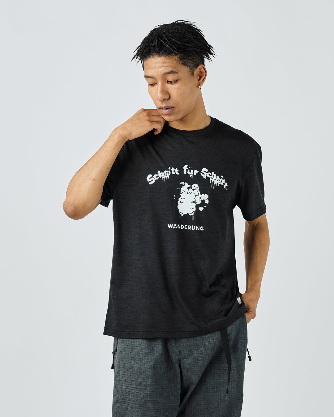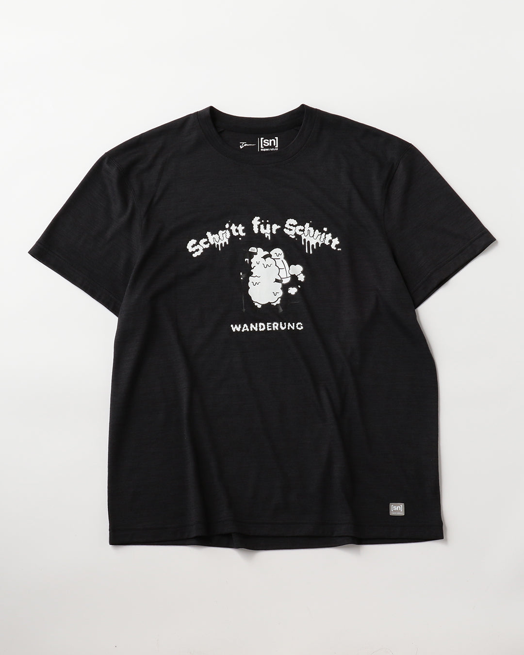 ドイツ語で『Schritt für Schritt (一歩一歩)』というメッセージを込めた、tomu×[sn]グラフィックTシャツ。