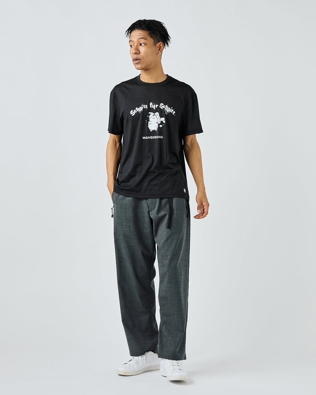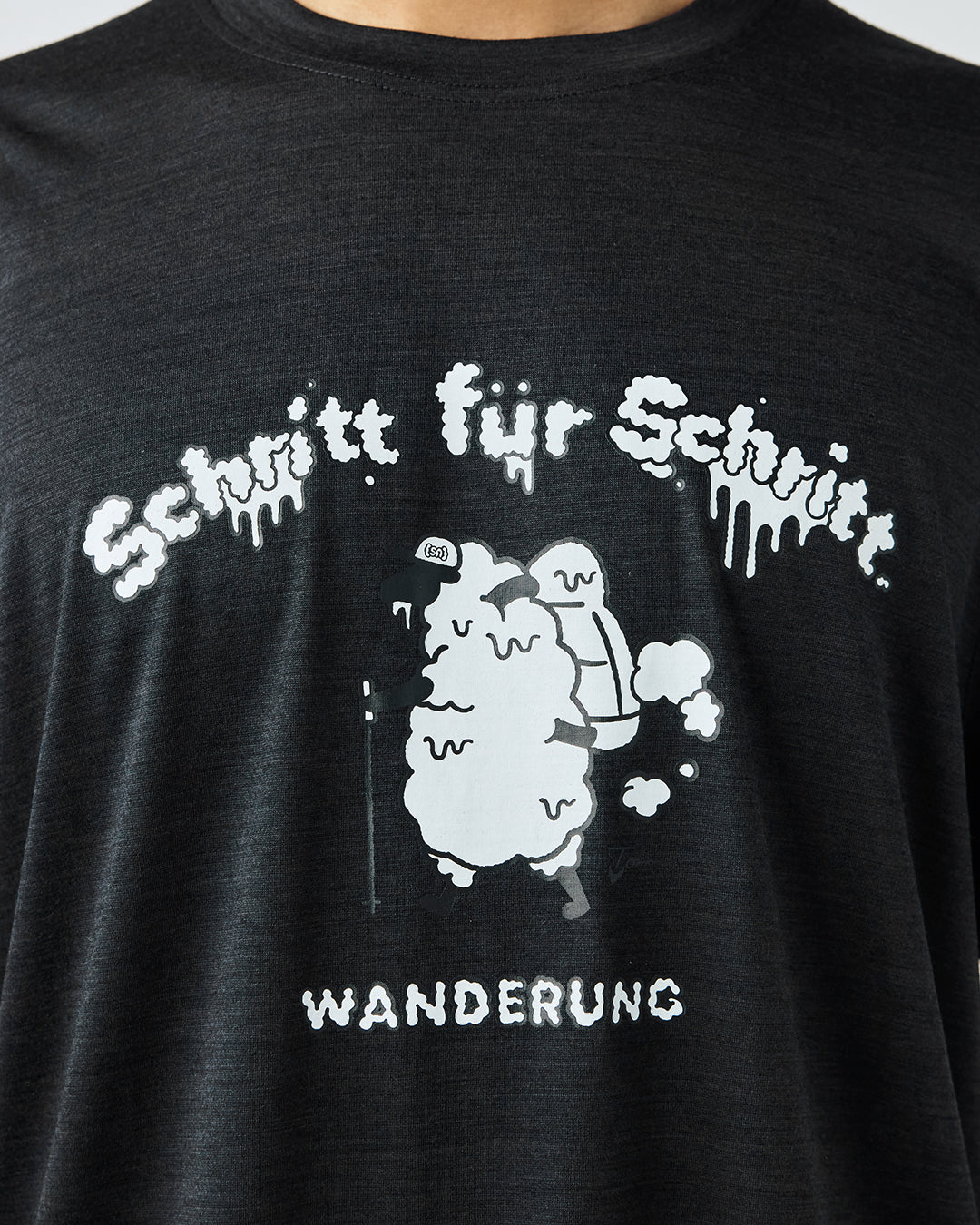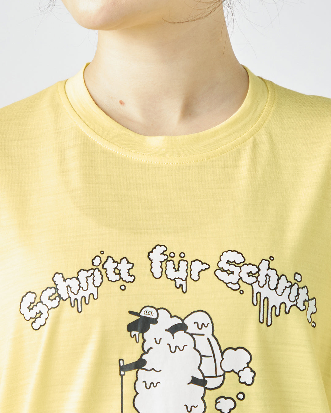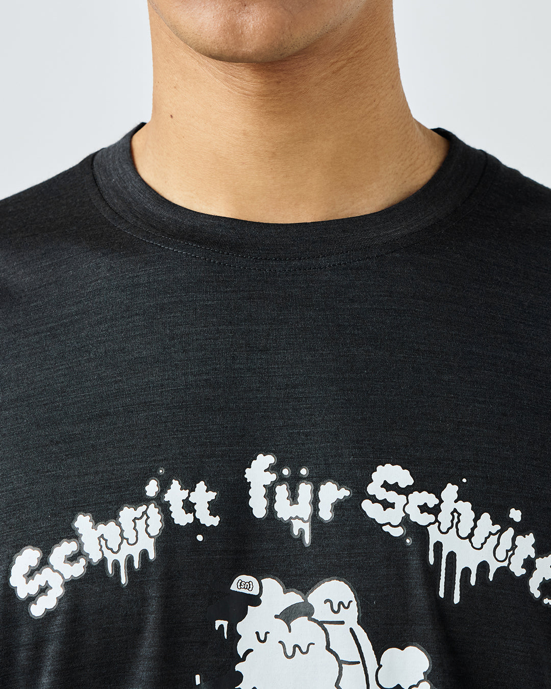 ドイツ語で『Schritt für Schritt (一歩一歩)』というメッセージを込めた、tomu×[sn]グラフィックTシャツ。