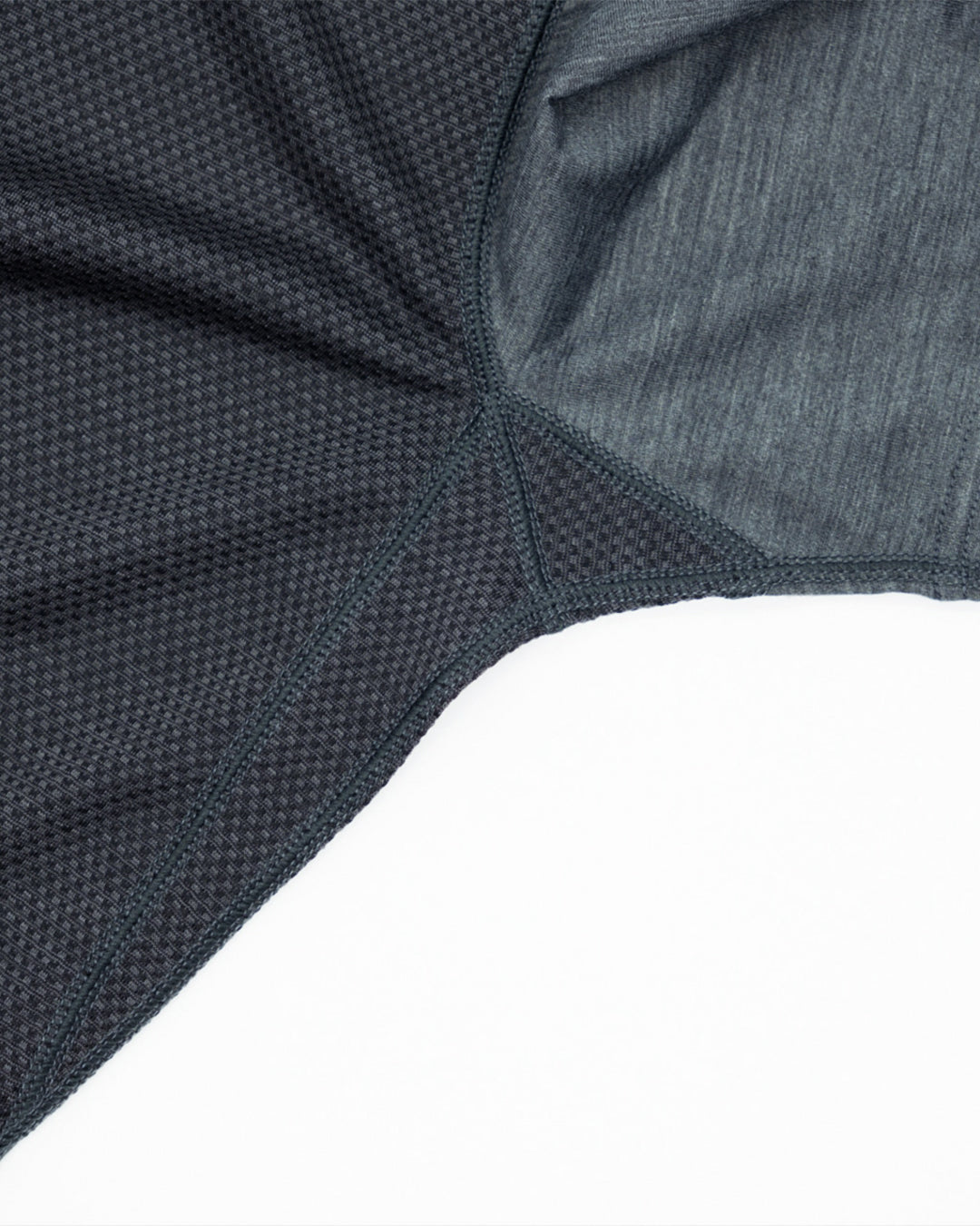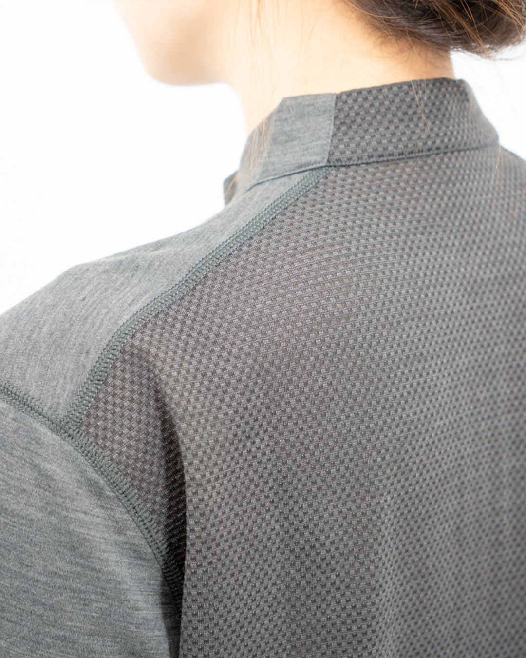 さらに、発汗量の多い背中全体と脇部分には、メリノウール50%・ポリエステル47%にポリウレタンを3%加えたメッシュ構造を採用し、優れた通気性と速乾性を実現しています。
