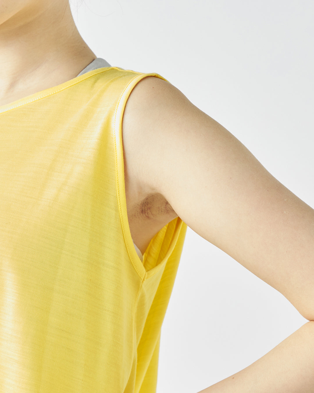 前屈などの動きにも胸元が気になりにくい開きを抑えたネックデザインや、伸ばして腰ヒップを覆う事もできる裾シャーリングデザインなど、細かな箇所にもこだわりました。