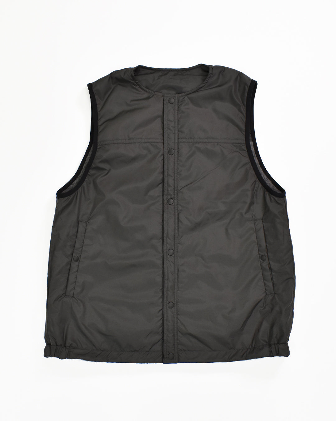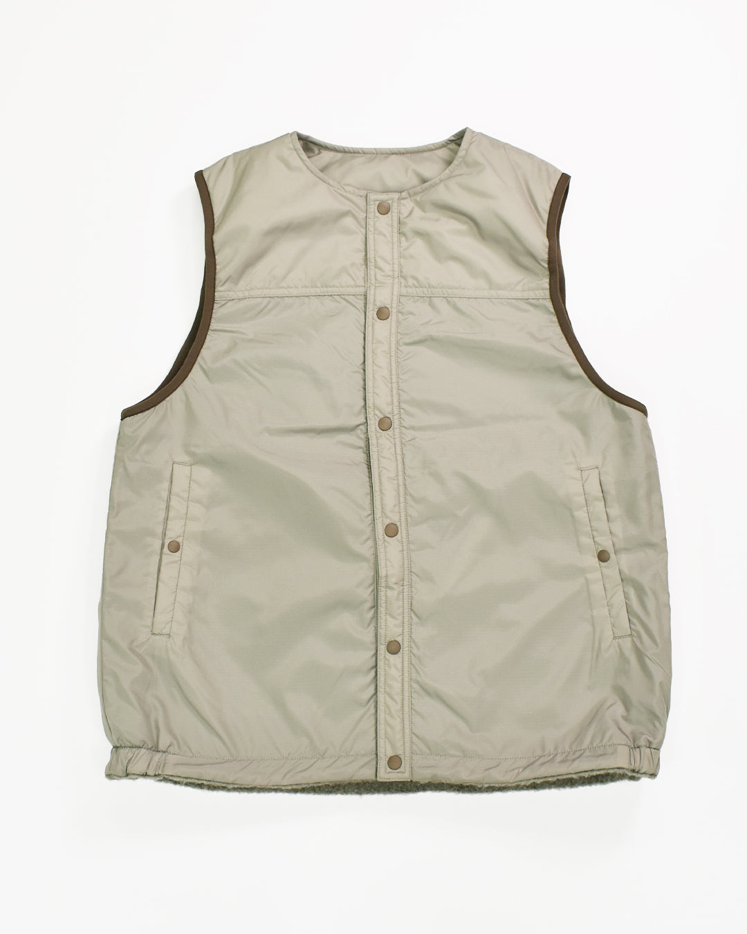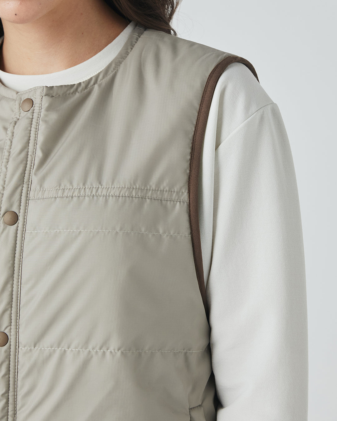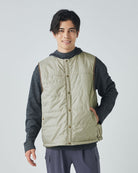 ユニセックスのベストは、リバーシブルモデル。裏面は全面ポリエステルリップストップで雰囲気がガラリと変わり、両面主役で愛用いただけるデザインです。