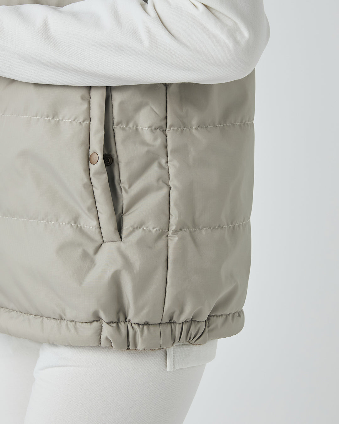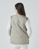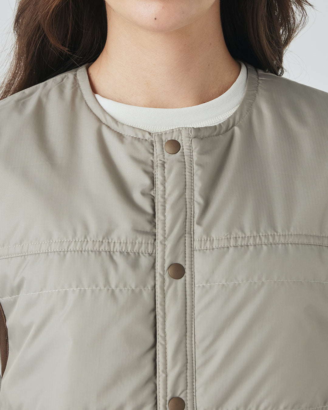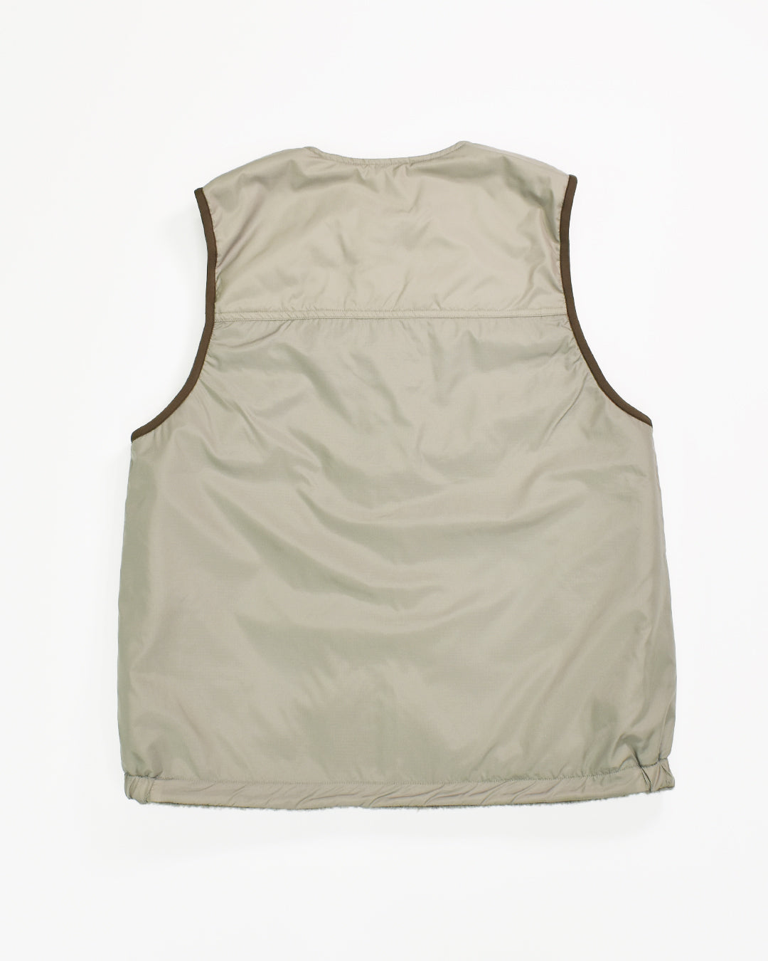 ユニセックスのベストは、リバーシブルモデル。裏面は全面ポリエステルリップストップで雰囲気がガラリと変わり、両面主役で愛用いただけるデザインです。