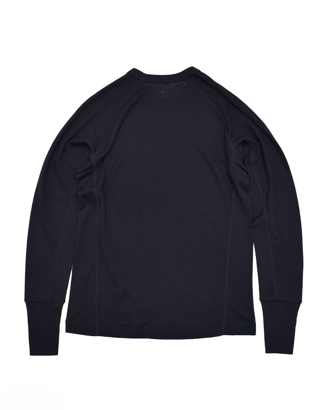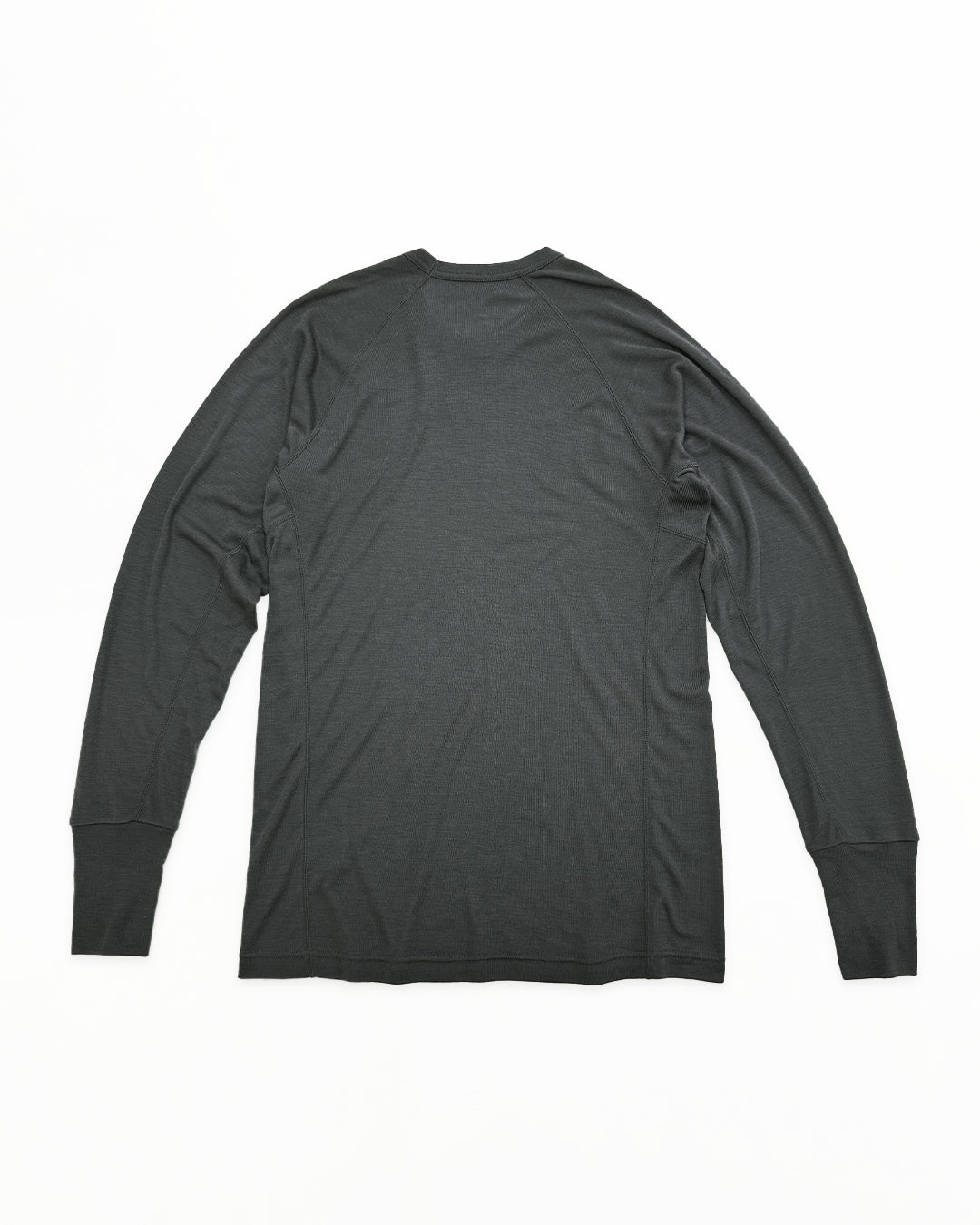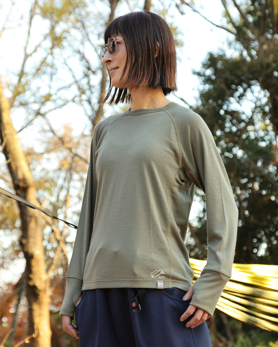 また、オーストラリア メリノウール50%とポリエステル50%を掛け合わせたこだわりの生地の厚みは195g/㎡。保温性や吸湿速乾性のバランスが良い生地は秋冬春のベースレイヤーに重宝いたします。