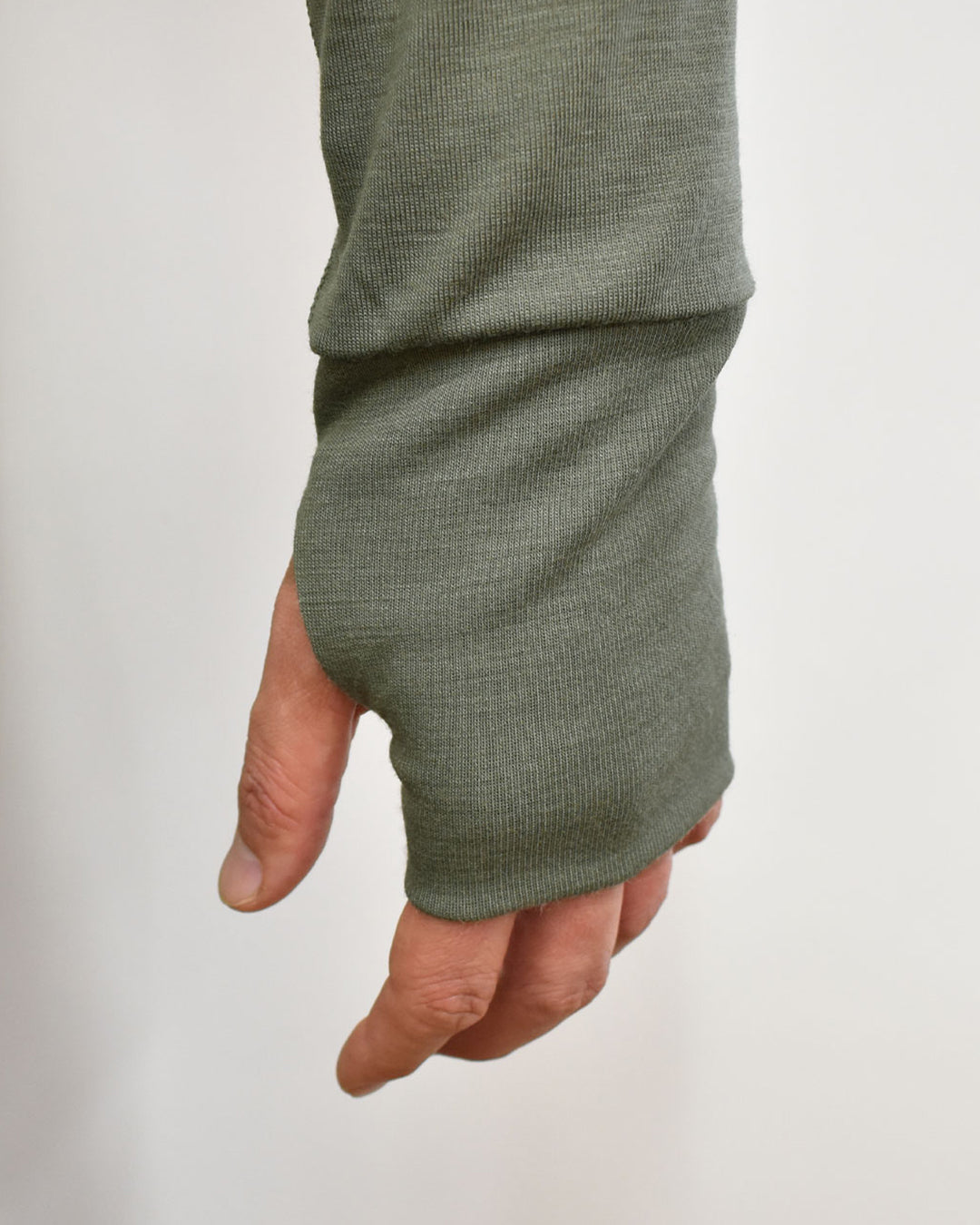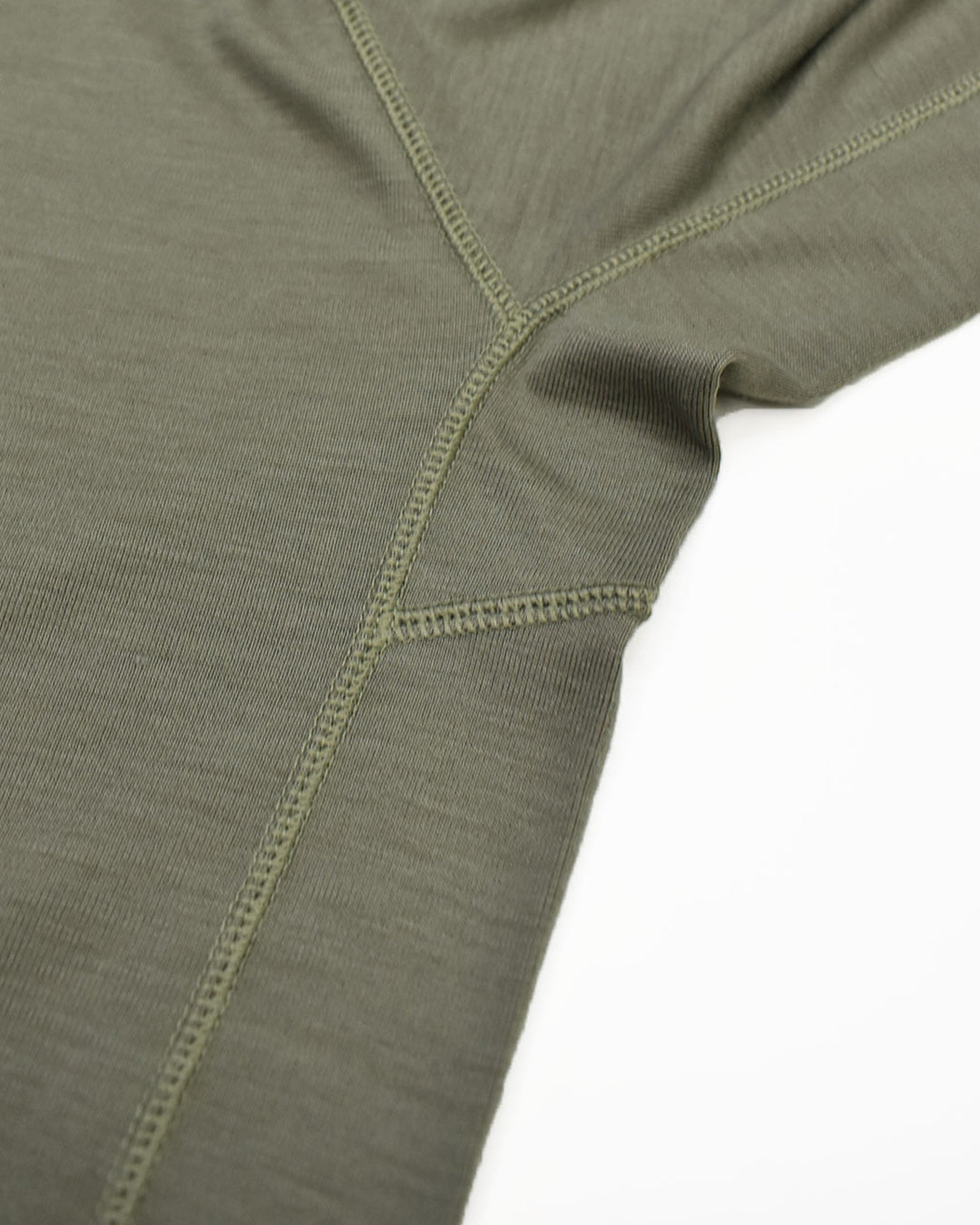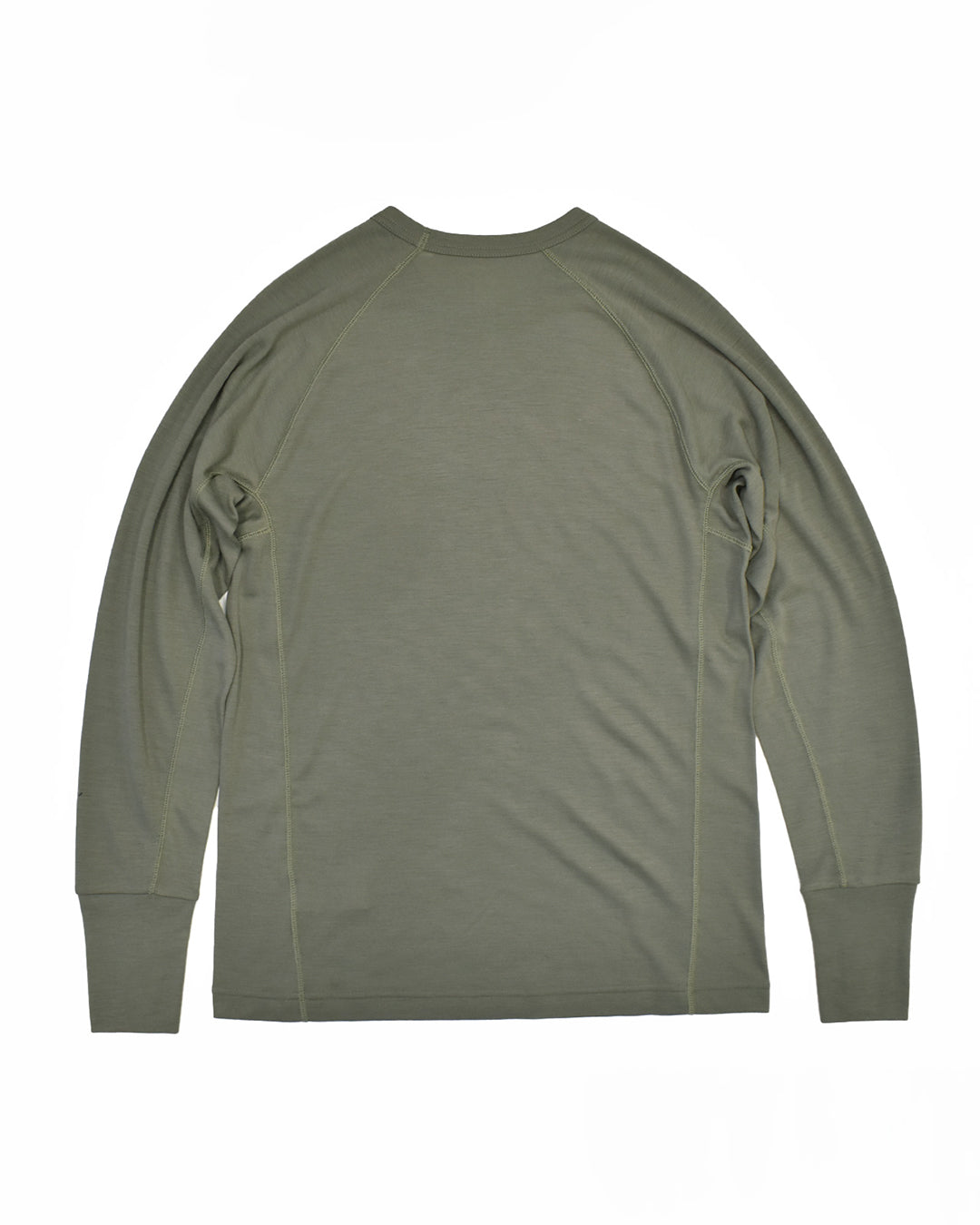 また、オーストラリア メリノウール50%とポリエステル50%を掛け合わせたこだわりの生地の厚みは195g/㎡。保温性や吸湿速乾性のバランスが良い生地は秋冬春のベースレイヤーに重宝いたします。