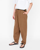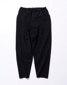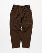 ウェビングベルトを表に出した独特のデザイン、極太のシルエットのパンツに、サイドからヒップにかけての大きなポケットを採用。