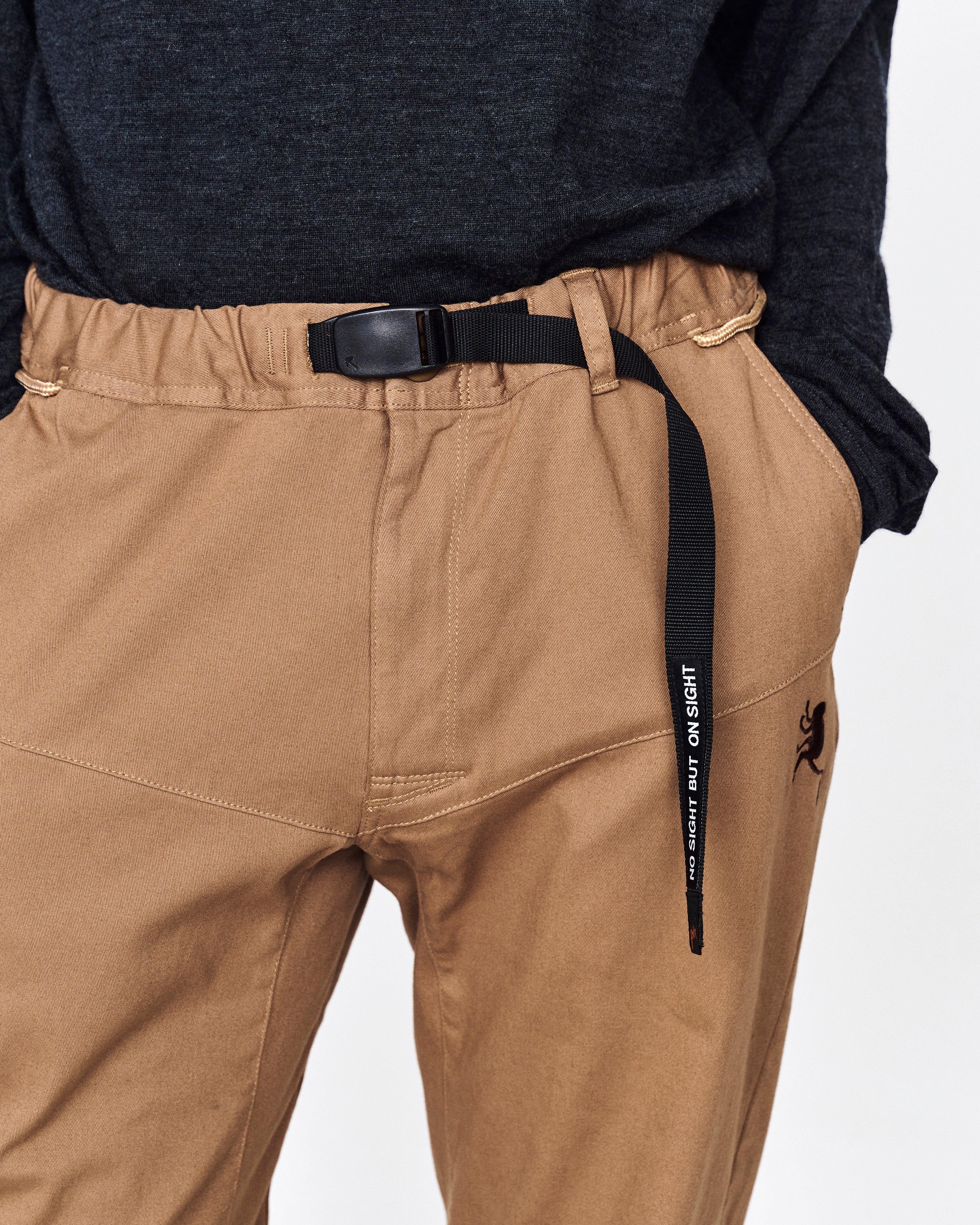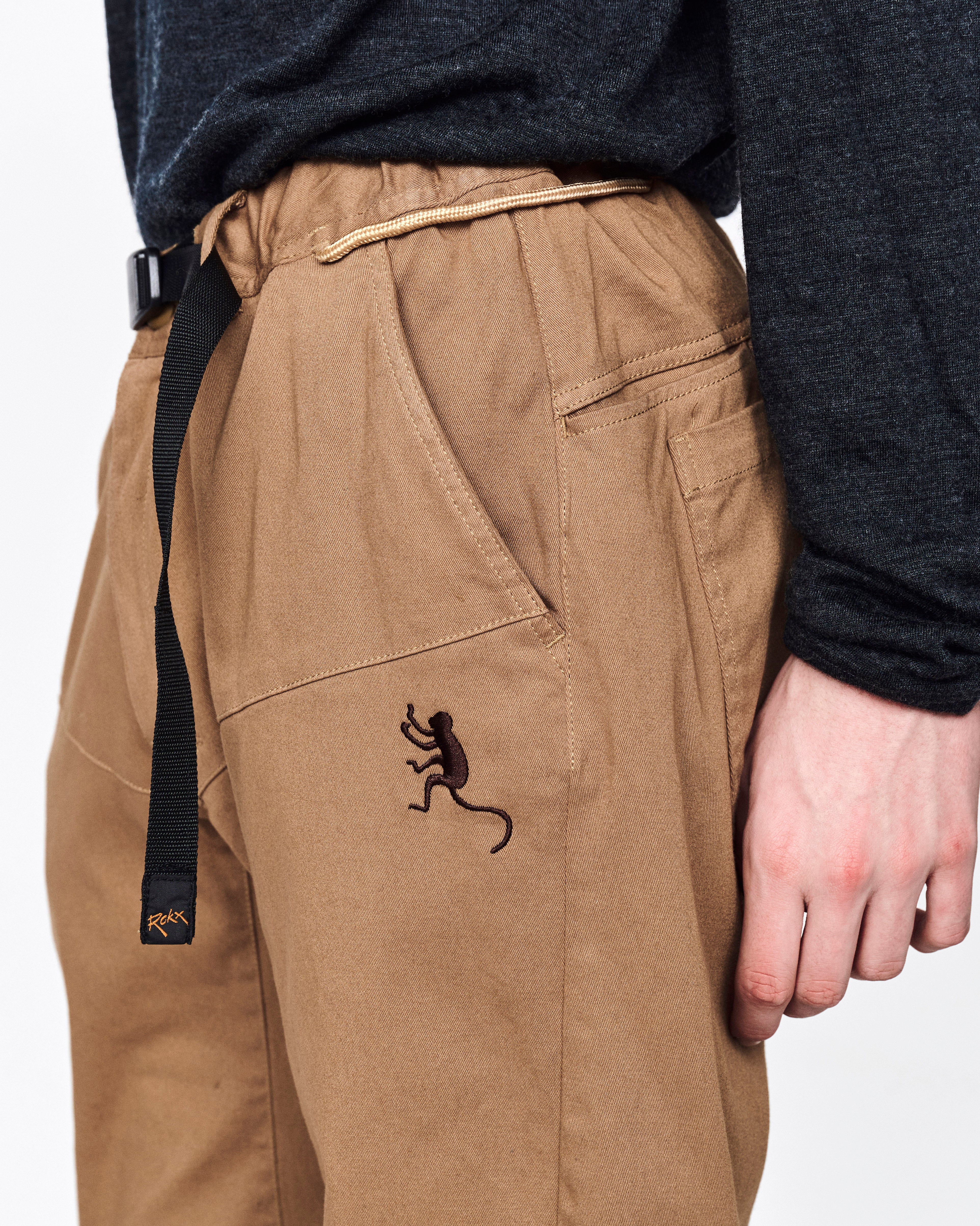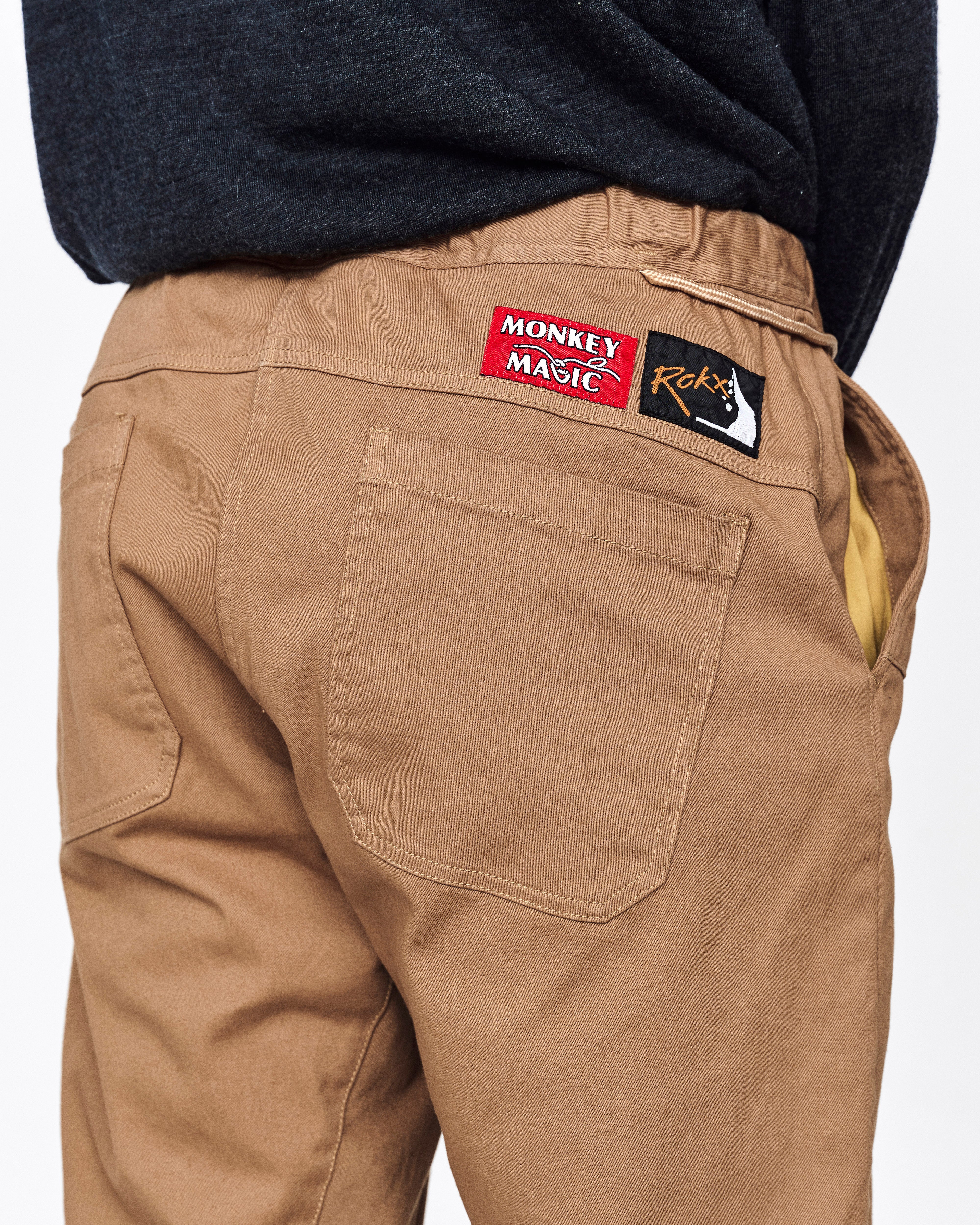 左太もも部分にはモンキーマジックロゴを刺繍、バックポケットにはROKXとモンキーマジックの両ロゴを縫い付け。ベルトにはモンキーマジックのタグライン「No Sight But On Sight! (見えなくても、一回で登り切れる!)」を印字。