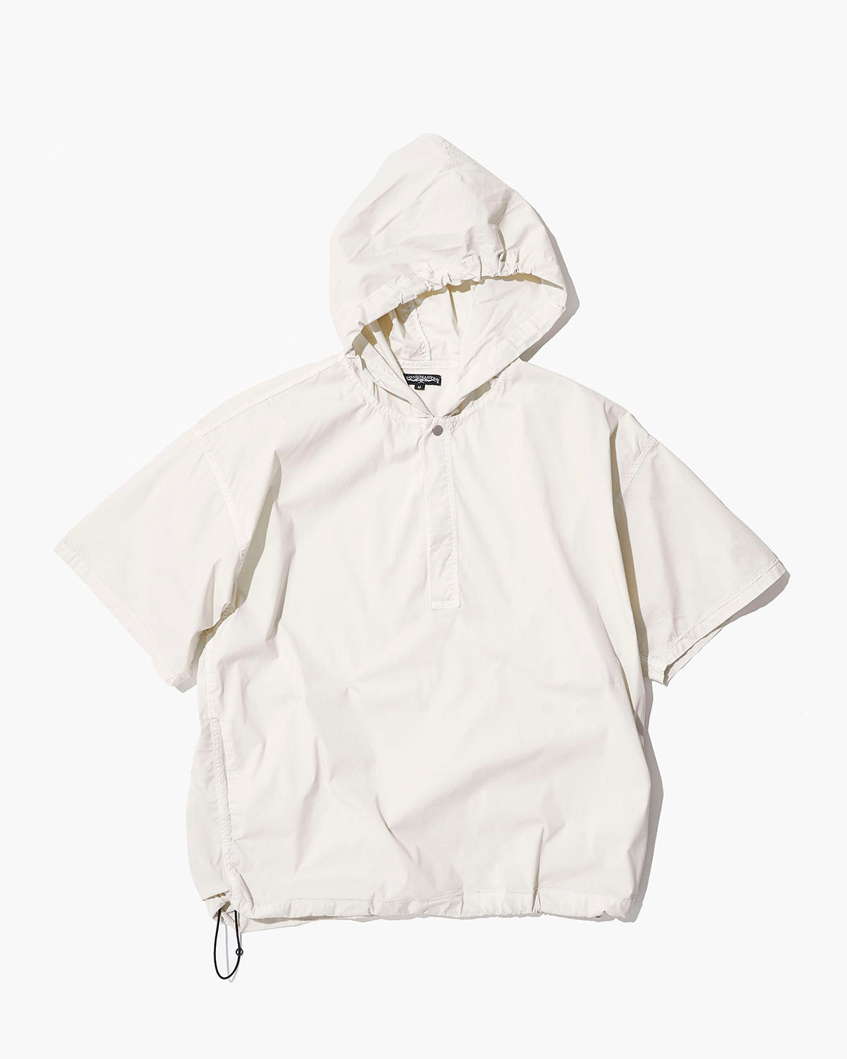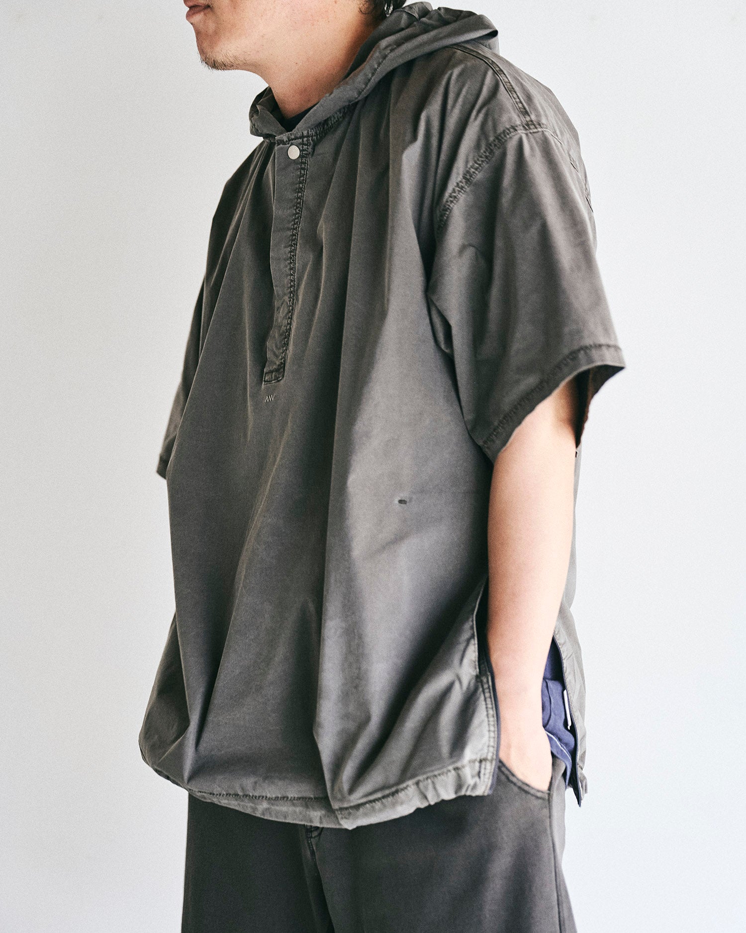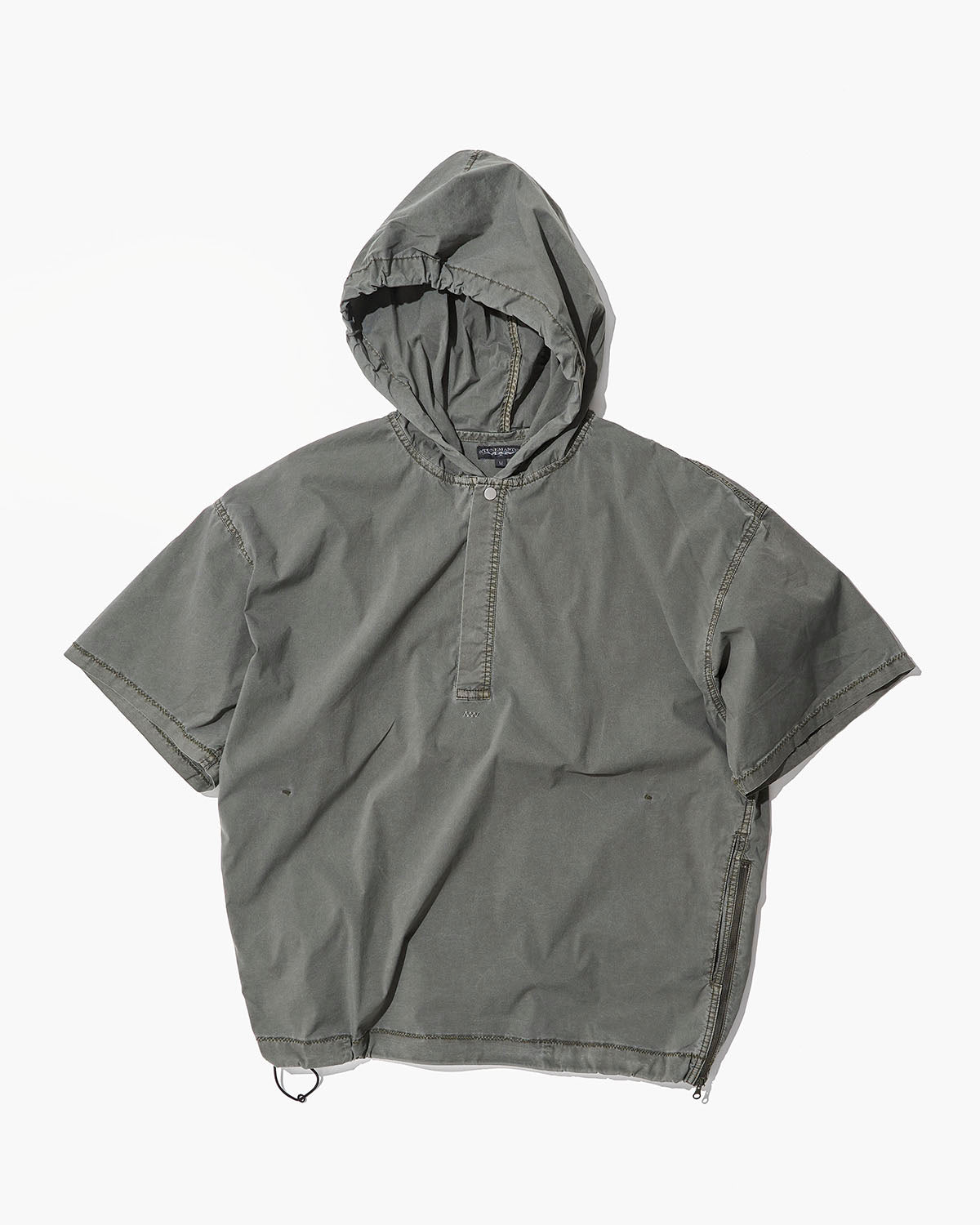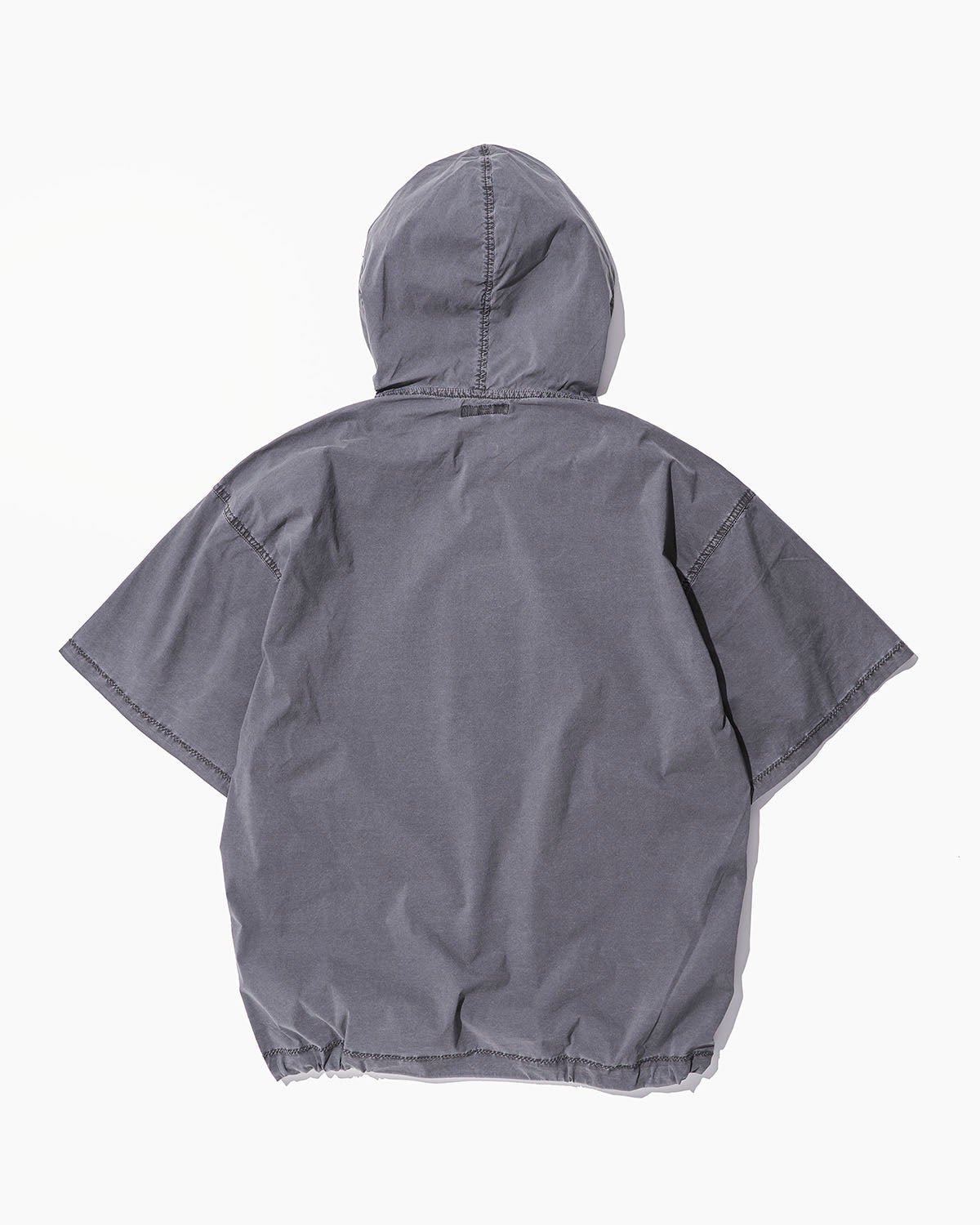 ショートスリーブのフーディージャケット。フロントジッパーポケット、裾にドローコードも配備。生地のストレッチ性とアノラックタイプのためサイドジッパーを設け脱ぎ着にストレスなく、ナイロンの持つ強度性と速乾性、そしてコットンの持つ風合いをミックスし、製品染めで仕上げております。薄くて軽量なパッカブル仕様。速乾性にも大変優れており、旅先でも重宝します。