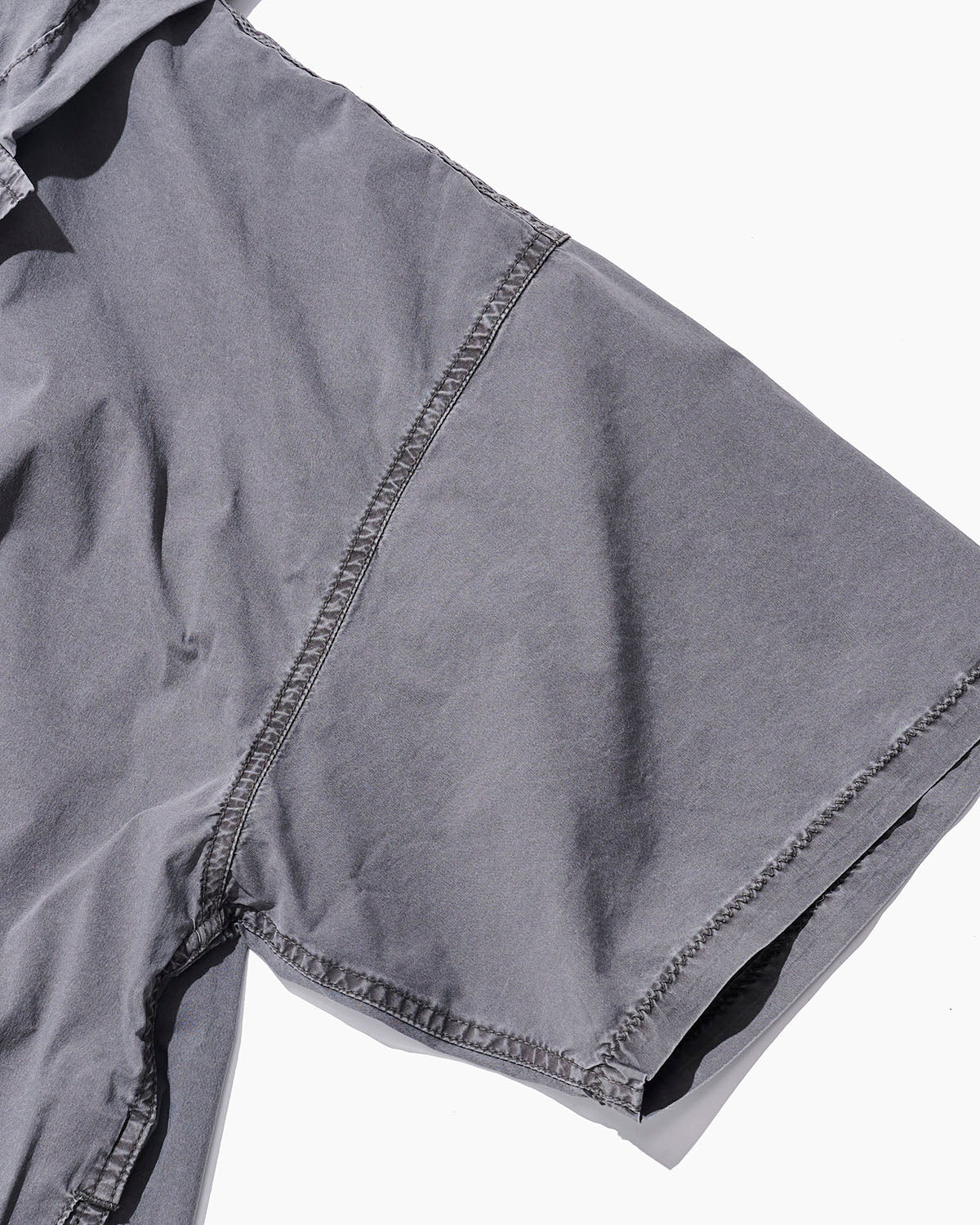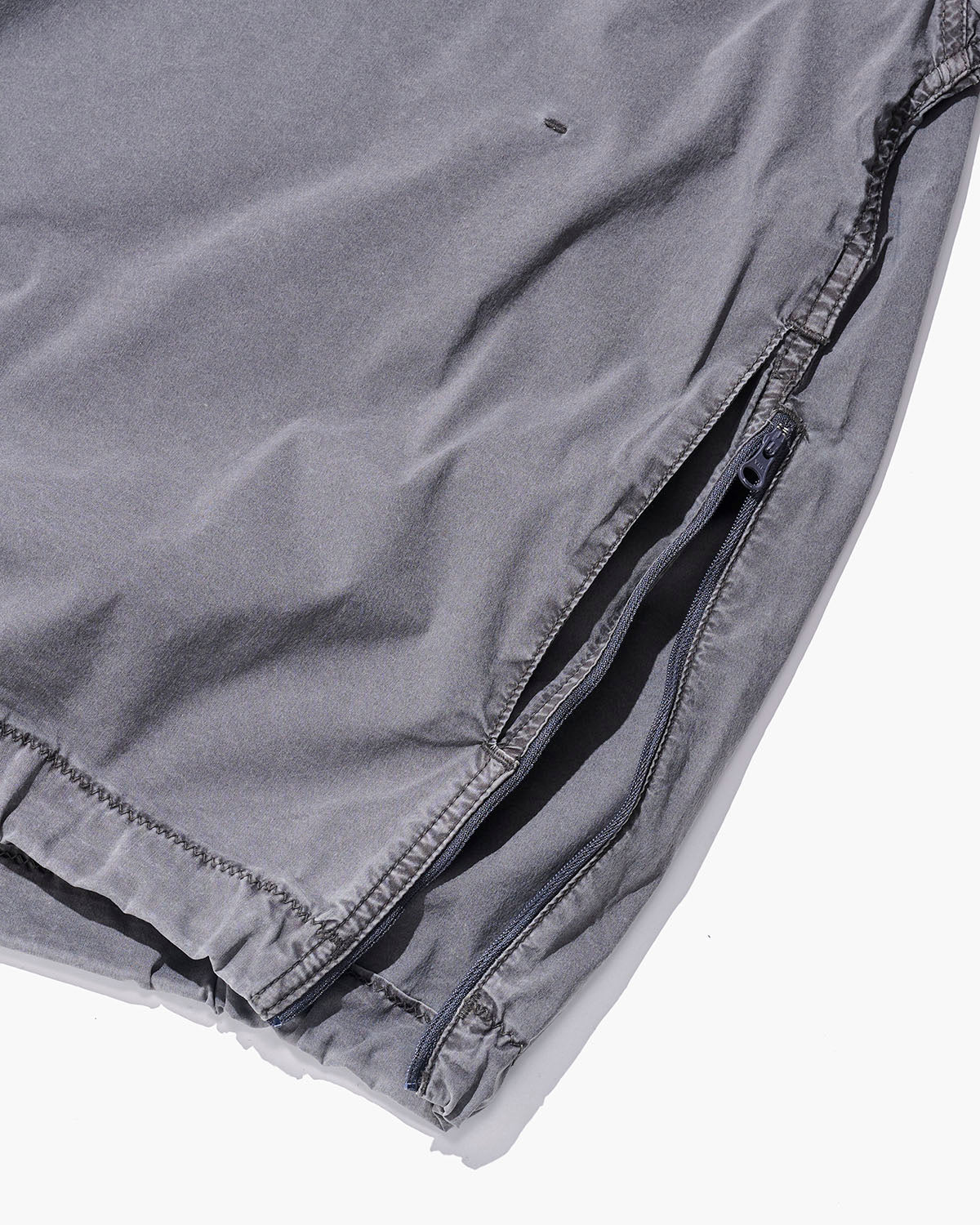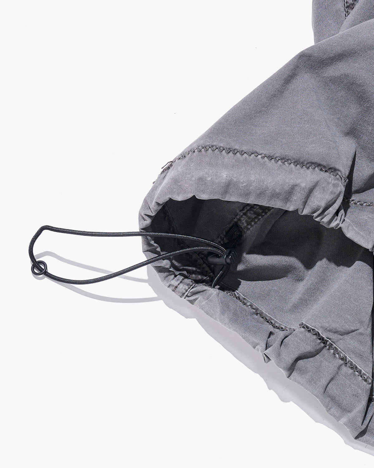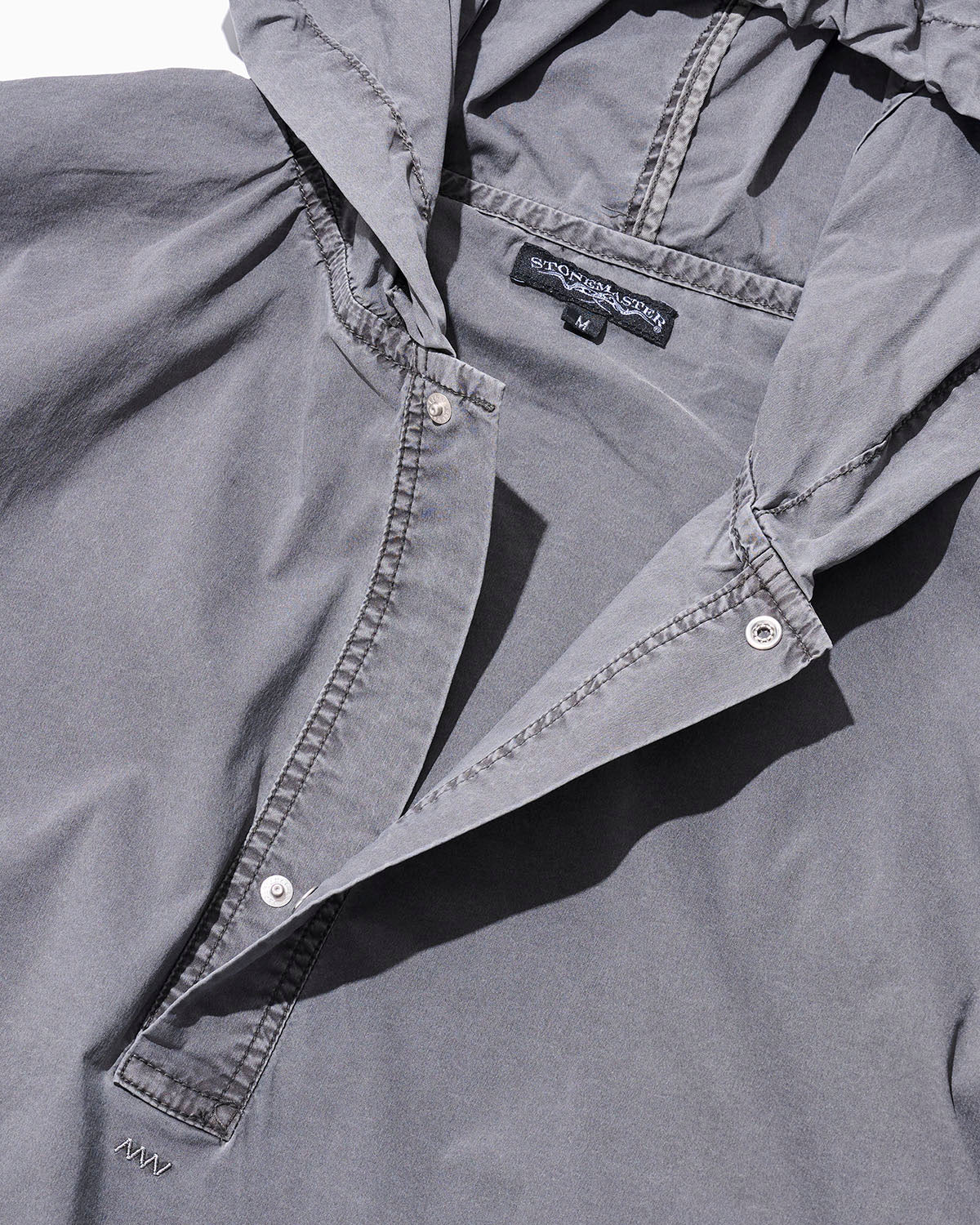 ショートスリーブのフーディージャケット。フロントジッパーポケット、裾にドローコードも配備。生地のストレッチ性とアノラックタイプのためサイドジッパーを設け脱ぎ着にストレスなく、ナイロンの持つ強度性と速乾性、そしてコットンの持つ風合いをミックスし、製品染めで仕上げております。薄くて軽量なパッカブル仕様。速乾性にも大変優れており、旅先でも重宝します。
