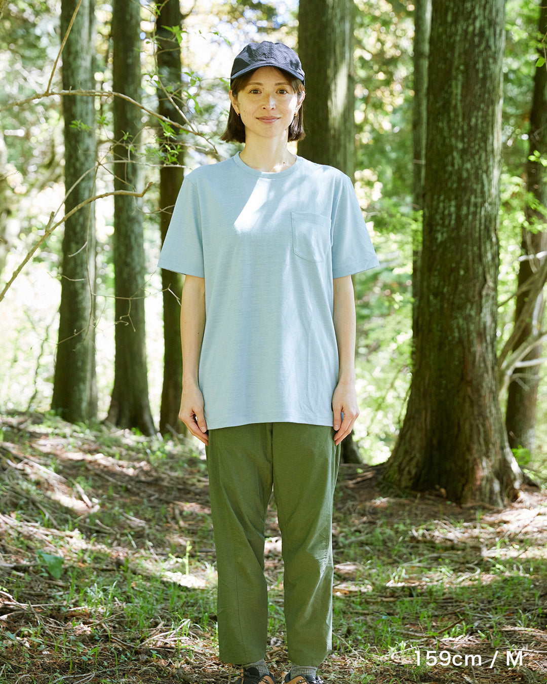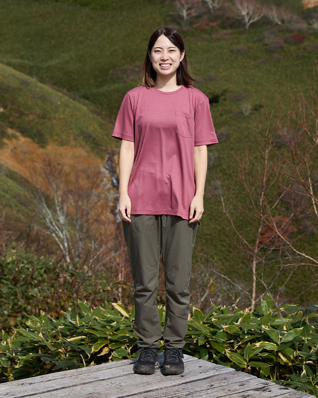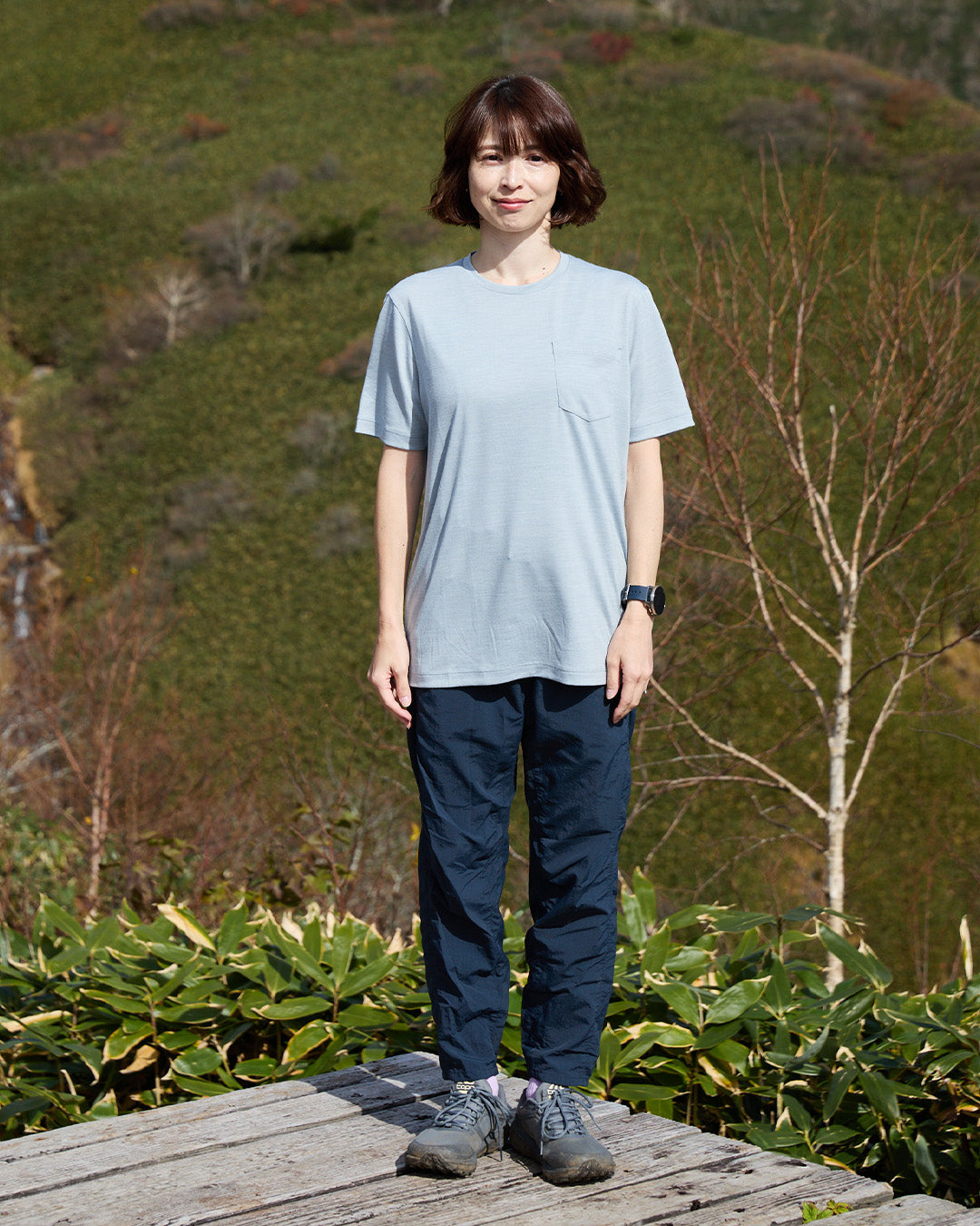 特にこだわった素材は、ポリエステルとメリノウールの強みのバランスが取れた「メリノウール×ポリエステル混紡」を採用。ポリエステルの一部をリサイクル素材を使用した、環境に配慮した素材です。生地の厚みは170と、少し厚みを持たせて透けにくくしています。