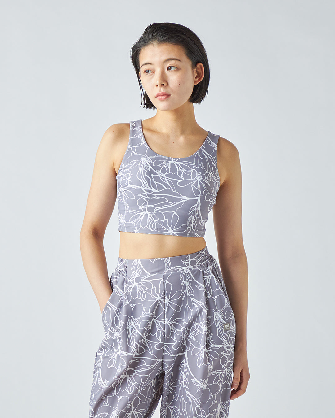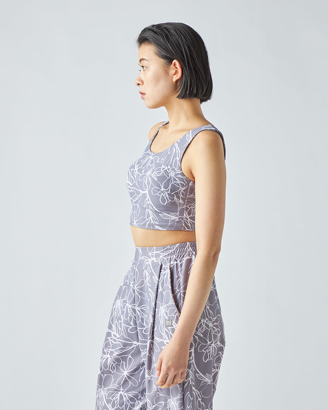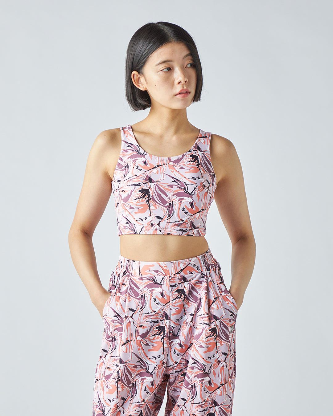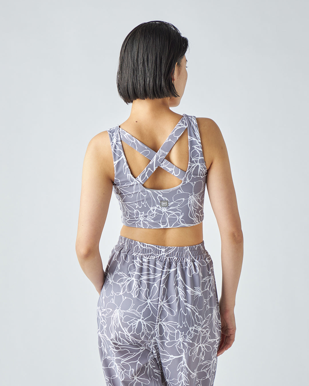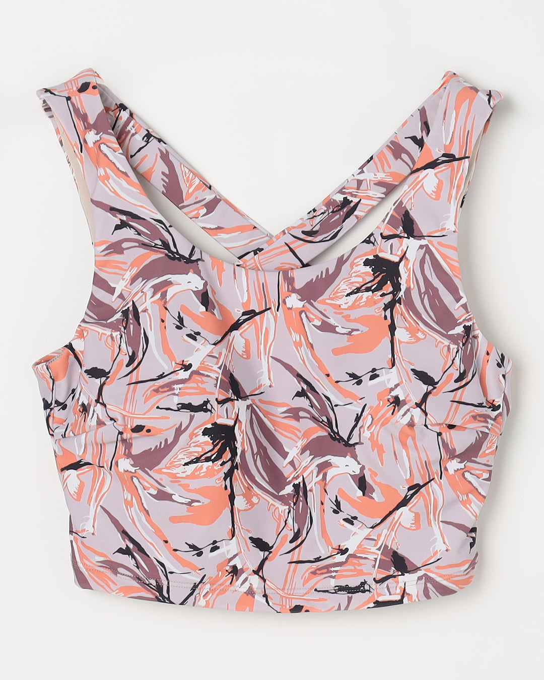 繊細な総柄プリントと、機能的なバックスタイルが目を引くブラトップです。